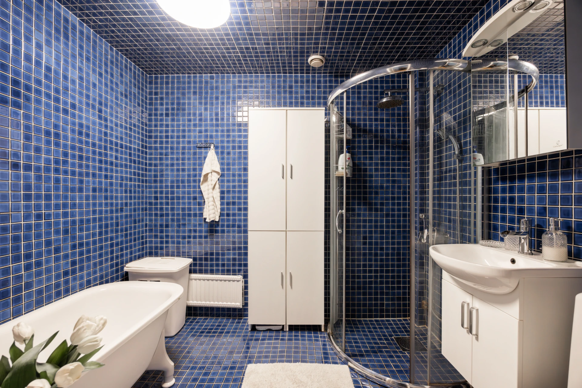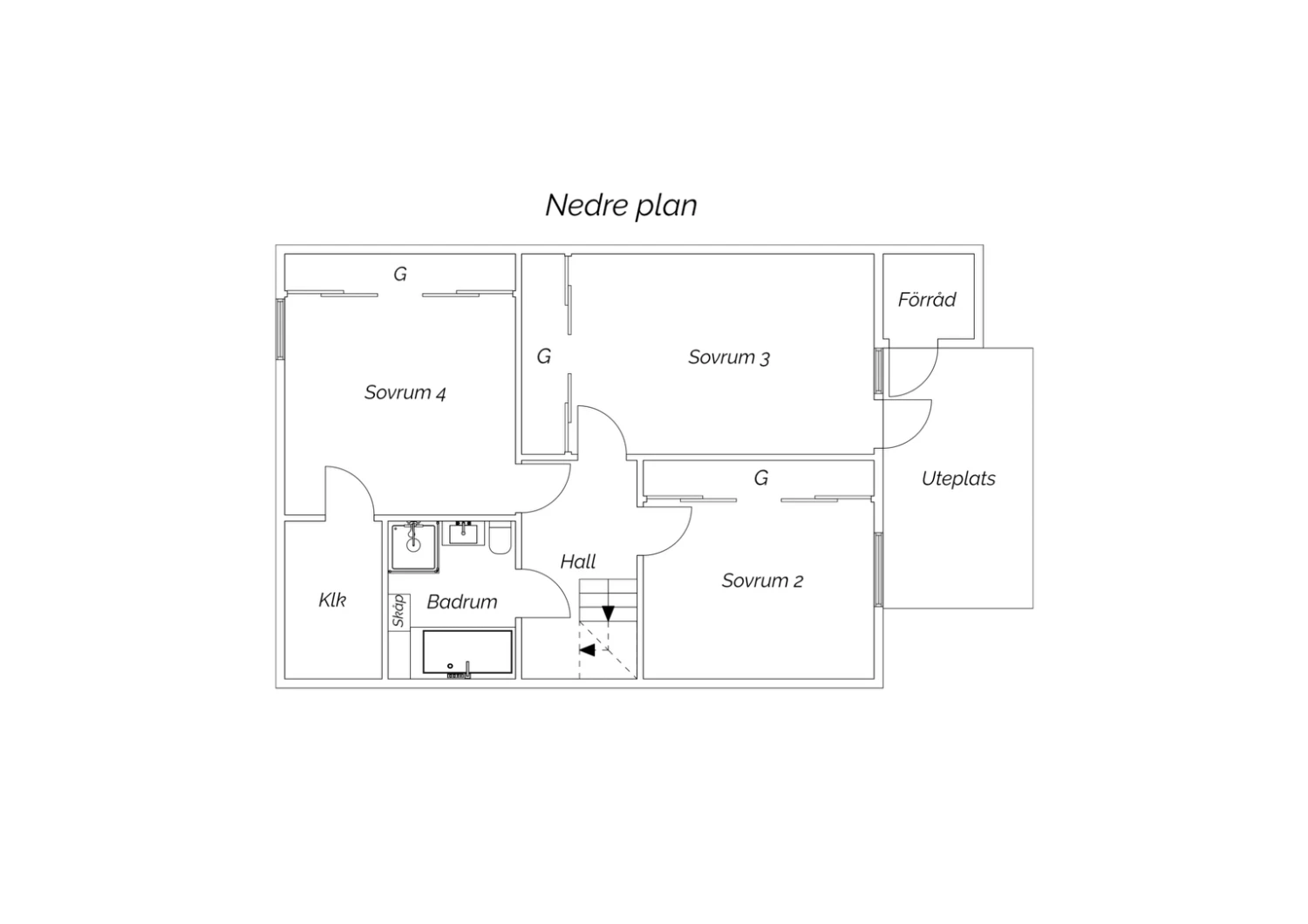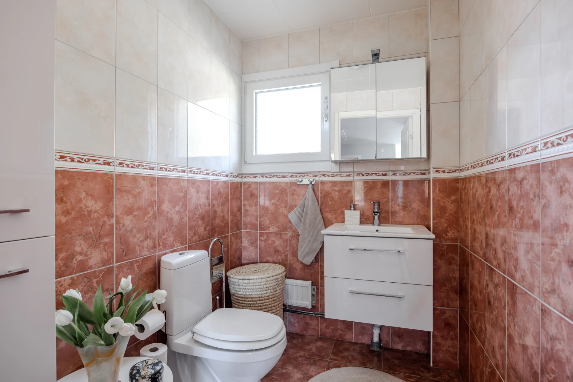 Klinkergolv och väggar. Badrummet är utrustat med WC, handfat med kommod, spegel med belysning, handdukstork, dusch med vikbara glasdörrar, tvättmaskin samt torktumlare.