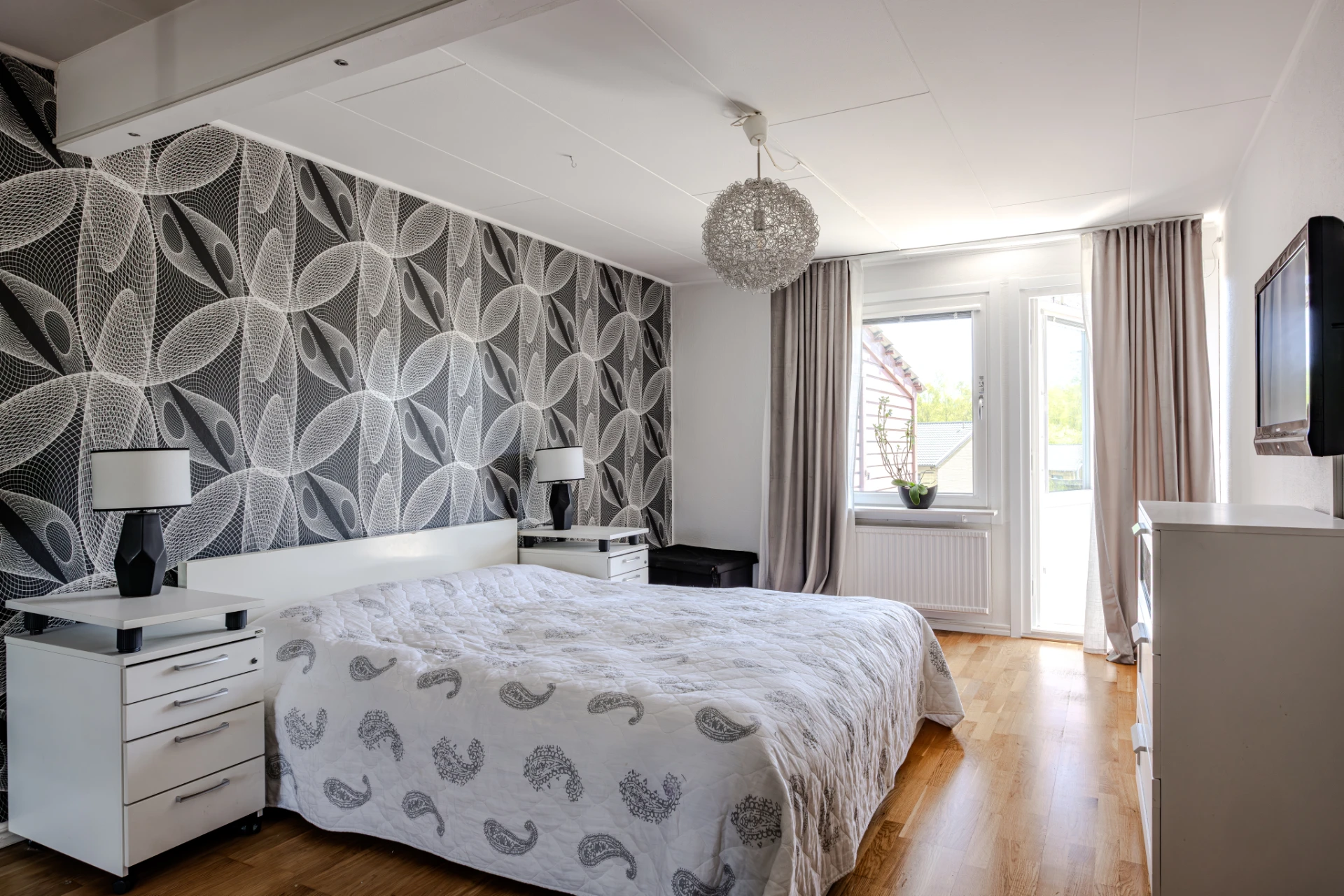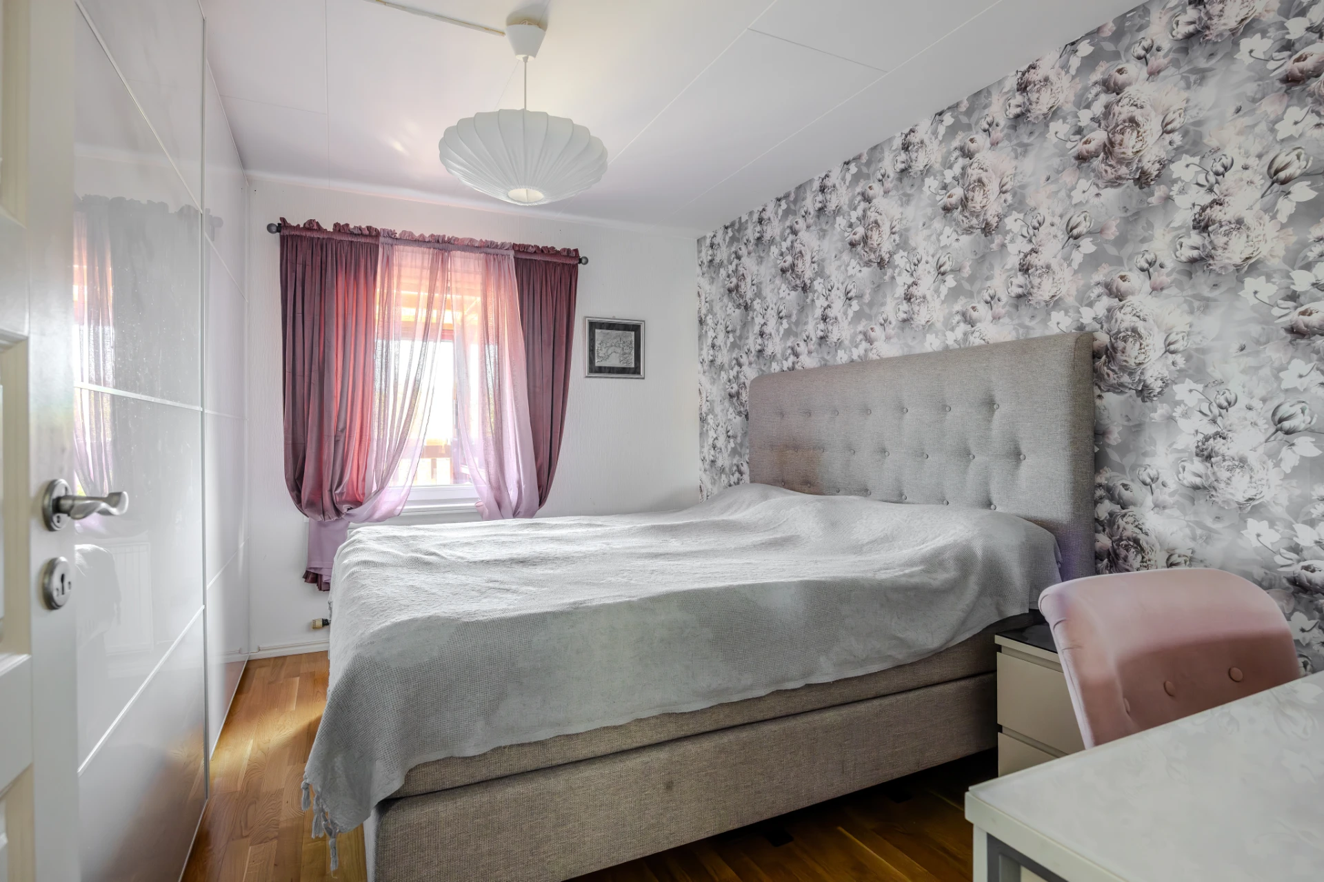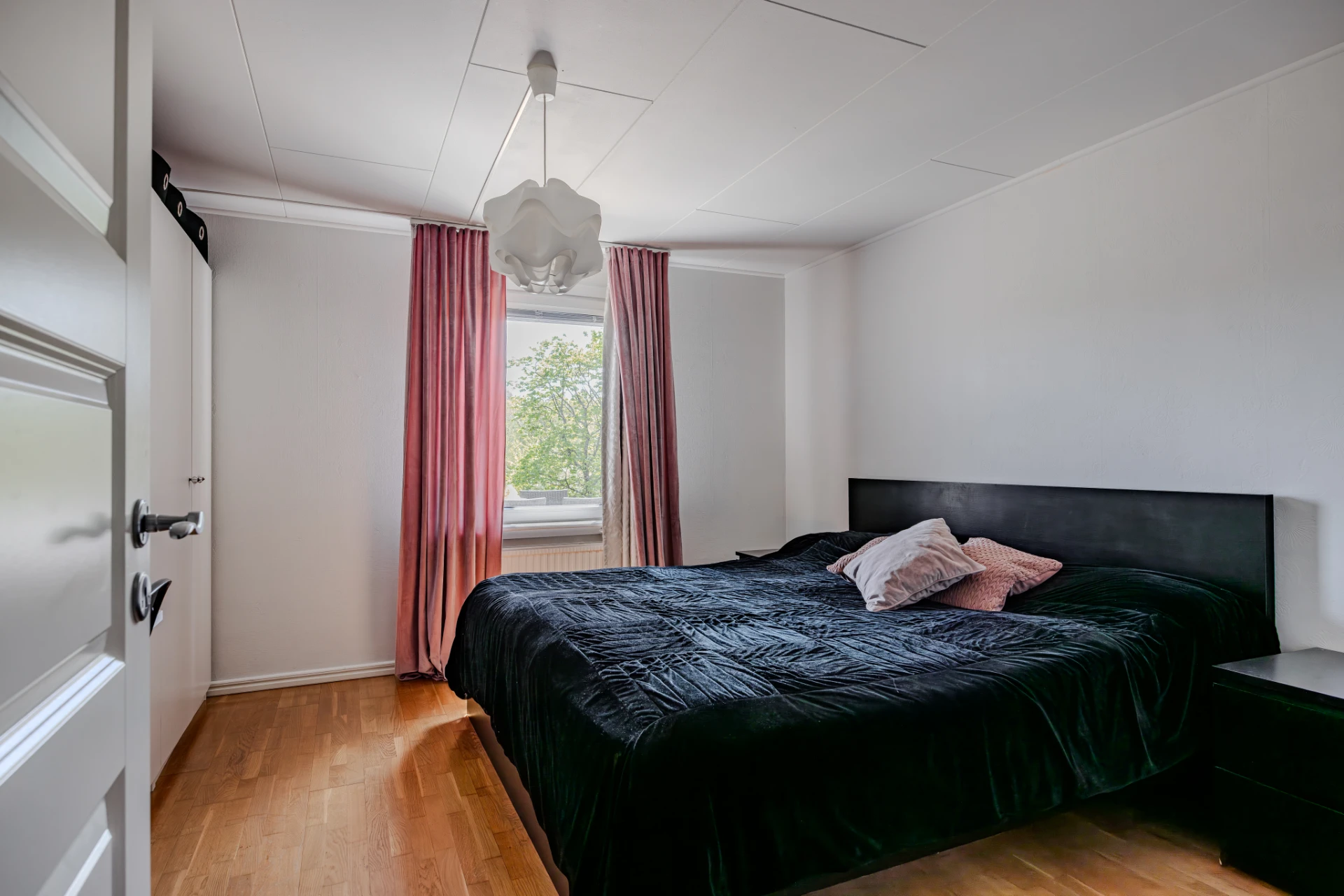 Parkettgolv och målade/fond -väggar. Plats för dubbelsäng med tillhörande möblemang. Förvaring i skjutsdörrsgarderob. Från sovrummet nås uteplatsen och trädgården.