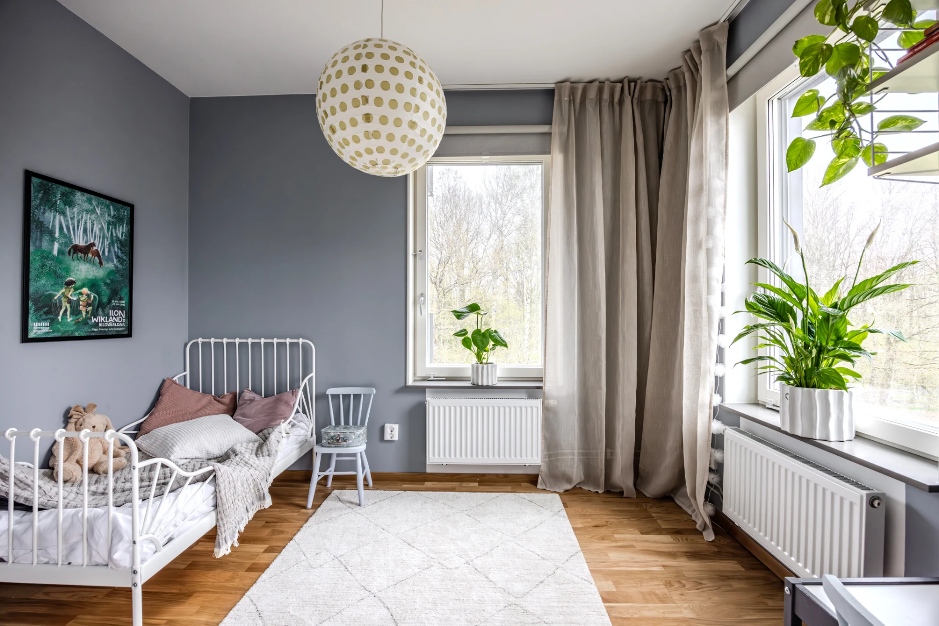 Parkettgolv och blå/grå väggar. Här finns plats för säng, skrivbord och förvaringsmöbel.