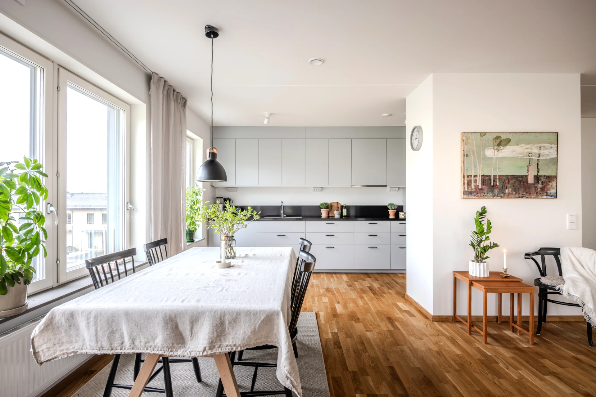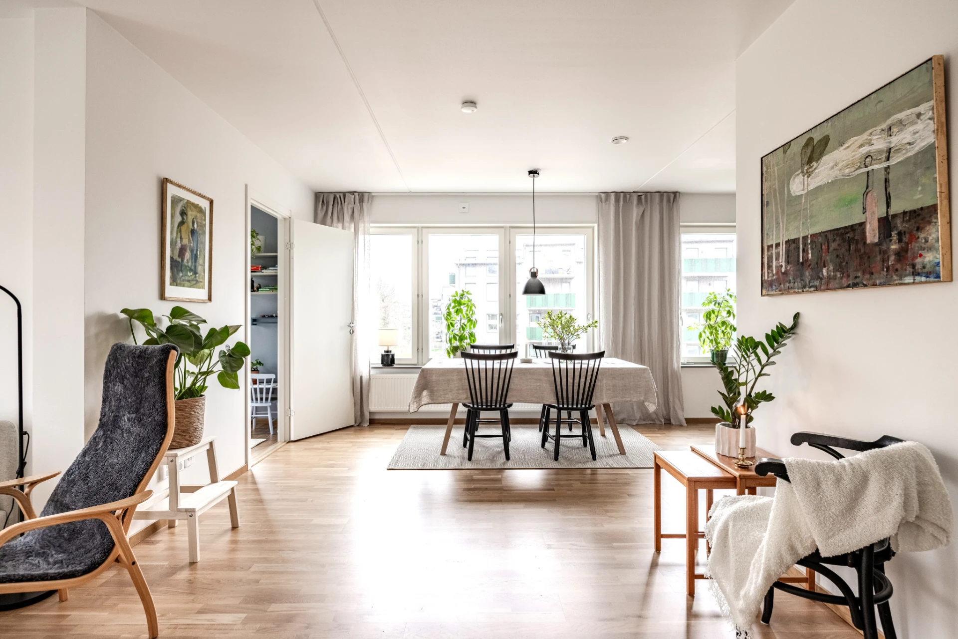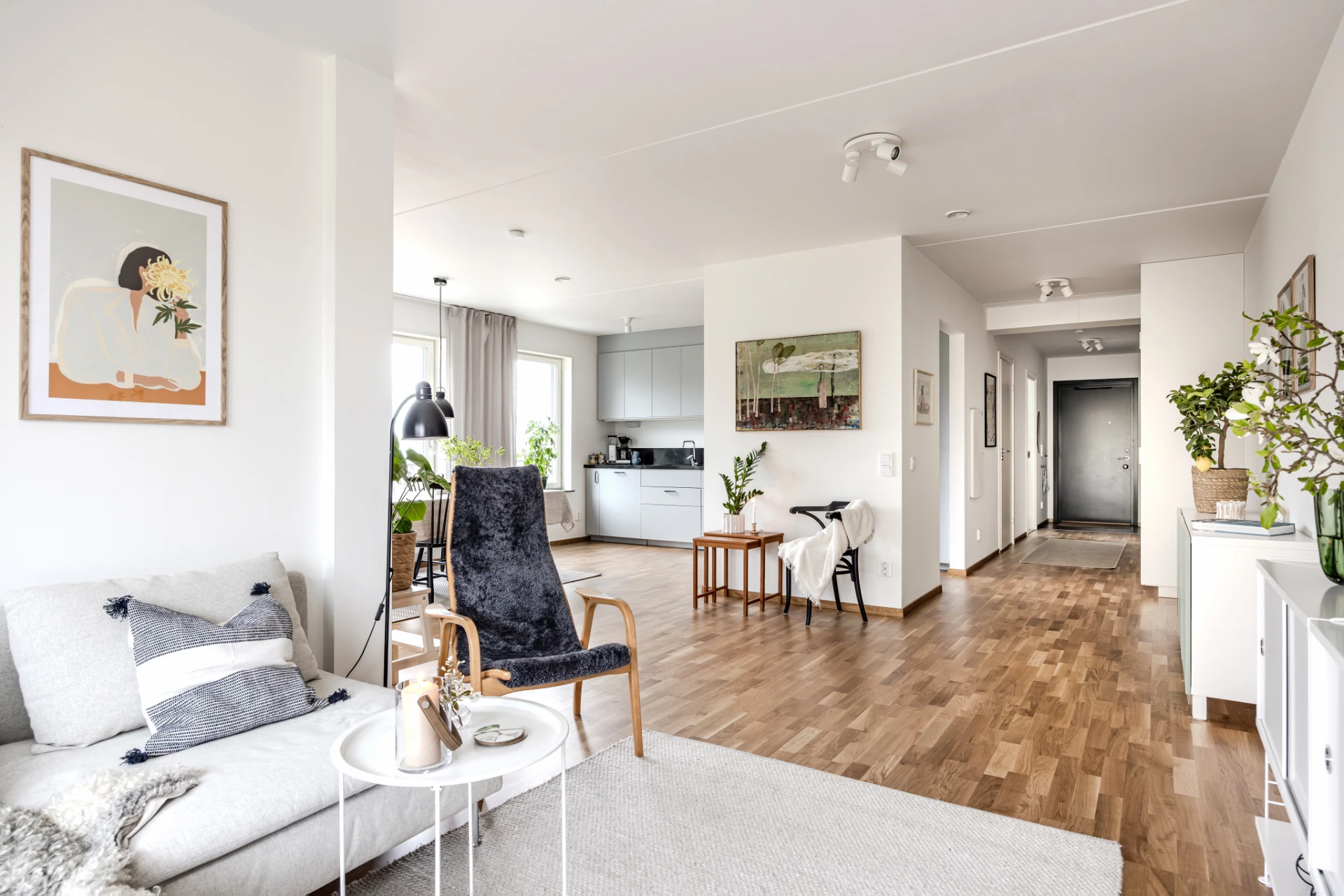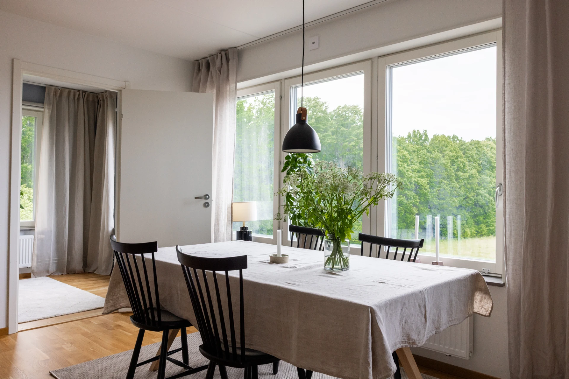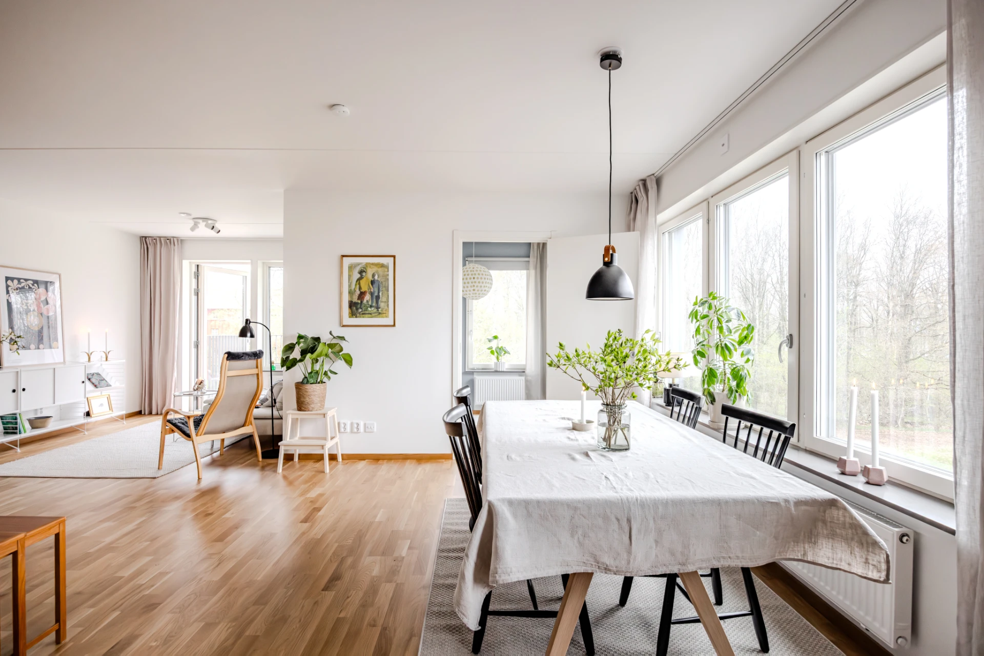 Ljus och rymlig hörntrea med skogen som närmsta granne! Här möts du av en bostad med stora fönster, fantastiskt ljusinsläpp och en öppen, social planlösning mellan kök och vardagsrum – perfekt för både vardag och umgänge.