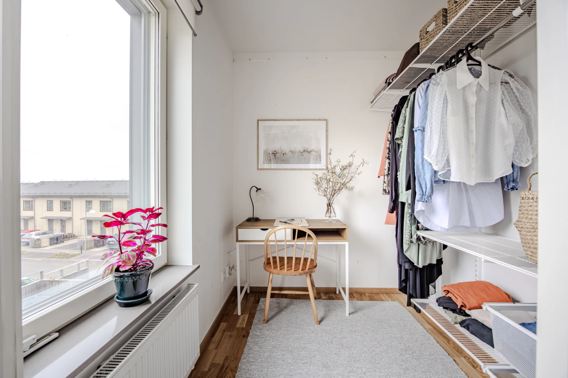 Parkettgolv och vita väggar. Rymlig klädkammare med fönster. I dagsläget inredd med klädstång och hyllplan från Elfa.