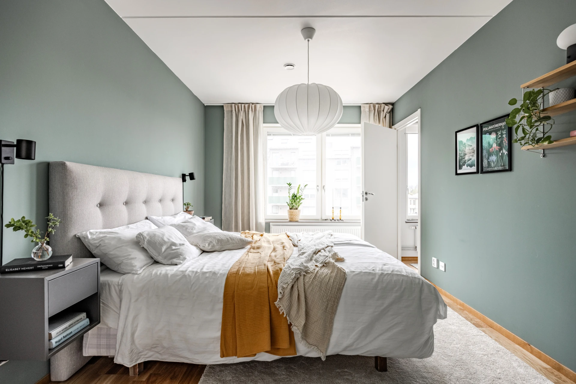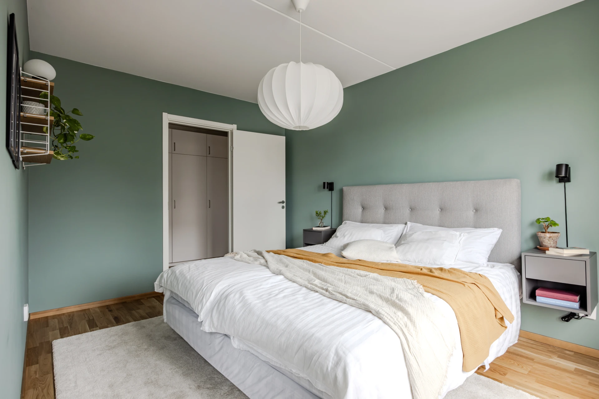 Parkettgolv och grön/gråa väggar. Plats för dubbelsäng och förvaring i en rymlig klädkammare i anslutning.