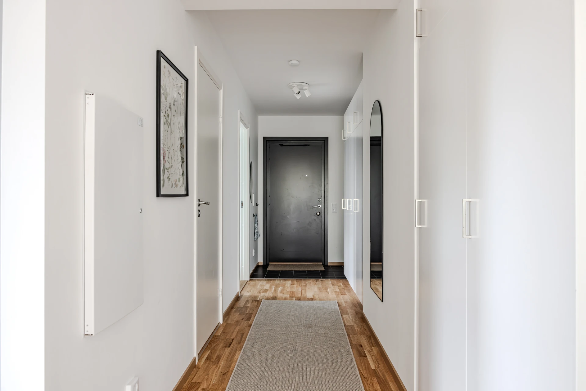 Klinkergolv närmast entrén följt av parkettgolv och vita väggar. Plats för avhängning av ytterkläder och förvaring i 6 garderober. Takbelysning med dimmer och säkerhetsdörr.