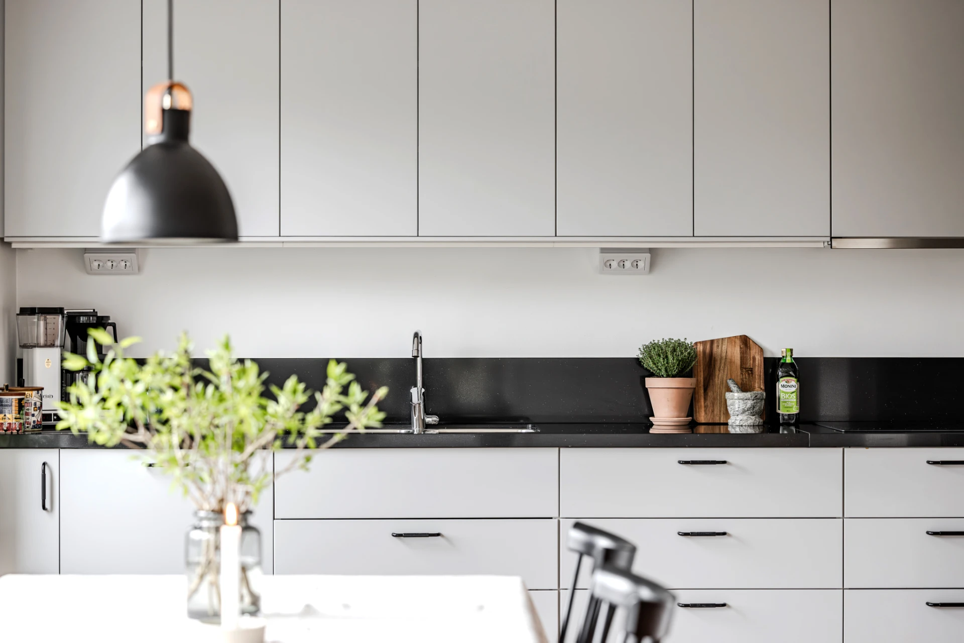 Parkettgolv och vita väggar. Köksinredning med gråa köksluckor. Köksbänkar och stänkskydd i kvartskomposit samt spotlights med dimmer över arbetsbänken. Köksutrustningen består integrerad kyl och frys i fullhöjd, induktionshäll, inbyggd ugn, fläkt, inbyggd mikro och integrerad diskmaskin. Gott om plats för större matgrupp.