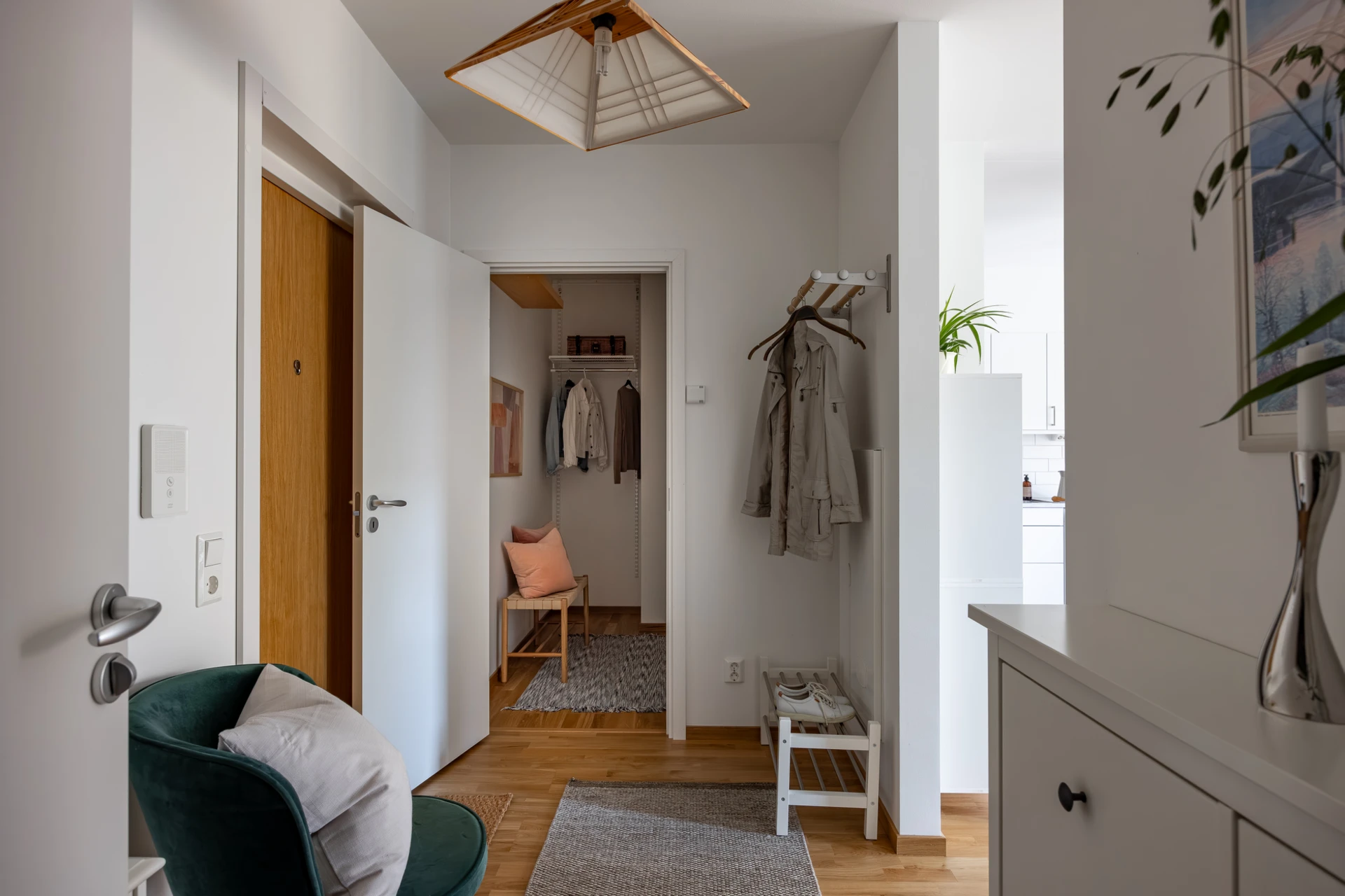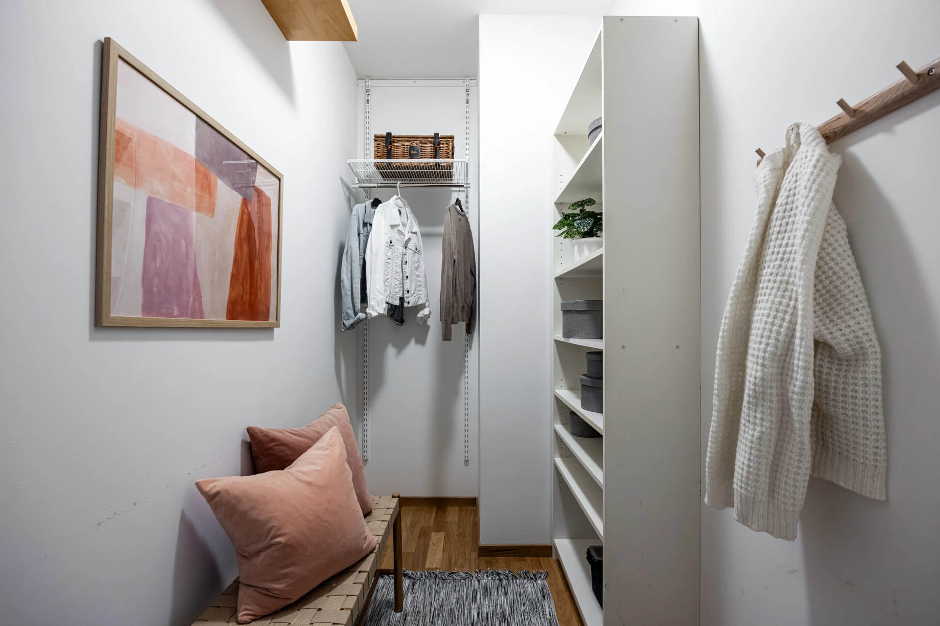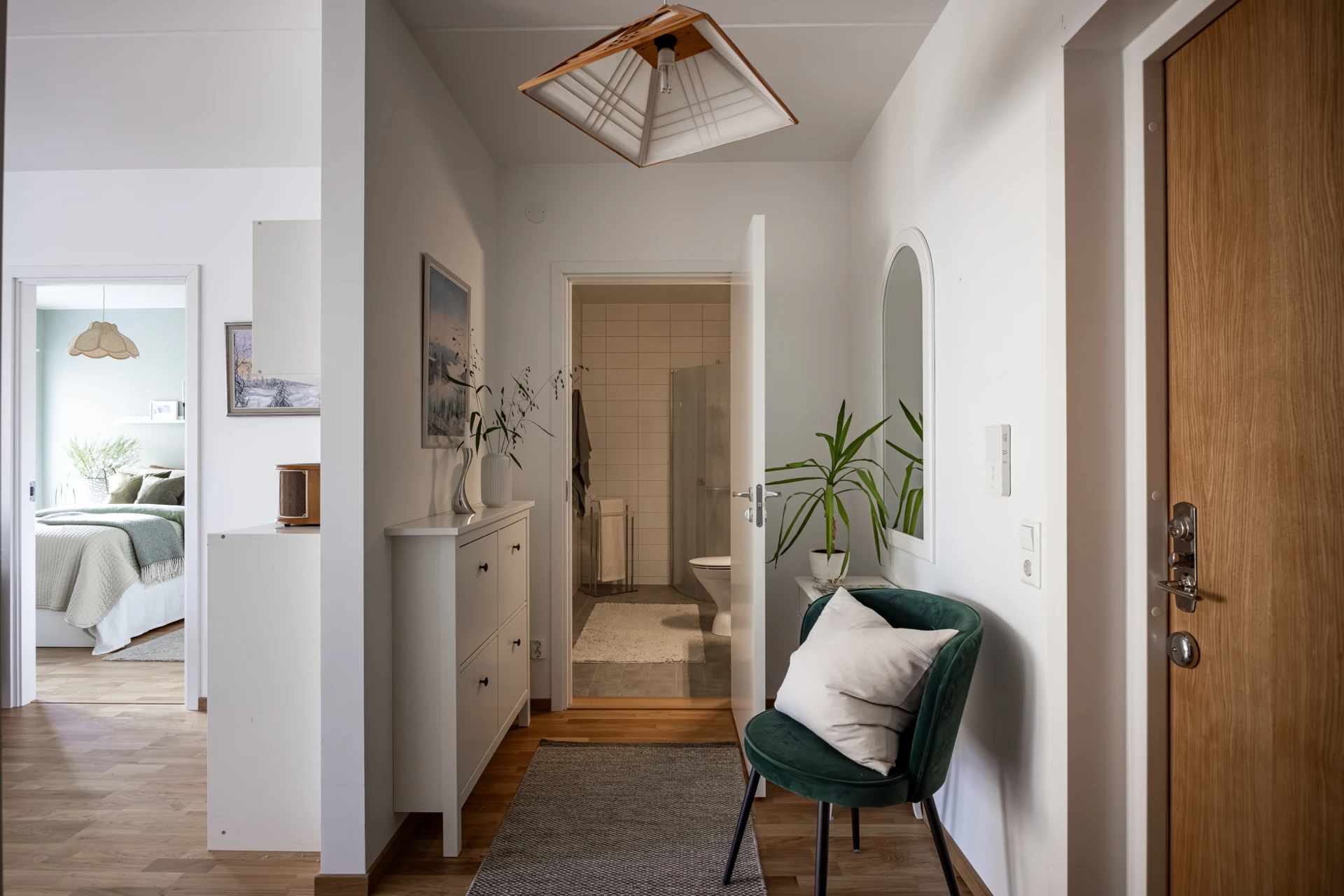 Klinker som övergår till parkettgolv och målade väggar i ljus kulör. Här finns plats för avhängning samt förvaring i en klädkammare. Lägenheten är utrustad med säkerhetsdörr.