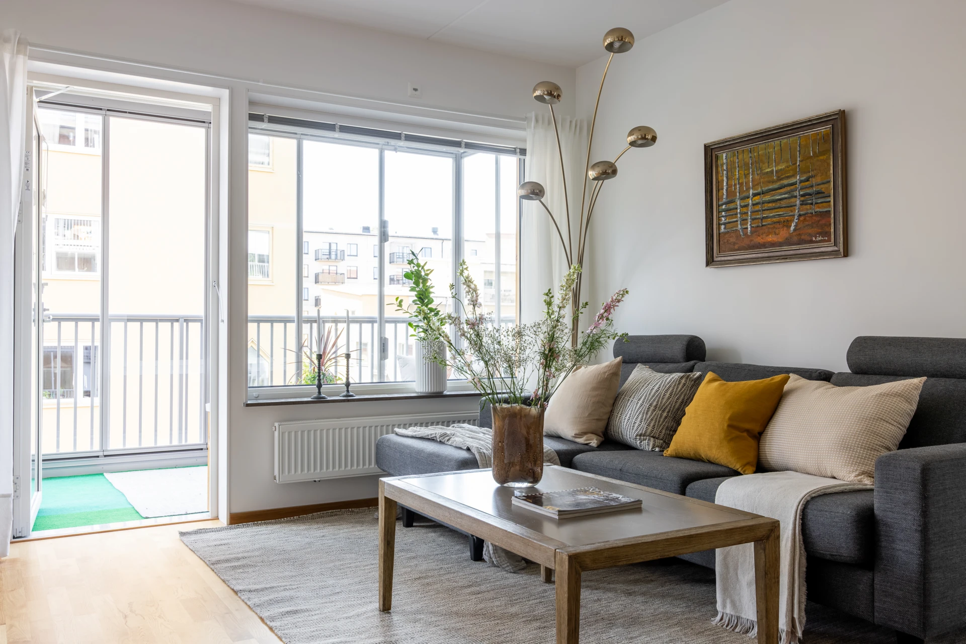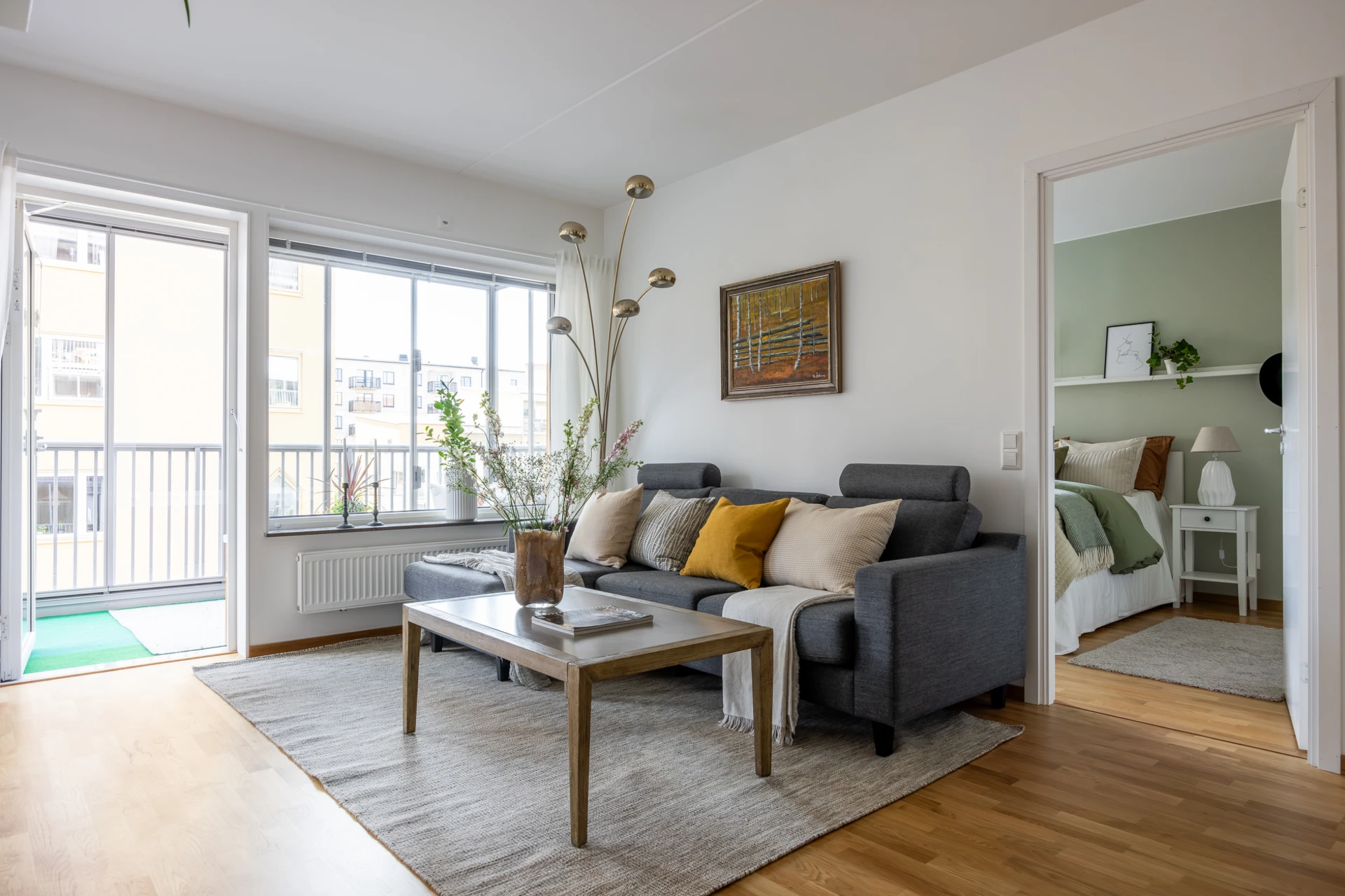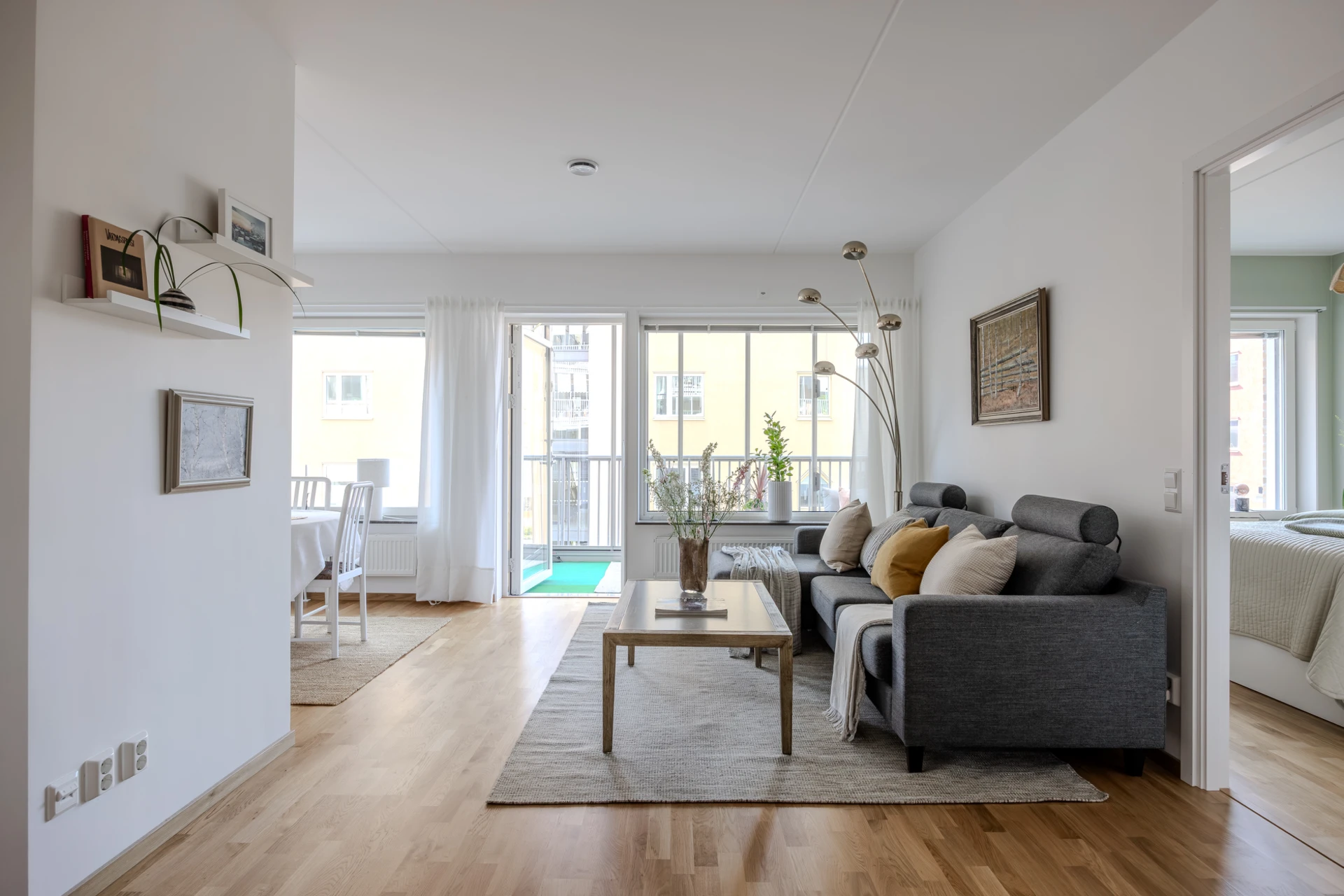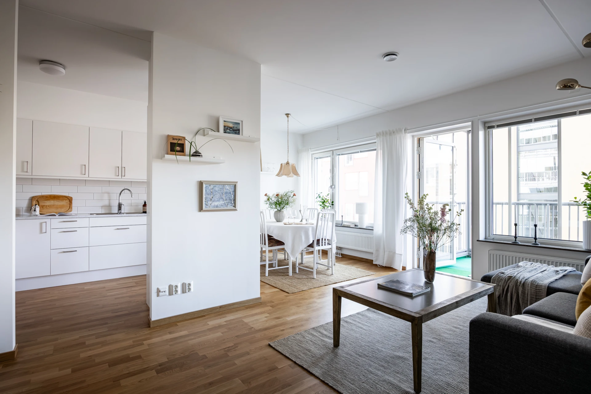 Parkettgolv och målade väggar i ljus kulör. Här finns plats för soffgrupp med tillhörande möblemang. Utgång till bostadens balkong med plats för utemöbler.