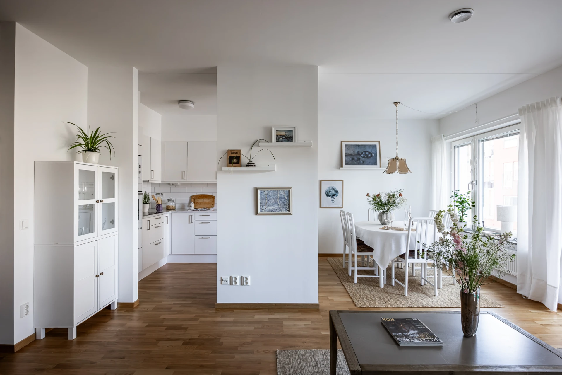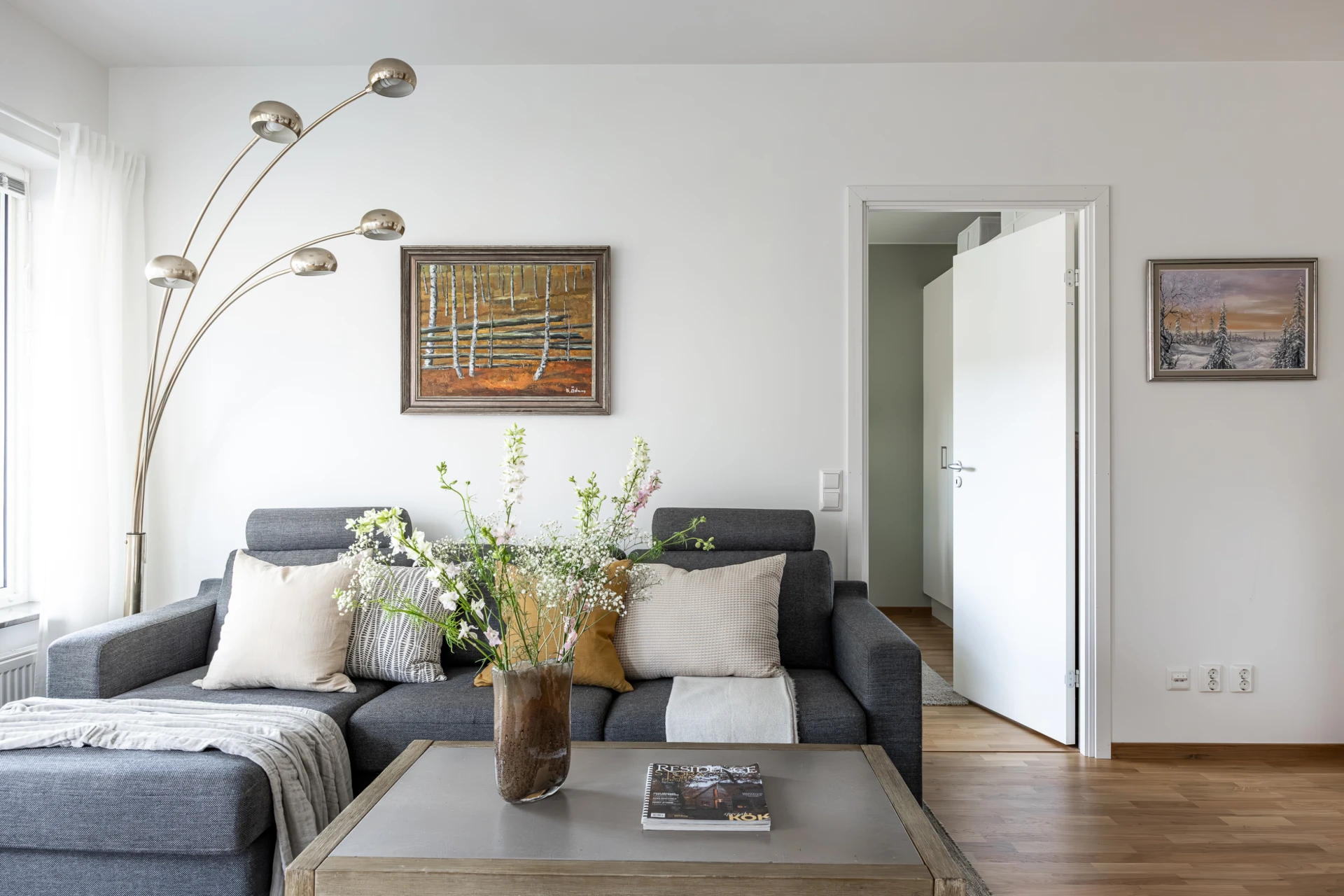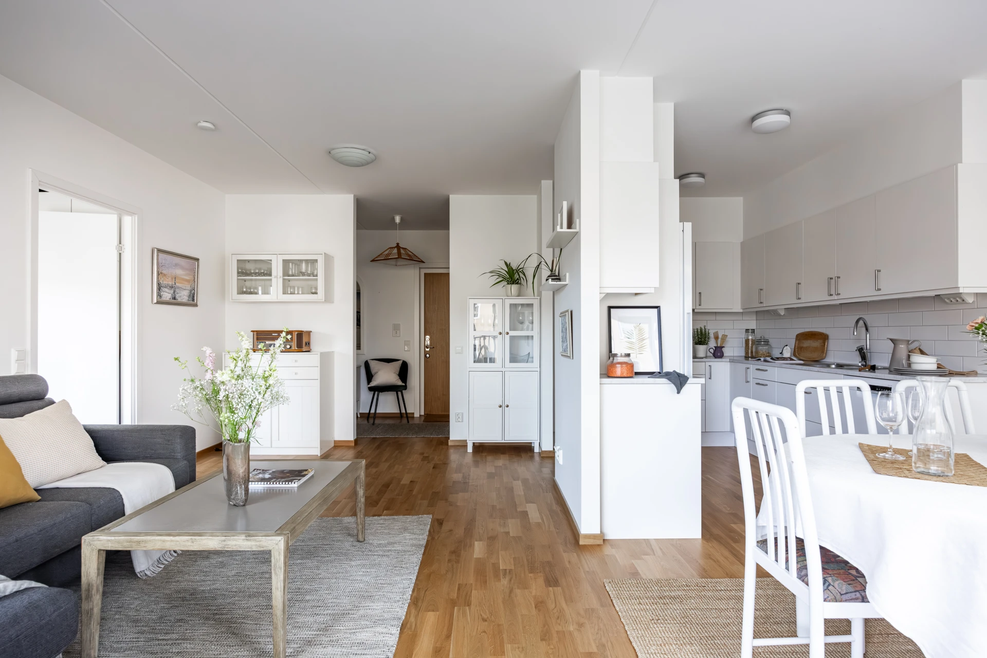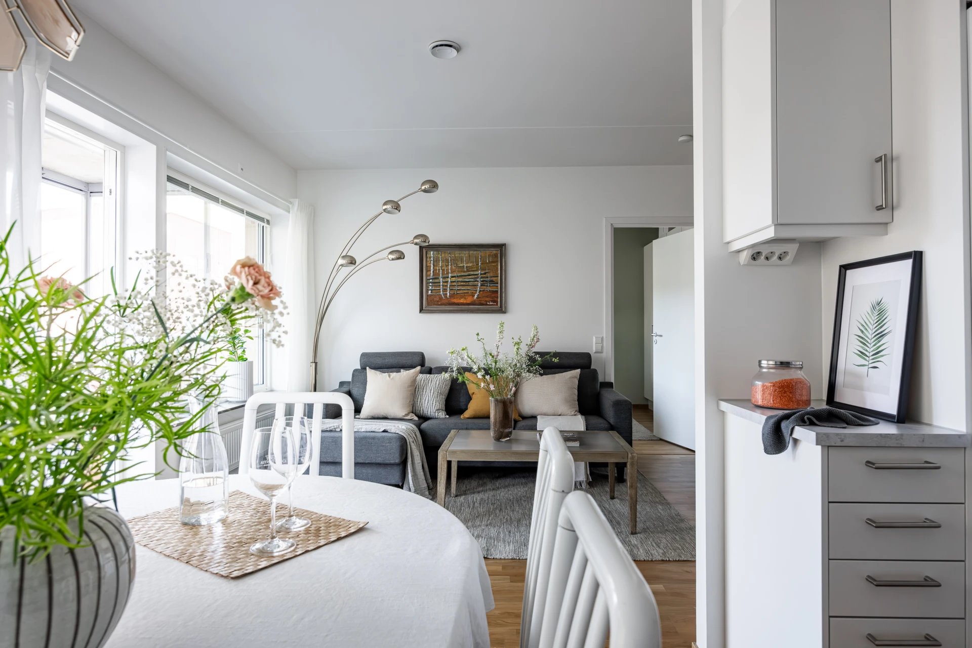 Parkettgolv och målade väggar i ljus kulör. Här finns plats för soffgrupp med tillhörande möblemang. Utgång till bostadens balkong med plats för utemöbler.