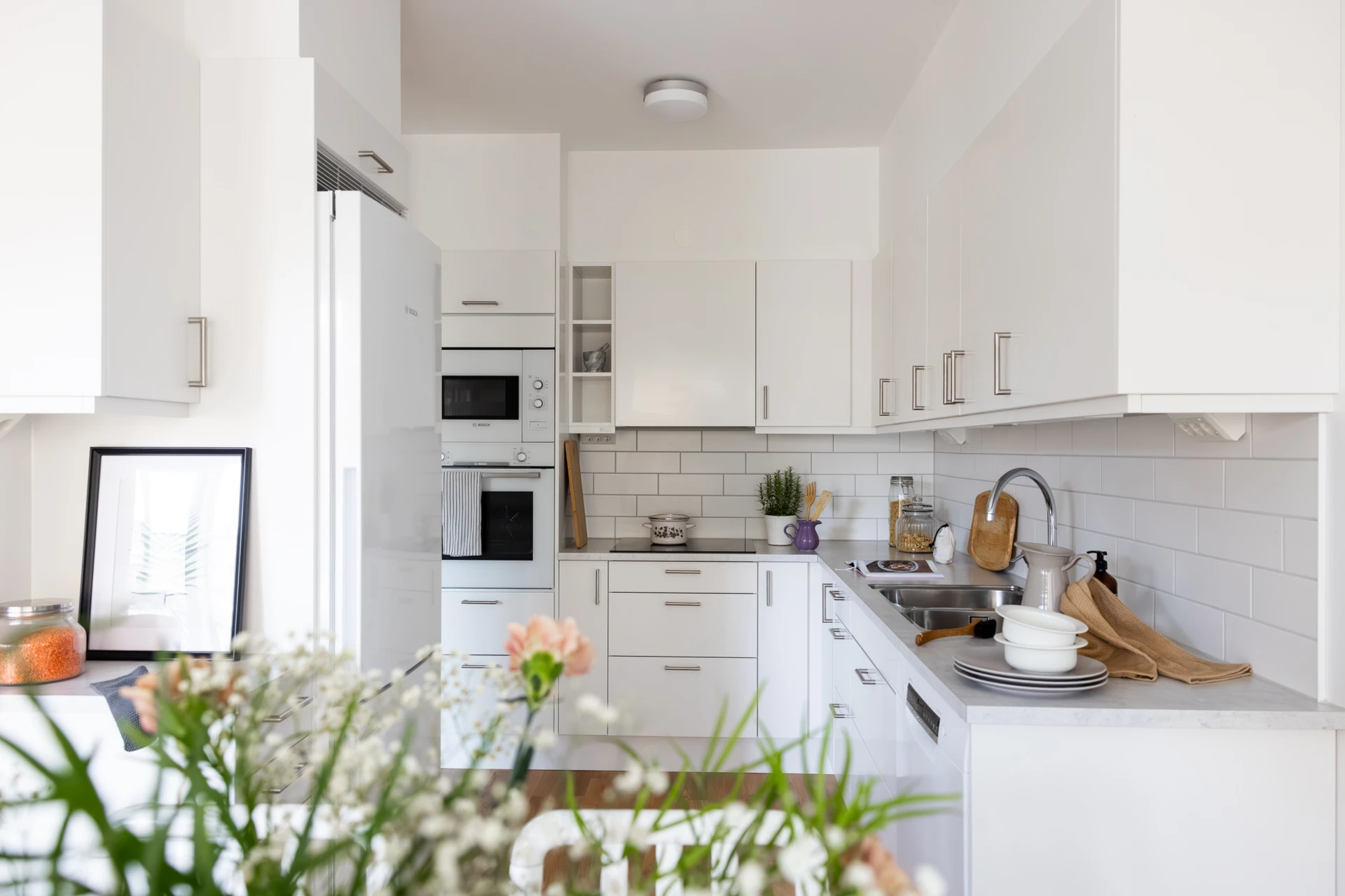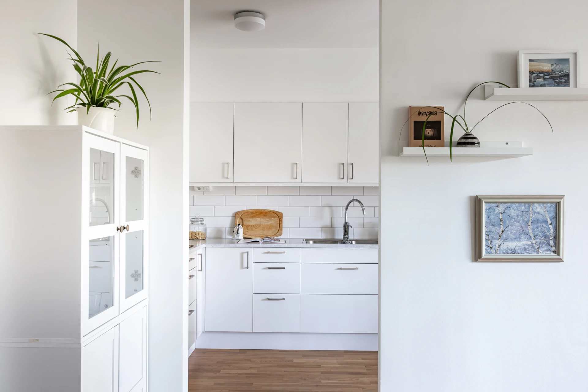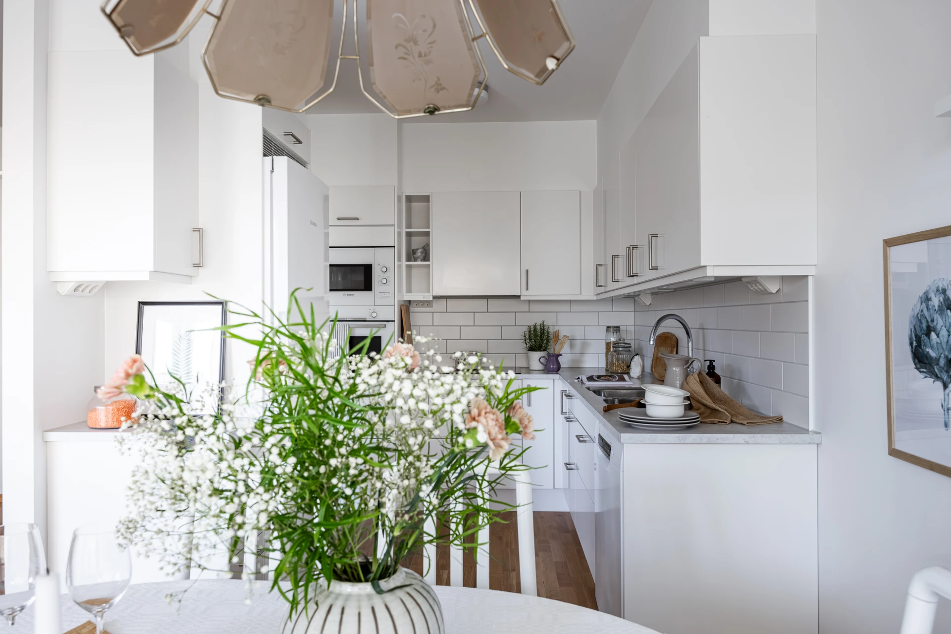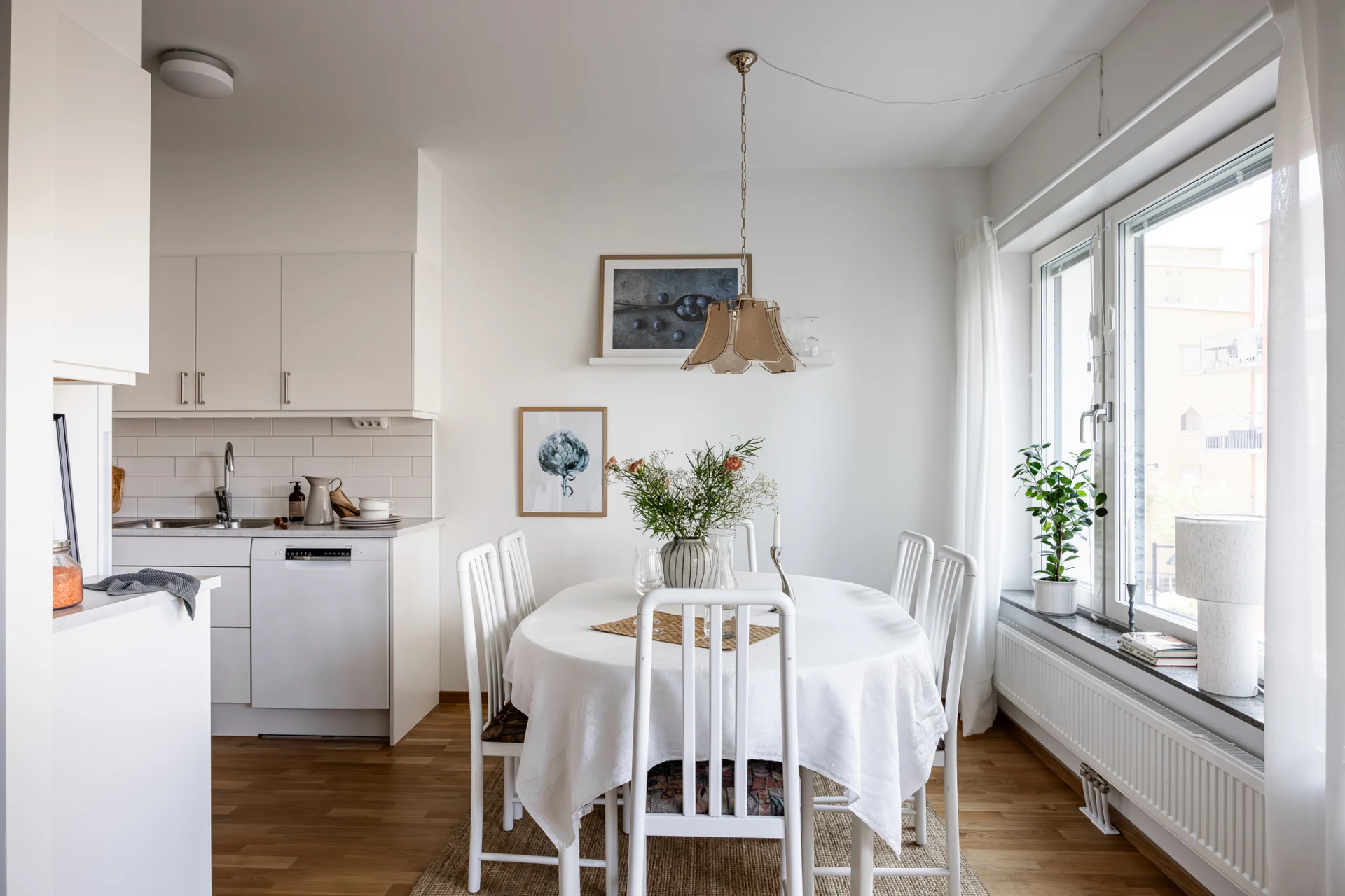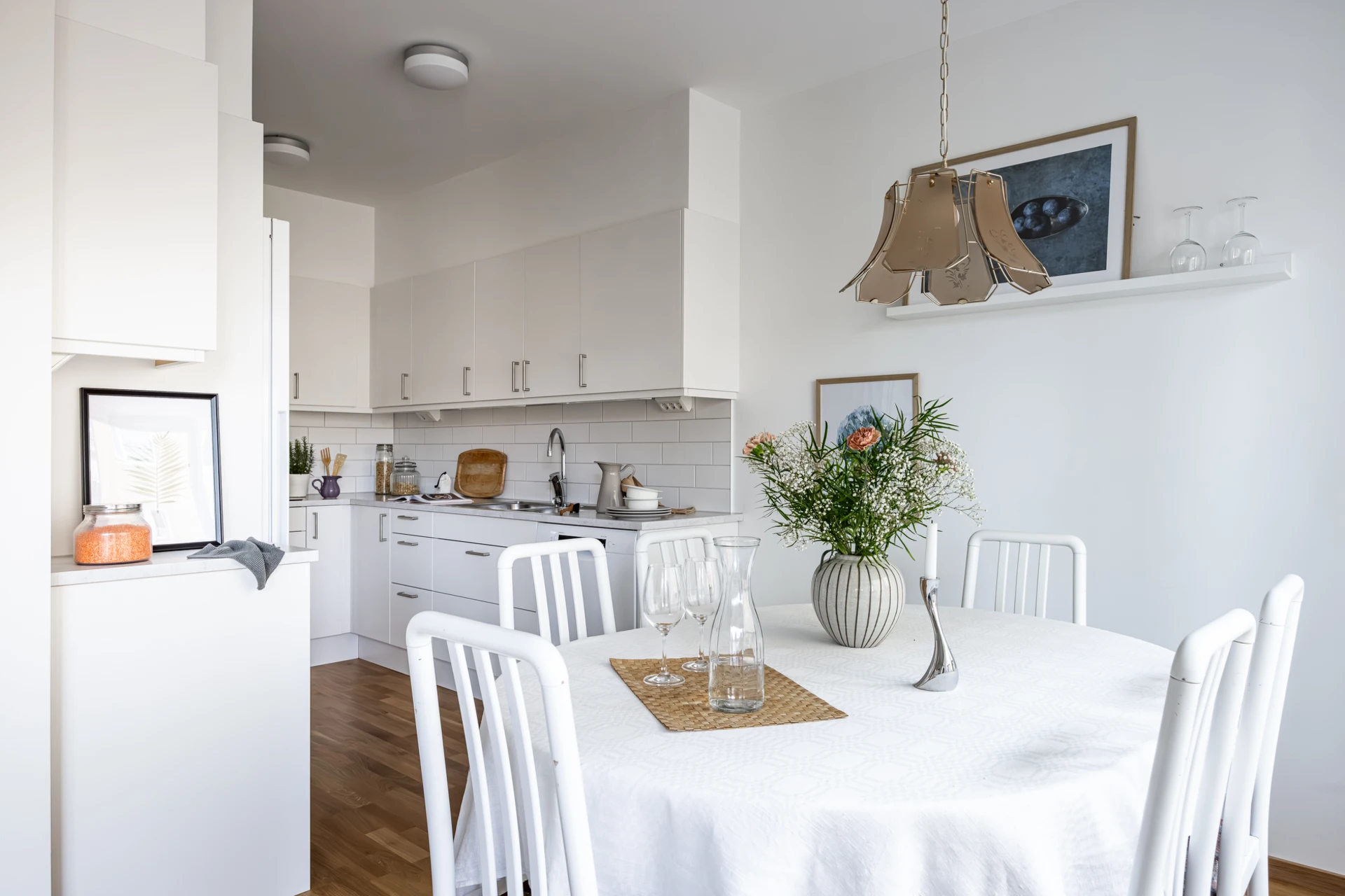 Parkettgolv och målade väggar i ljus kulör. Köksinredning i vitt och ovanför bänkskivan i laminat sitter vitt kakel. Köket är utrustat med kombinerad kyl/frys, induktionshäll, inbyggd ugn, köksfläkt, inbyggd mikrovågsugn och diskmaskin. Samtliga vitvaror är av märket Bosch från 2021. Matplats för ca 4-6 personer.