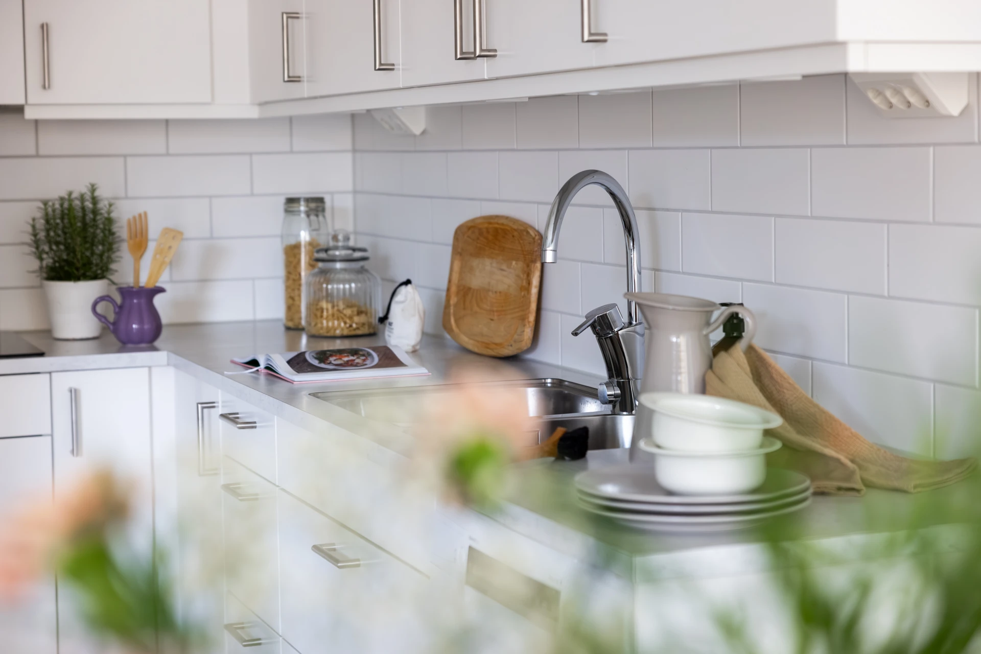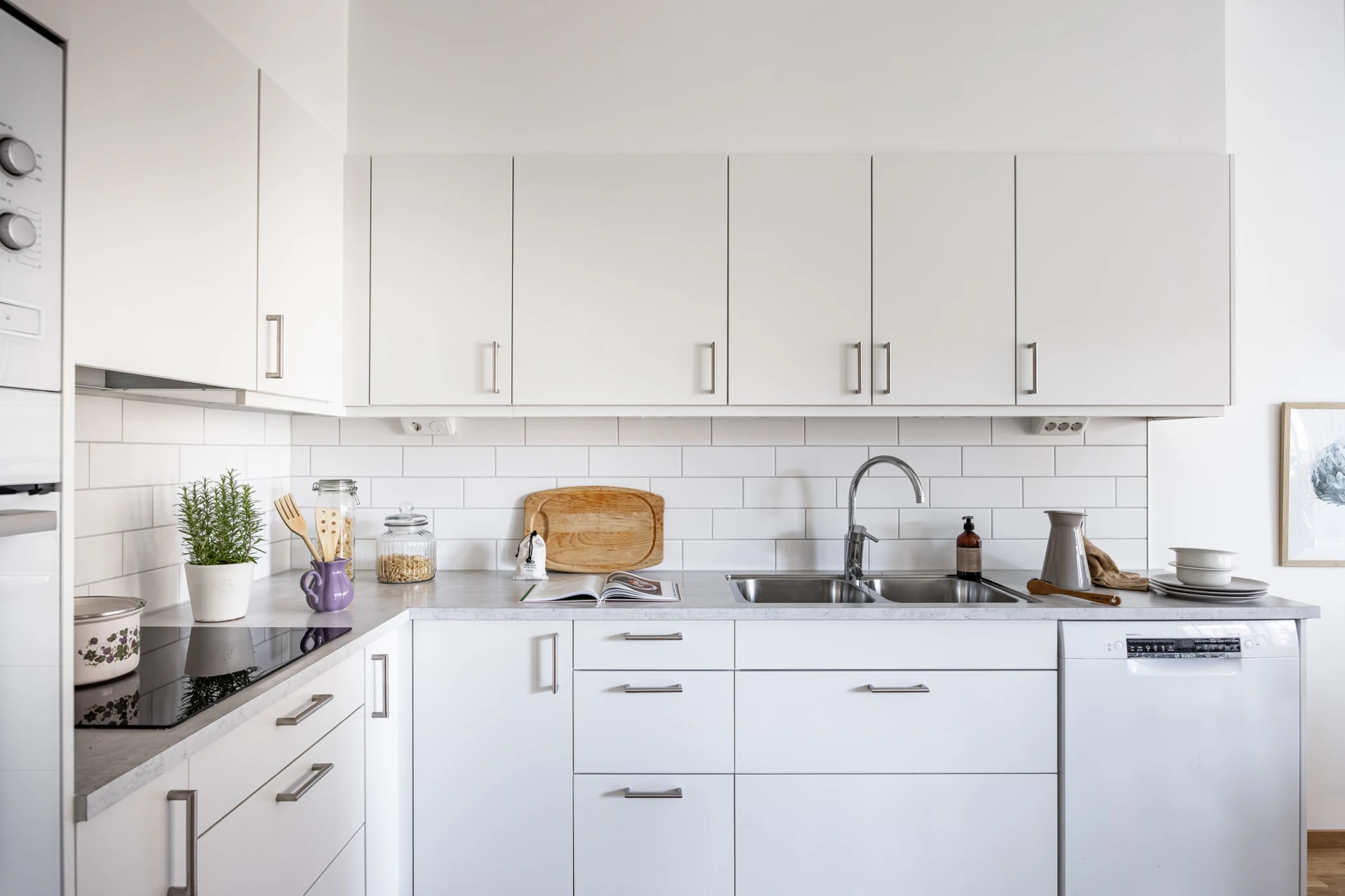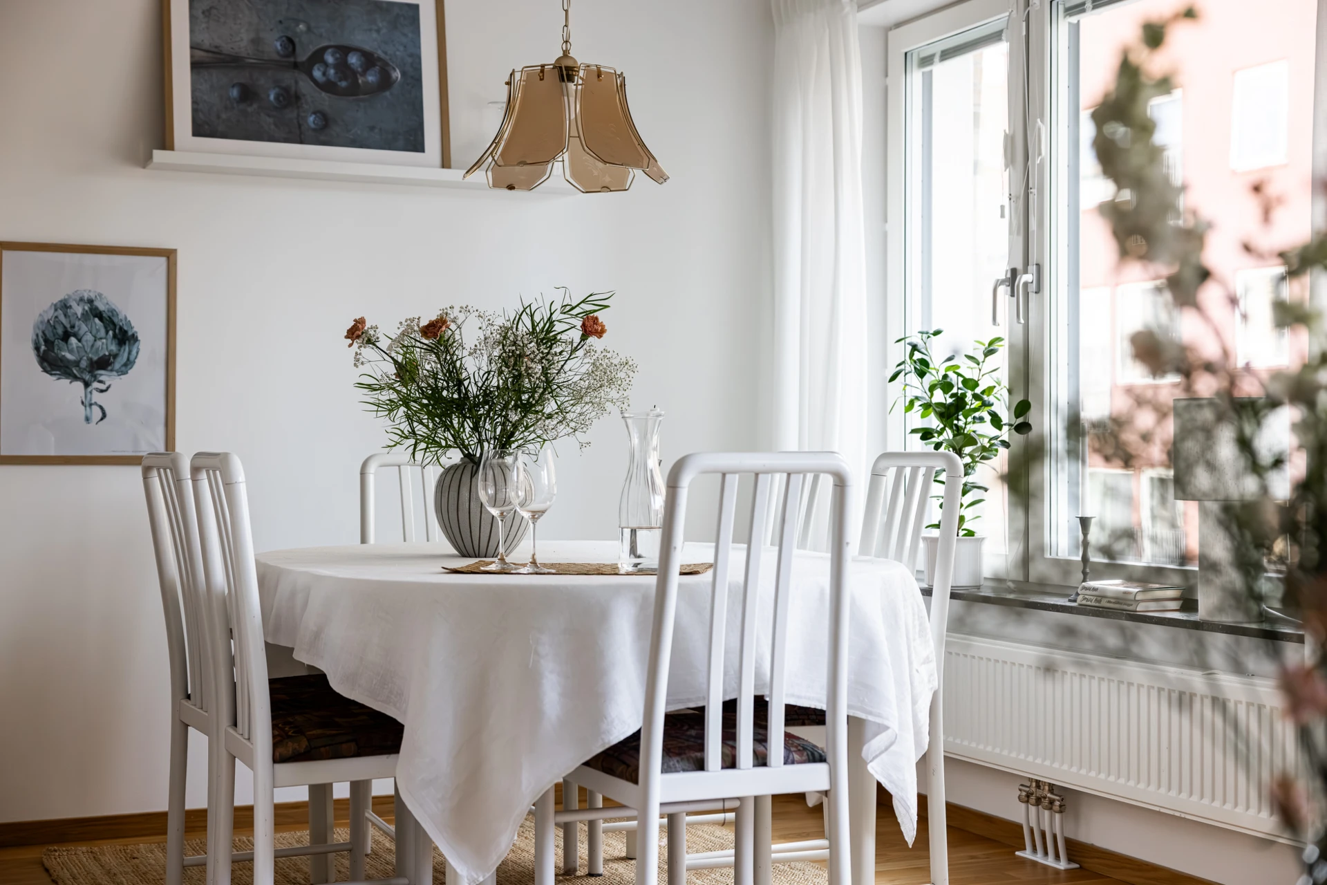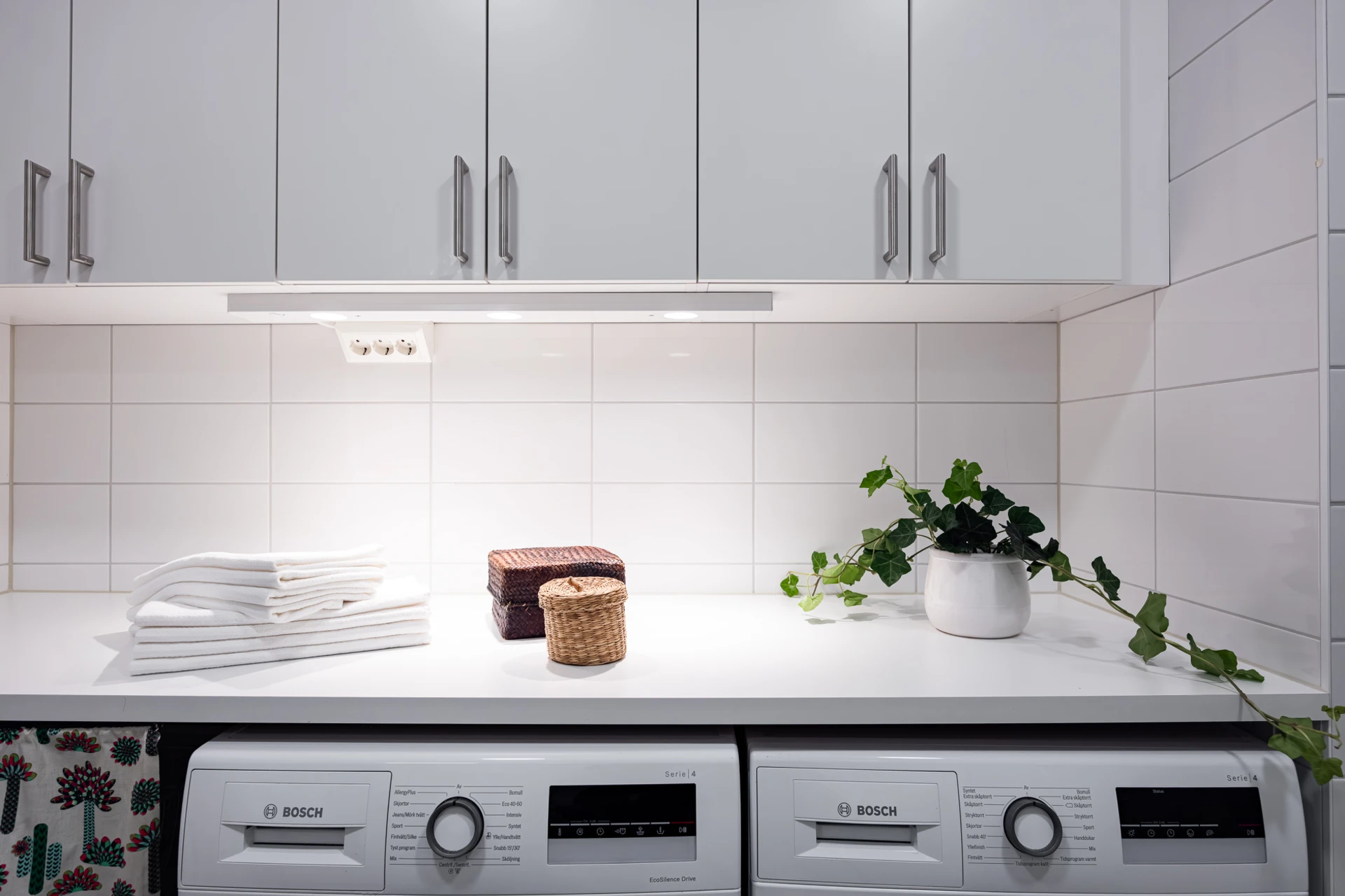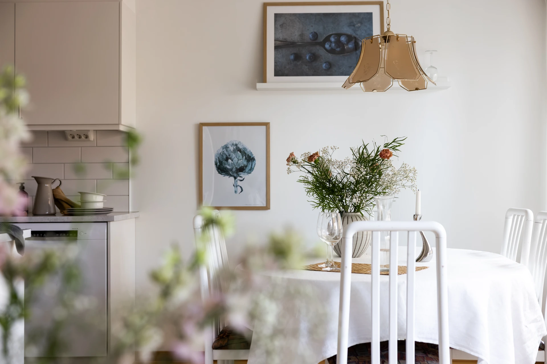 Parkettgolv och målade väggar i ljus kulör. Köksinredning i vitt och ovanför bänkskivan i laminat sitter vitt kakel. Köket är utrustat med kombinerad kyl/frys, induktionshäll, inbyggd ugn, köksfläkt, inbyggd mikrovågsugn och diskmaskin. Samtliga vitvaror är av märket Bosch från 2021. Matplats för ca 4-6 personer.