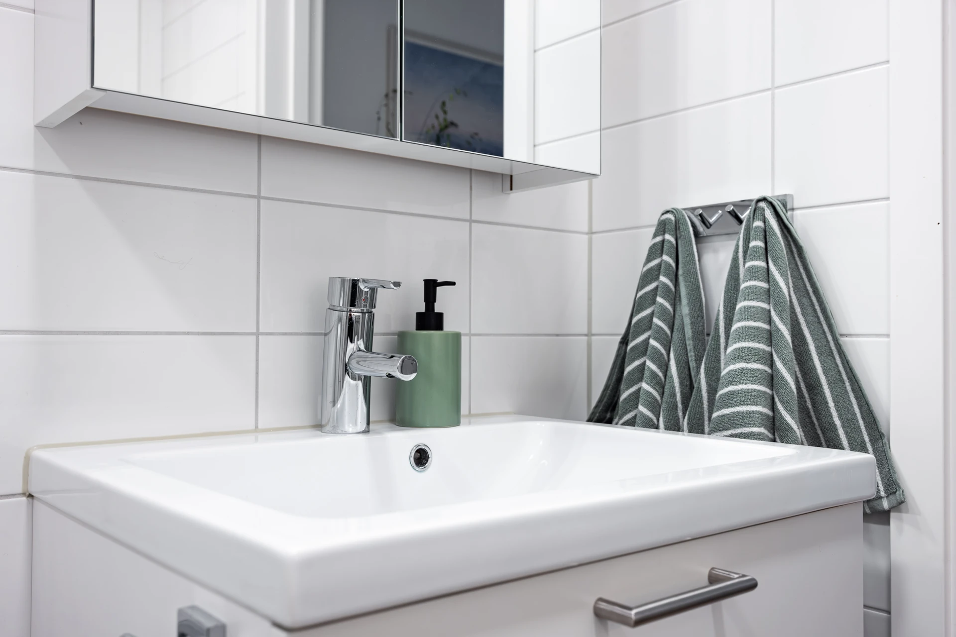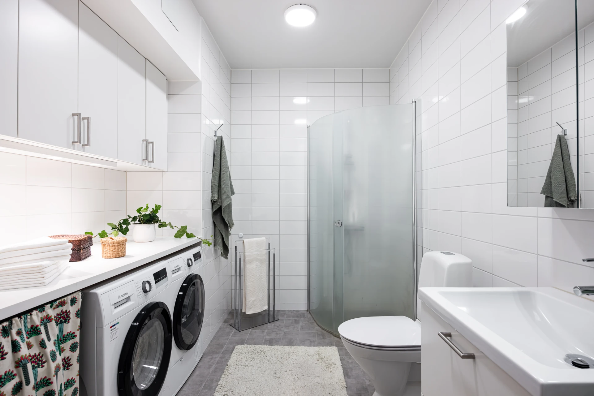Grått klinkergolv och helkaklade väggar i vitt. Badrummet är utrustat med WC, handfat med kommod, spegelskåp, dusch samt tvättmaskin och torktumlare.