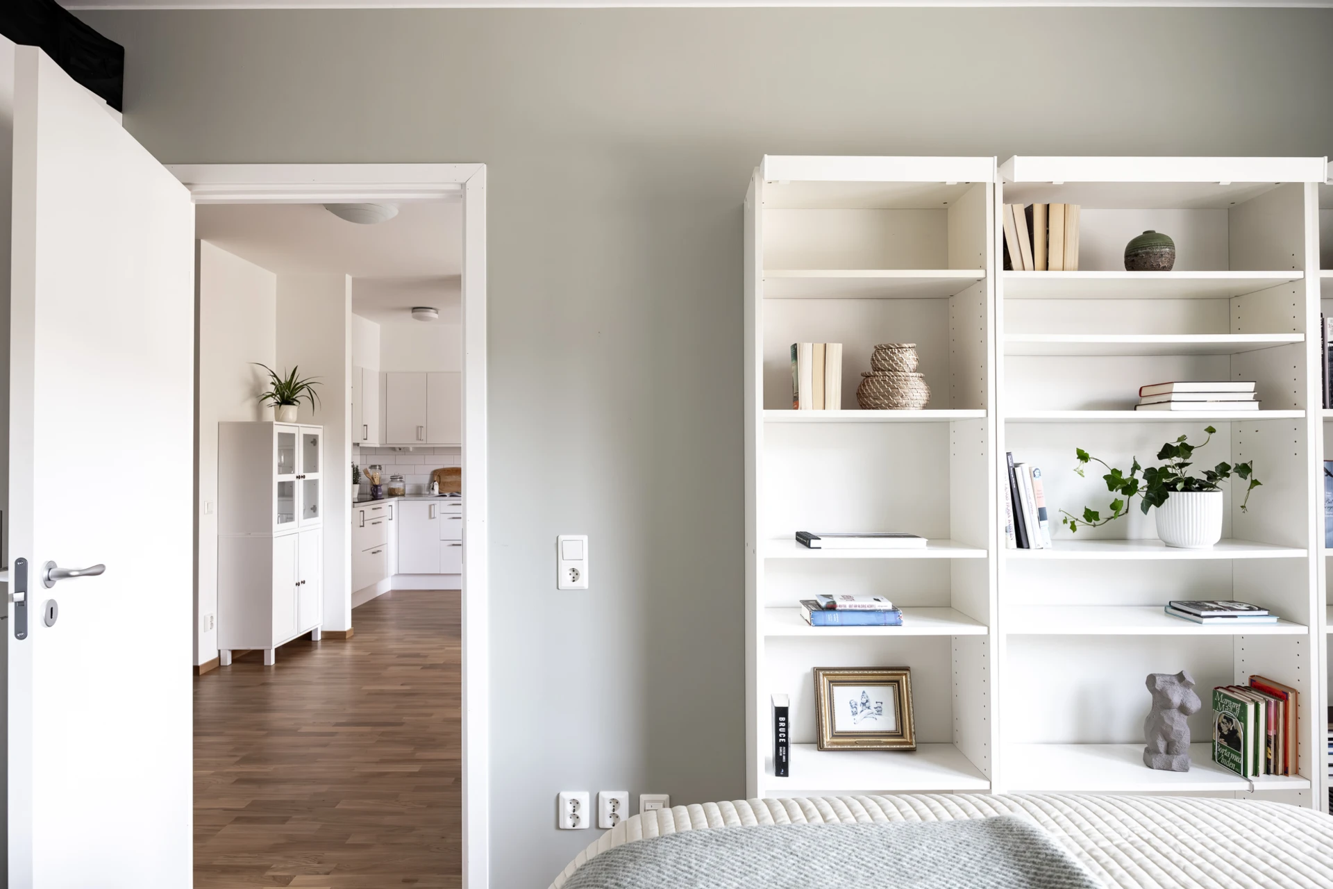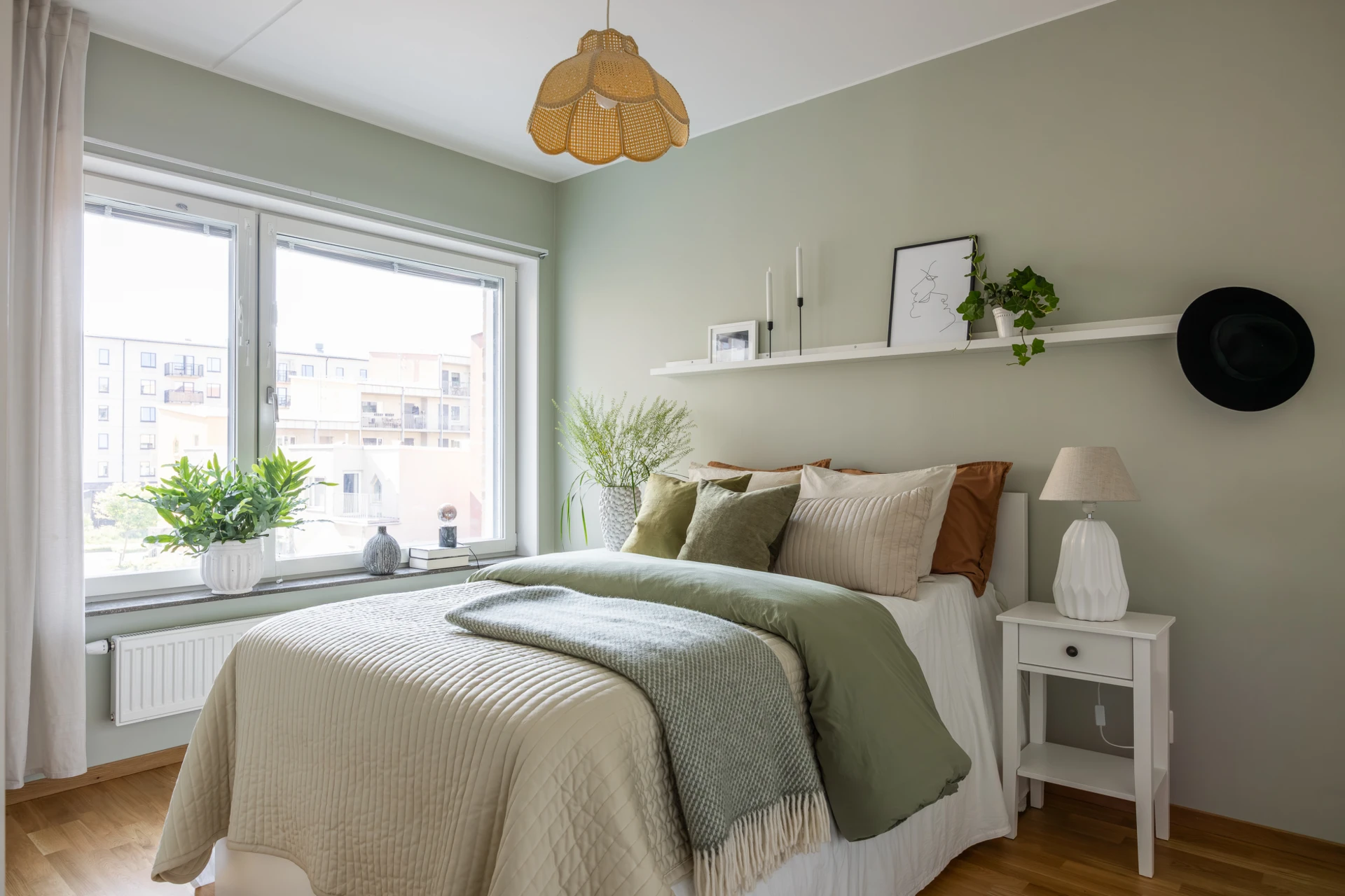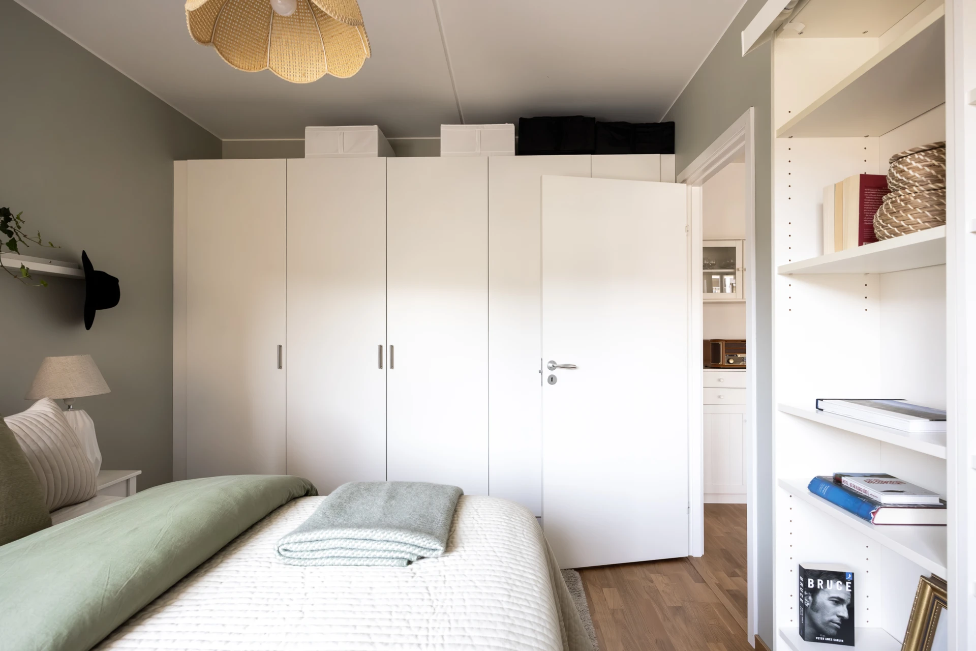 Parkettgolv och målade väggar i sobert grön kulör. Här finns plats för dubbelsäng med tillhörande möblemang. Förvaring i 4 inbyggda garderober.