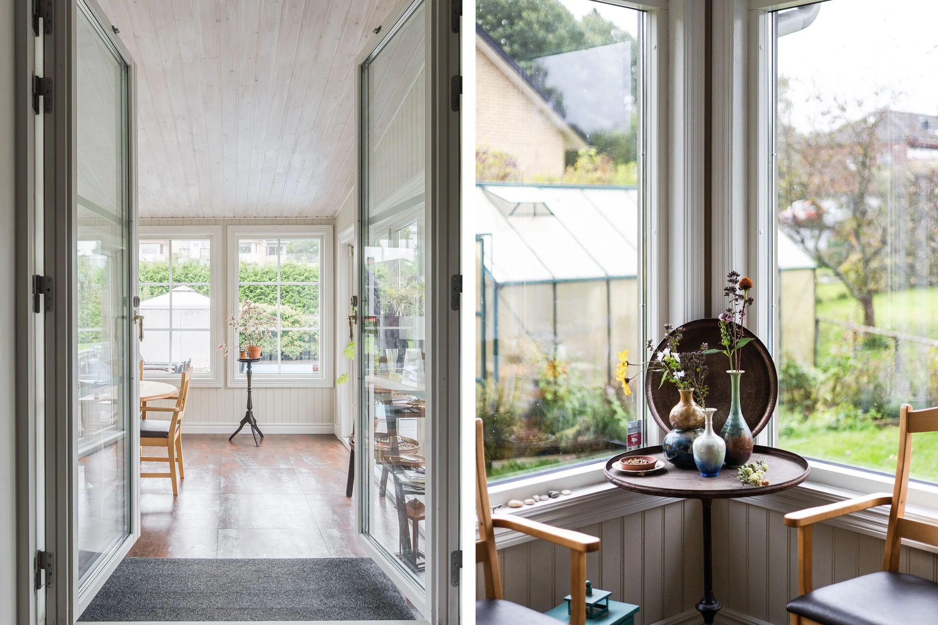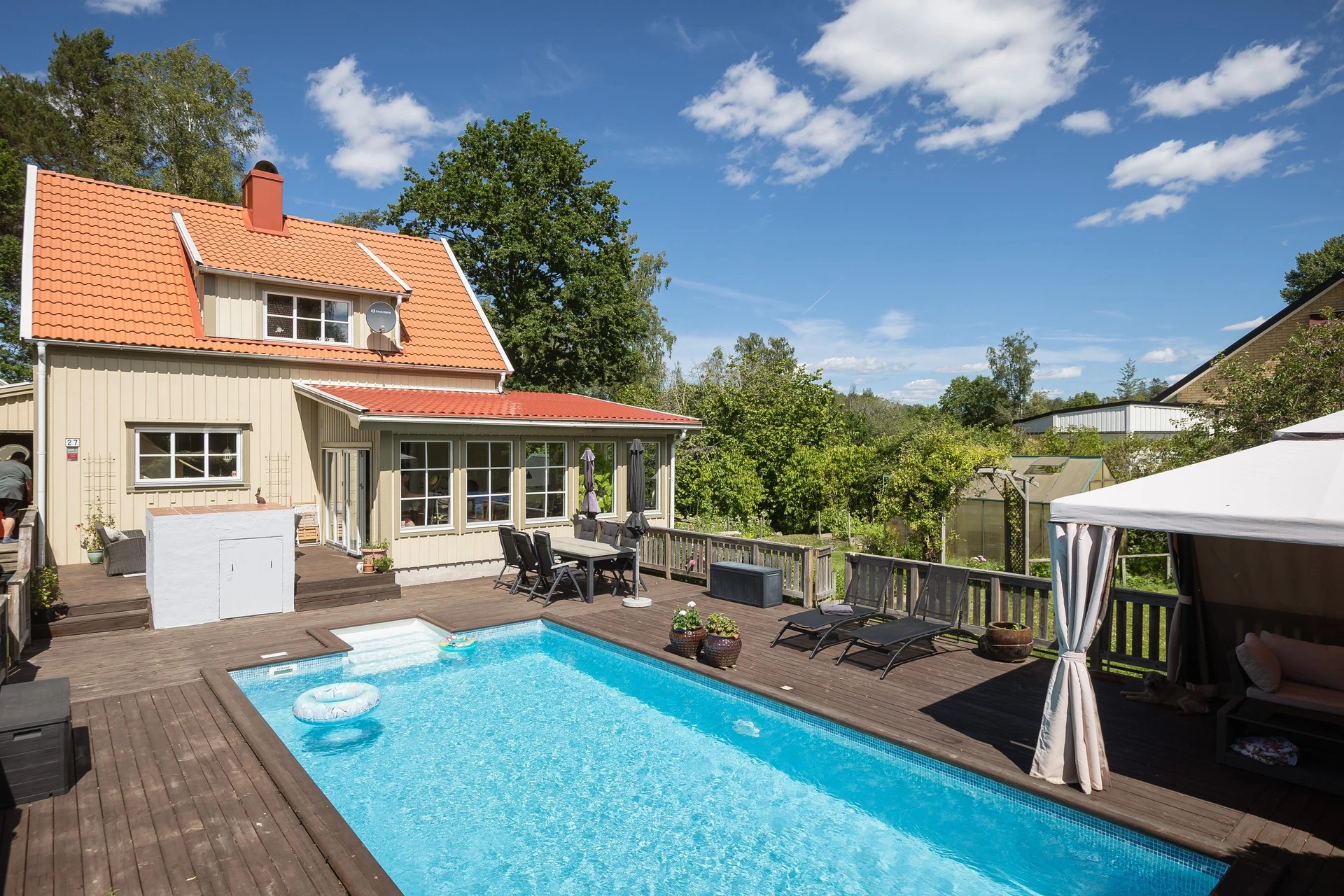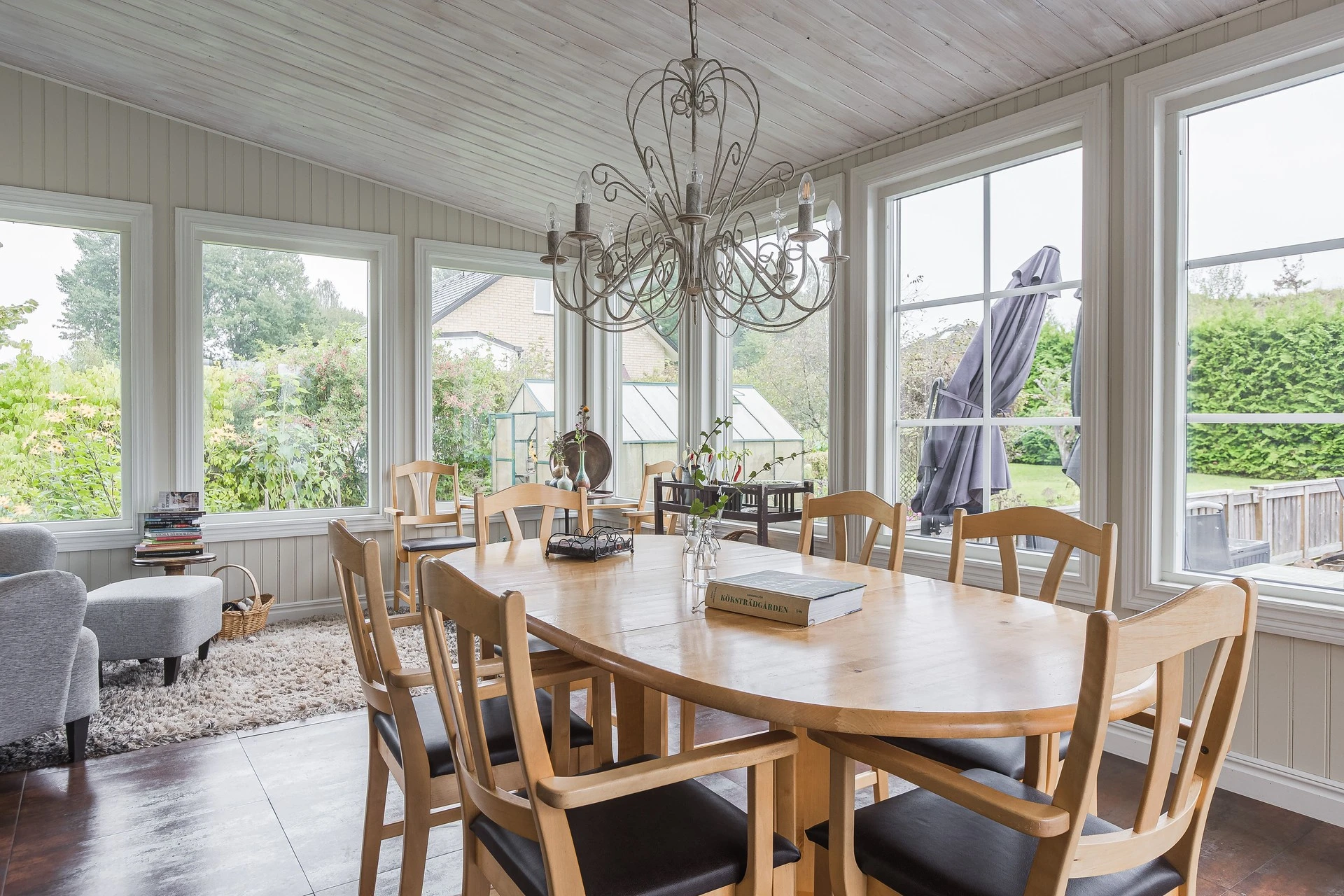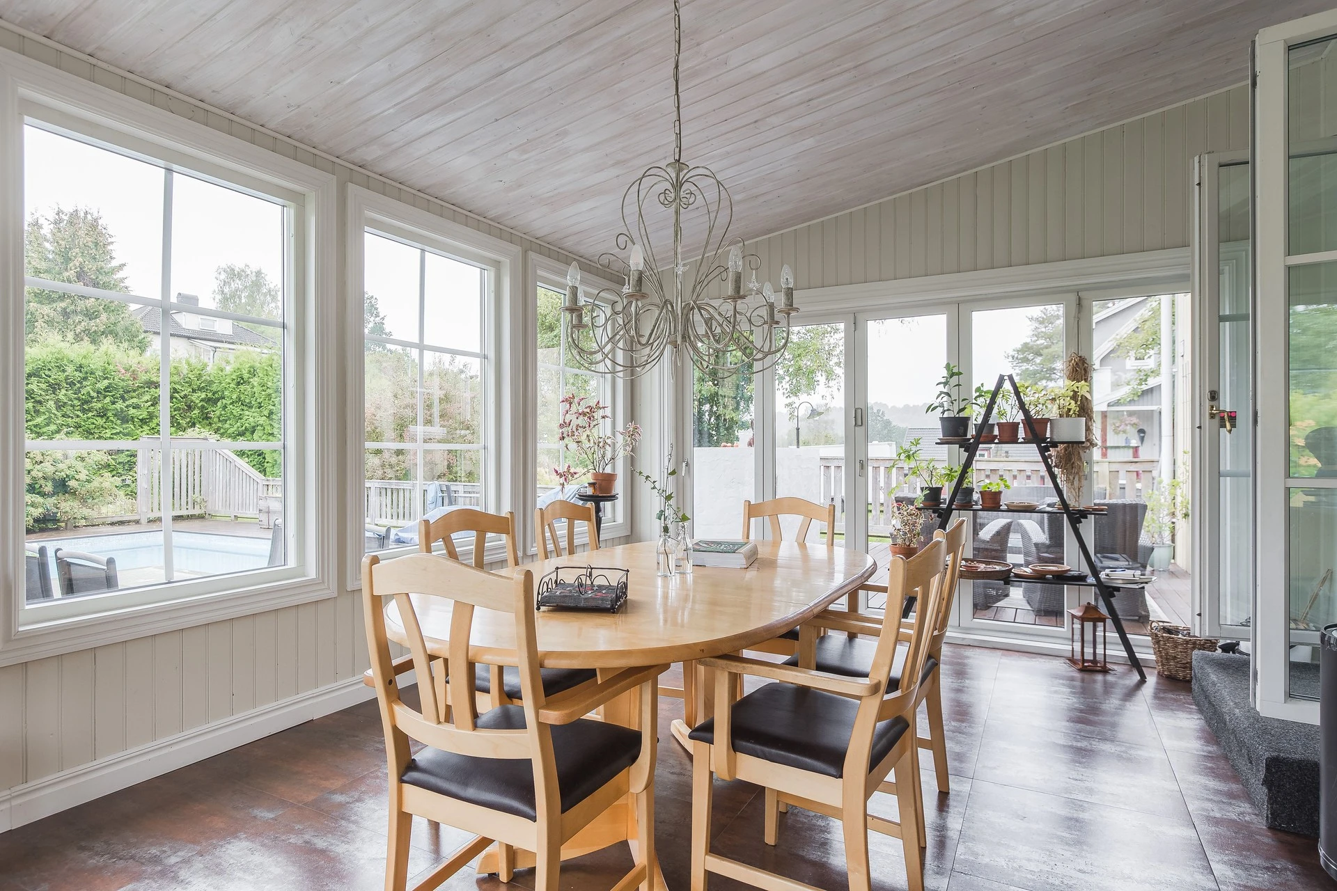 Det stora, inglasade uterummet är ett riktigt extra rum – isolerat och utrustat med golvvärme under stilrena, stora klinkerplattor för maximal komfort året om. Här bjuds du på en underbar utsikt över poolområdet och den grönskande trädgården, samtidigt som de stora skjutdörrarna suddar ut gränsen mellan ute och inne. Oavsett om du njuter av en stilla morgonkaffe, bjuder in till middagar eller vill koppla av med en bok i kvällssolen, är detta en plats som snabbt blir en favorit. En oas för avkoppling, umgänge och livskvalitet – året runt.