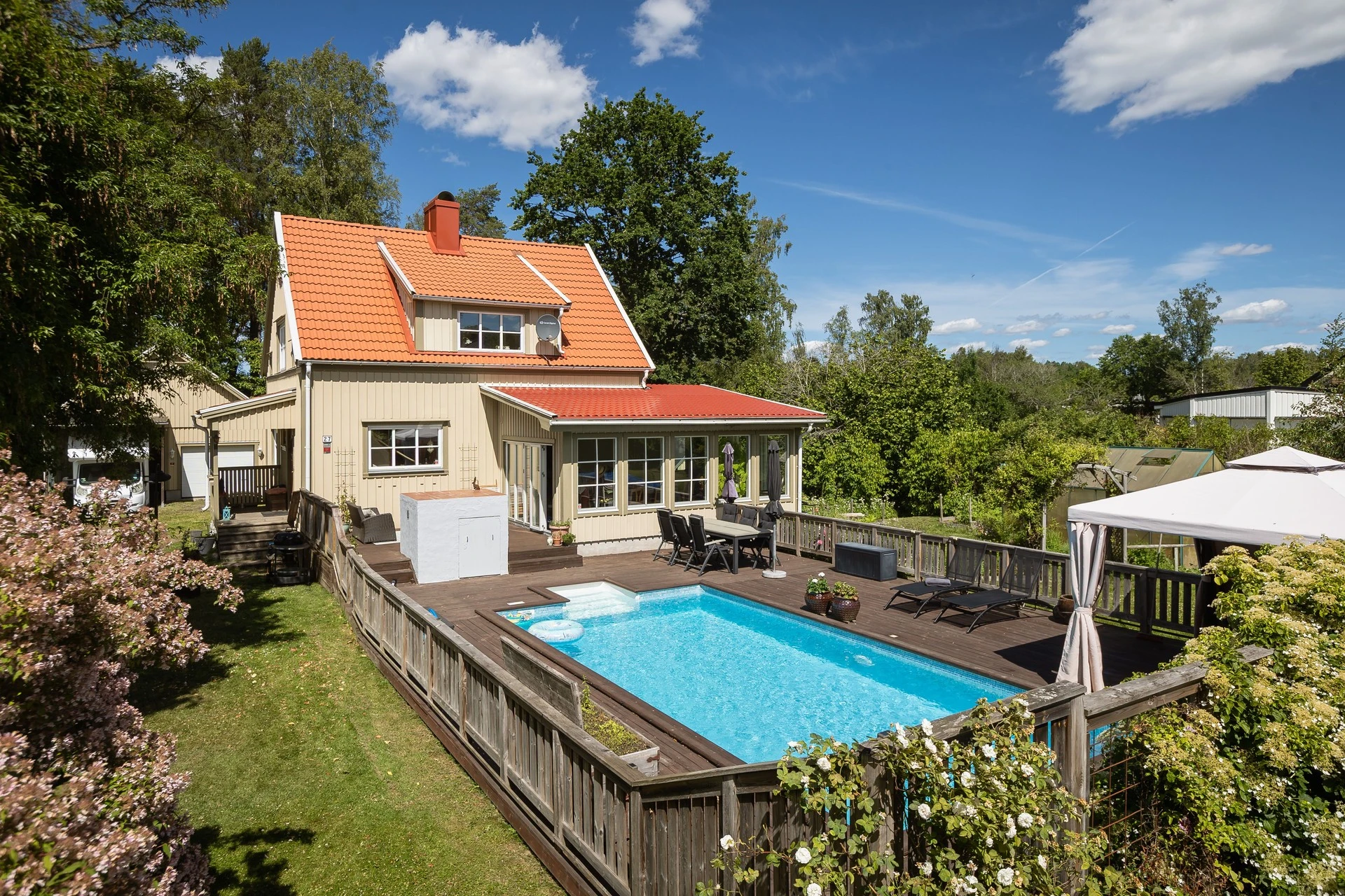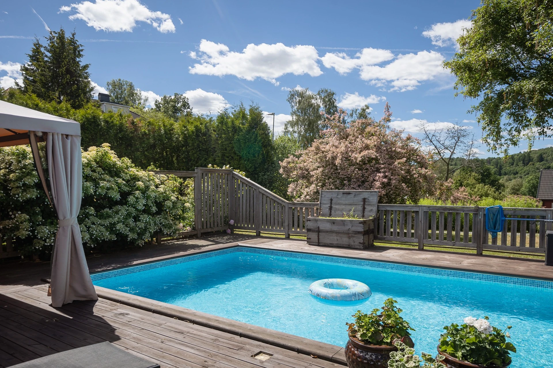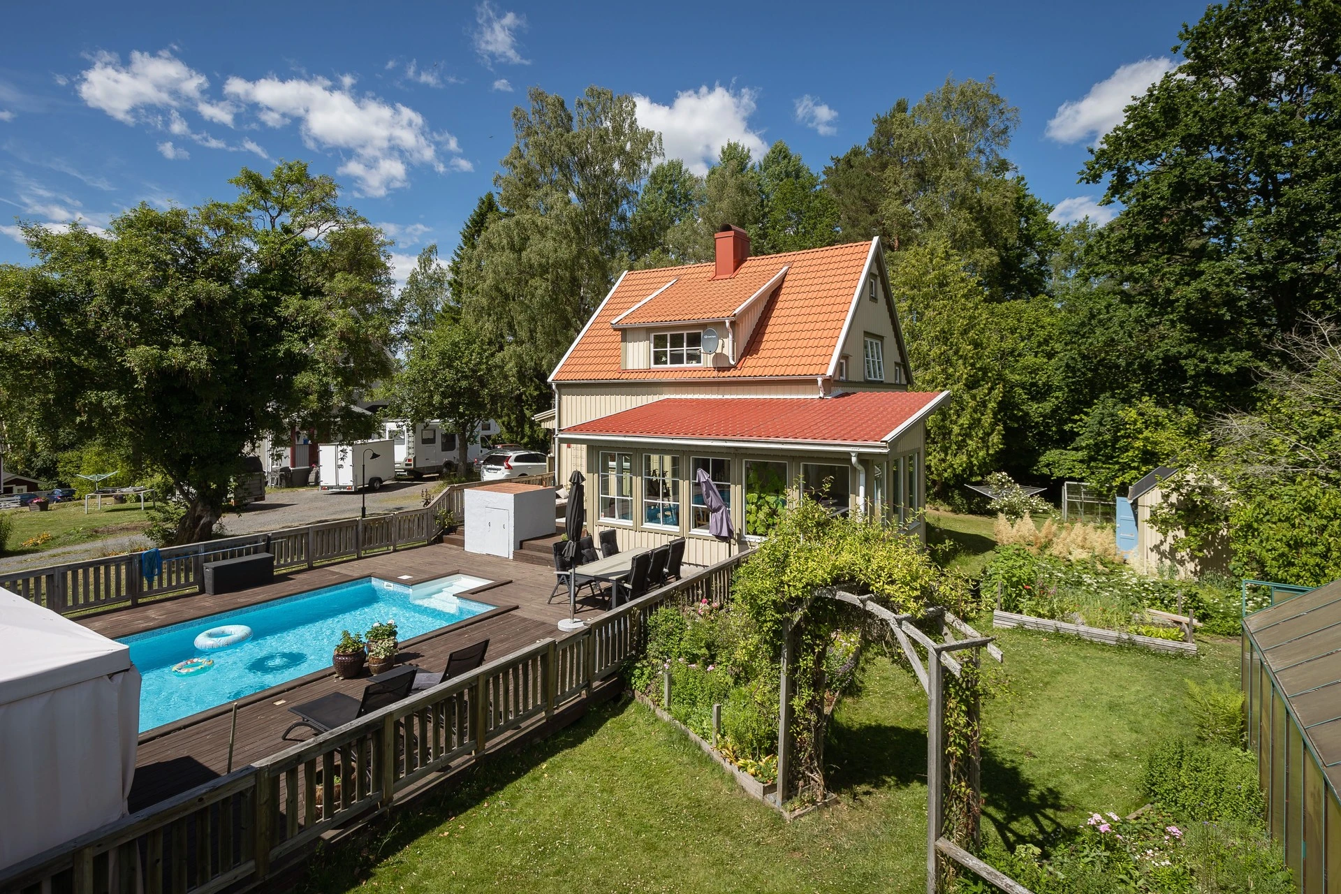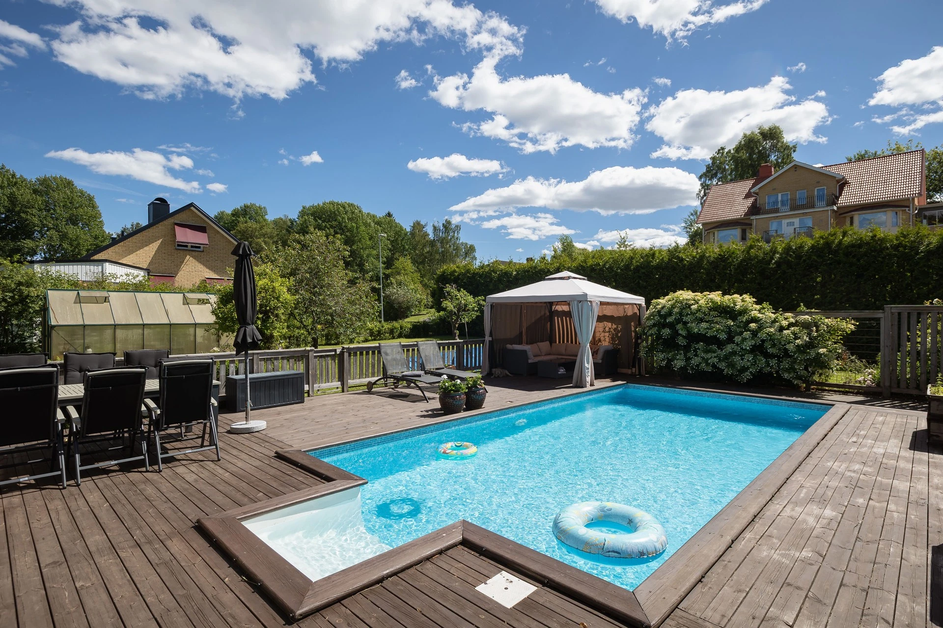Det stora, inglasade uterummet är ett riktigt extra rum – isolerat och utrustat med golvvärme under stilrena, stora klinkerplattor för maximal komfort året om. Här bjuds du på en underbar utsikt över poolområdet och den grönskande trädgården, samtidigt som de stora skjutdörrarna suddar ut gränsen mellan ute och inne. Oavsett om du njuter av en stilla morgonkaffe, bjuder in till middagar eller vill koppla av med en bok i kvällssolen, är detta en plats som snabbt blir en favorit. En oas för avkoppling, umgänge och livskvalitet – året runt.