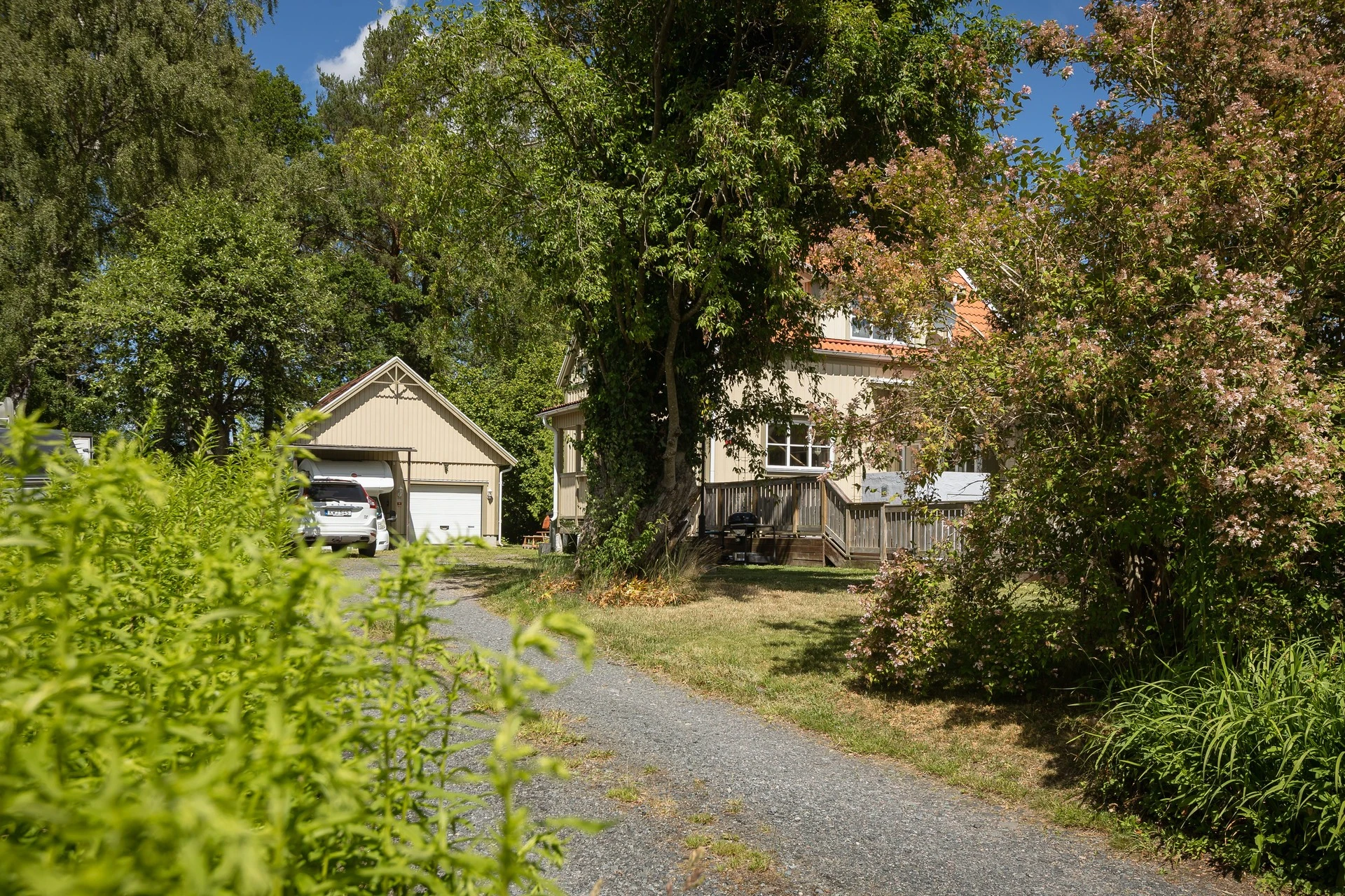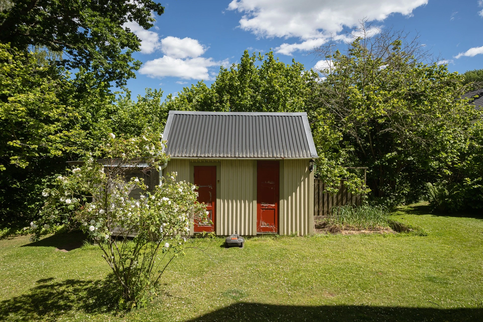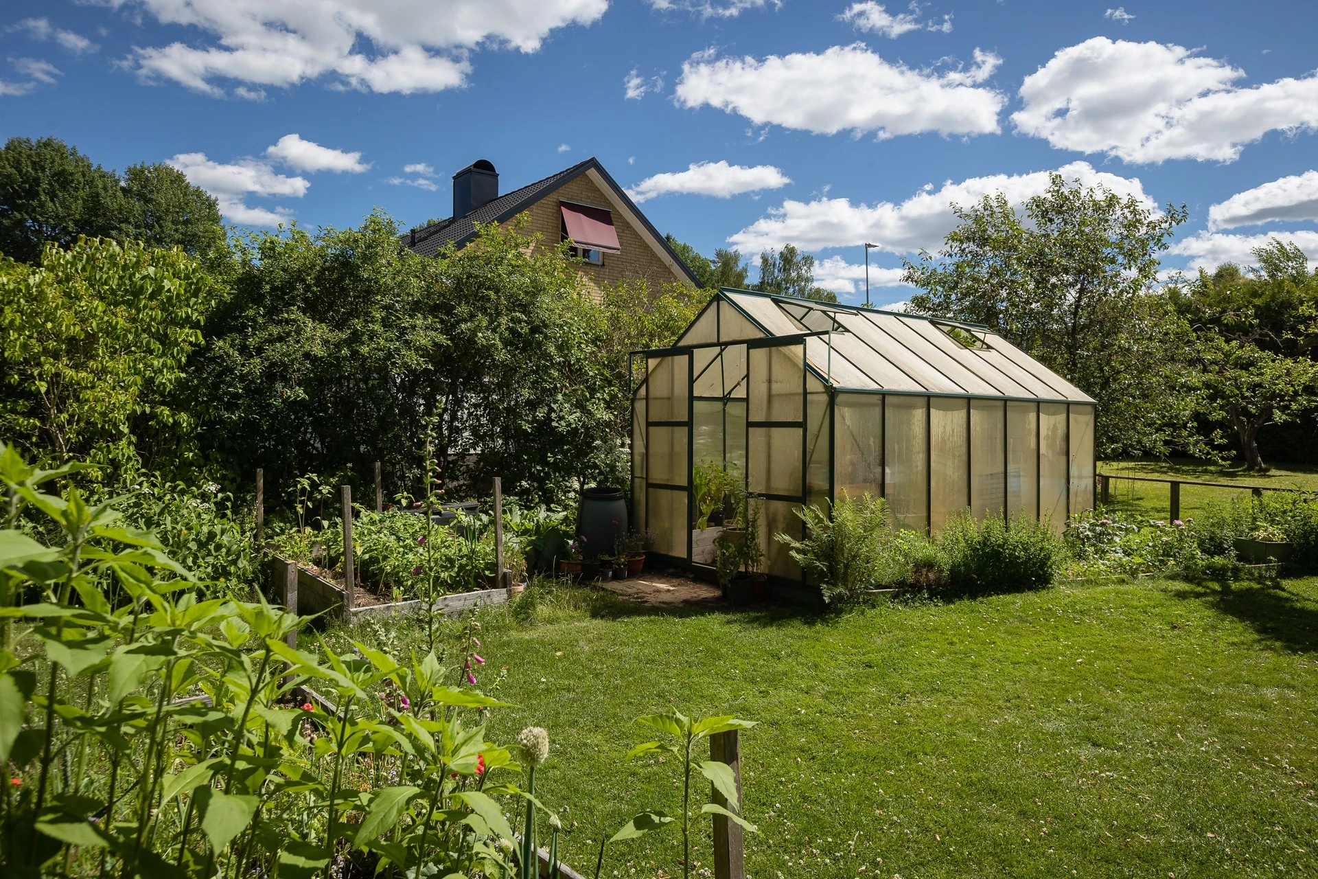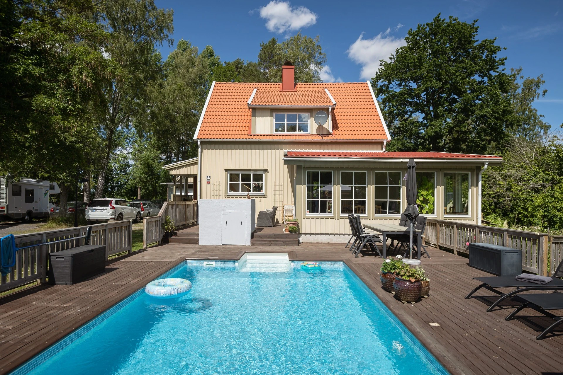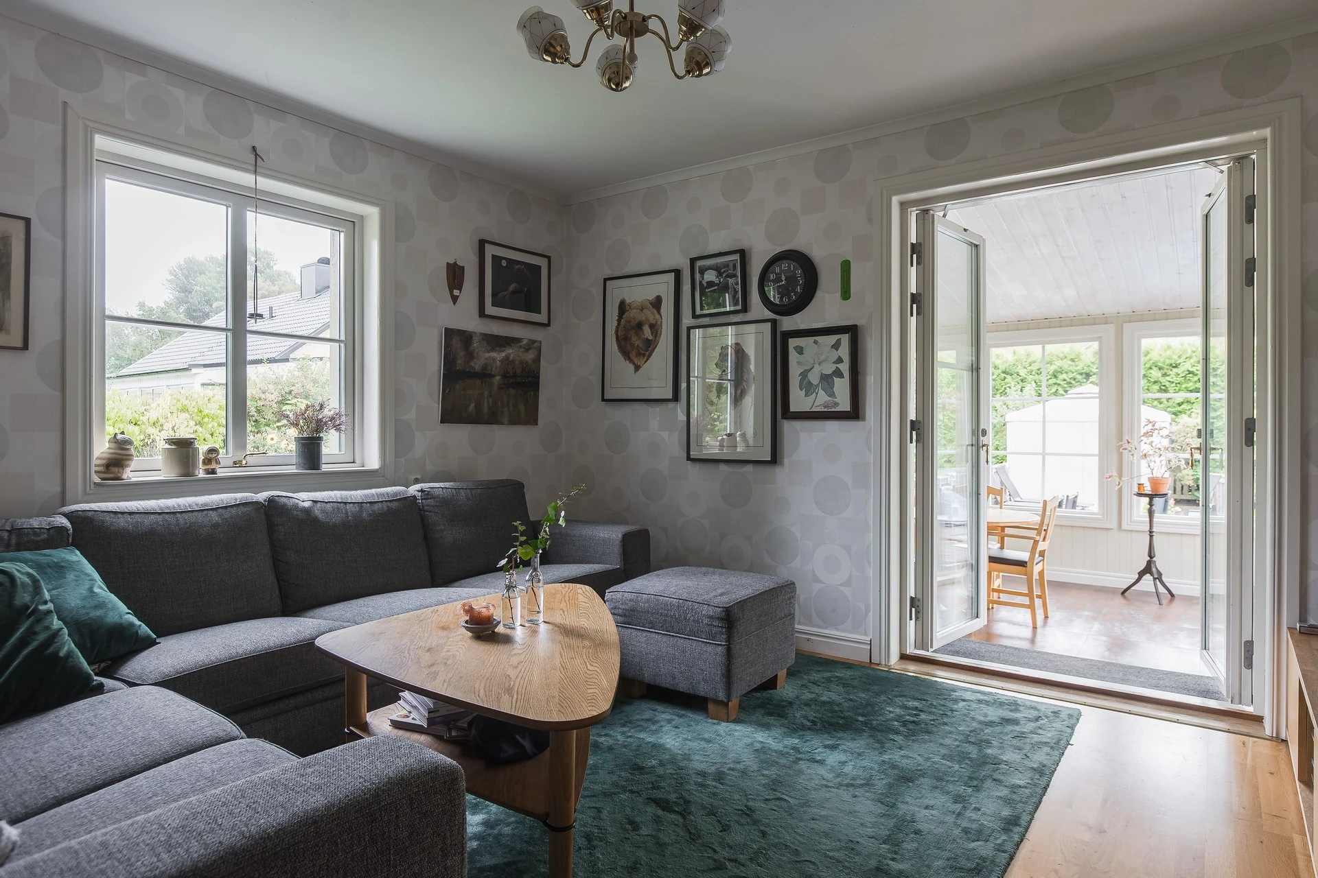 Det stora, inglasade uterummet är ett riktigt extra rum – isolerat och utrustat med golvvärme under stilrena, stora klinkerplattor för maximal komfort året om. Här bjuds du på en underbar utsikt över poolområdet och den grönskande trädgården, samtidigt som de stora skjutdörrarna suddar ut gränsen mellan ute och inne. Oavsett om du njuter av en stilla morgonkaffe, bjuder in till middagar eller vill koppla av med en bok i kvällssolen, är detta en plats som snabbt blir en favorit. En oas för avkoppling, umgänge och livskvalitet – året runt.