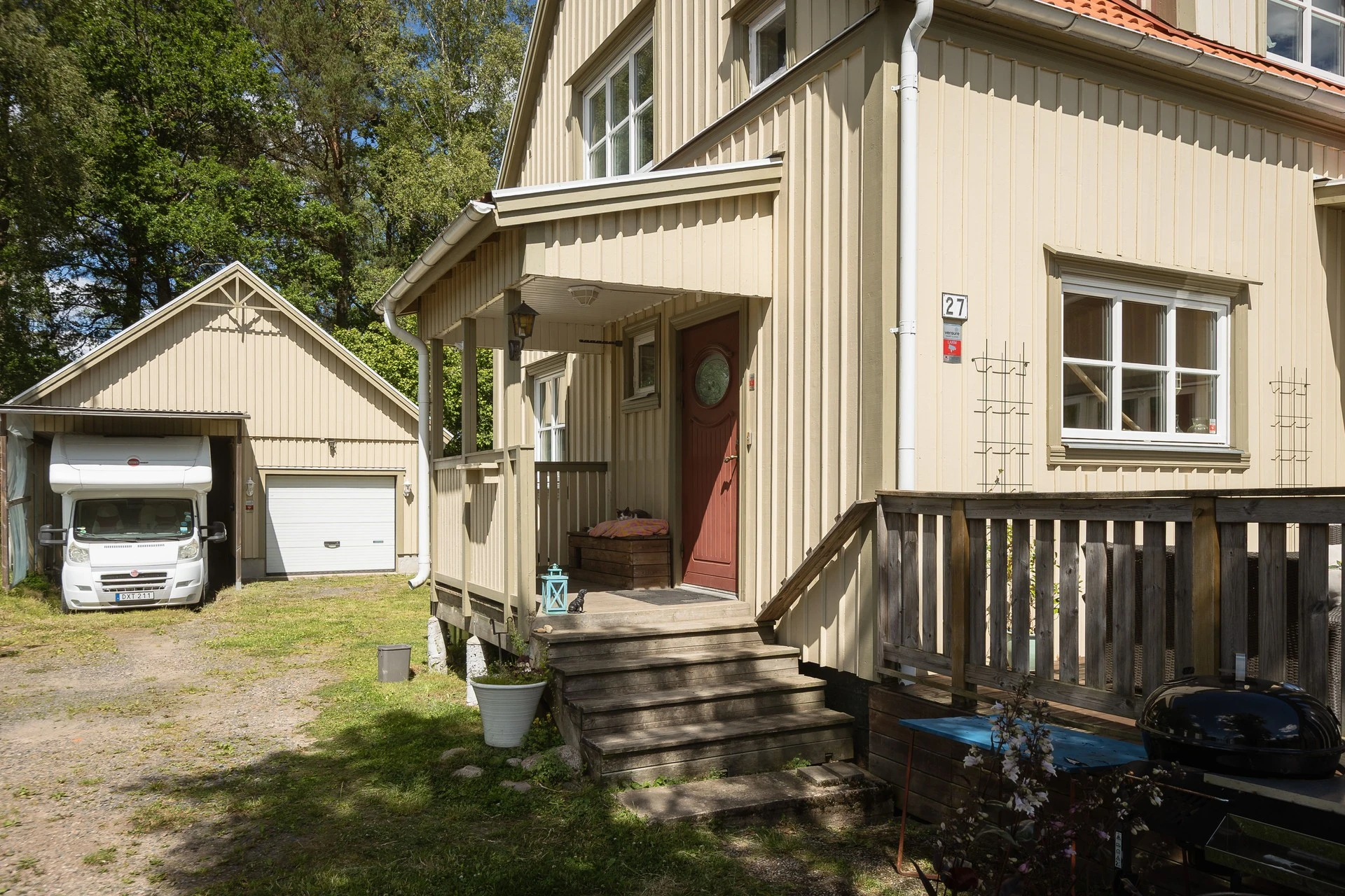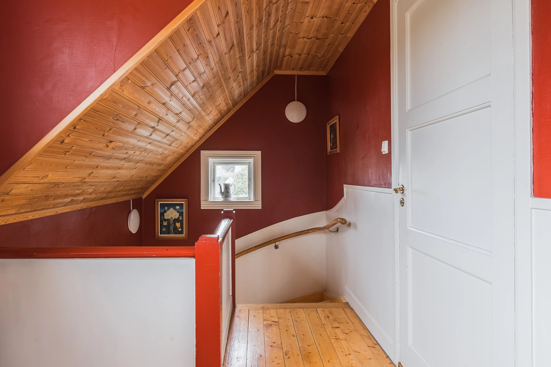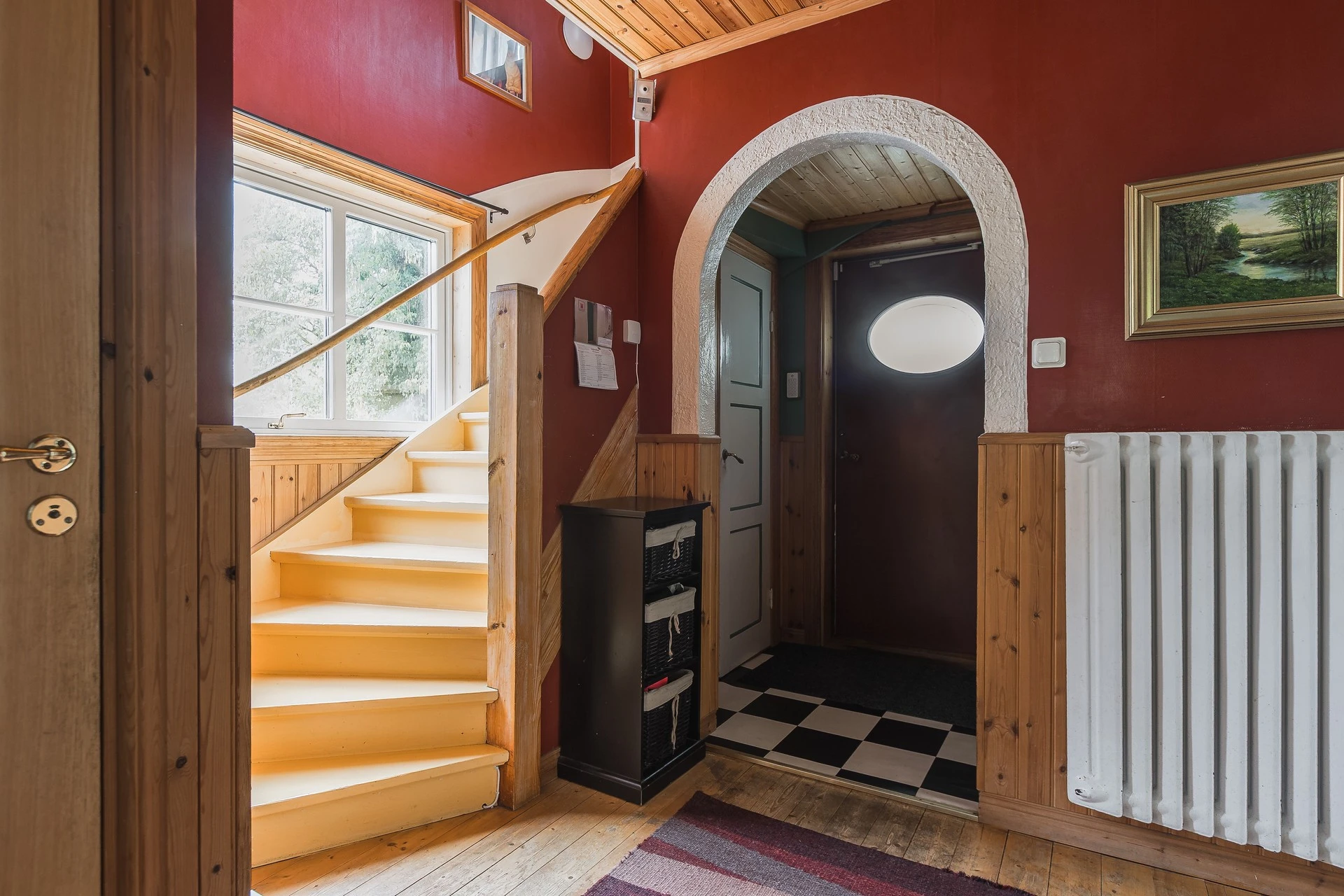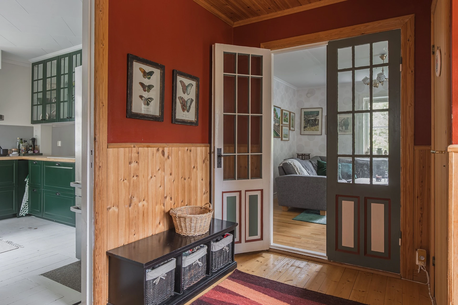 Entréhall med god plats för klädavhängning. Träpaneltak samt bröstpanel. Från entrén finns trappa ned till källarplanet.