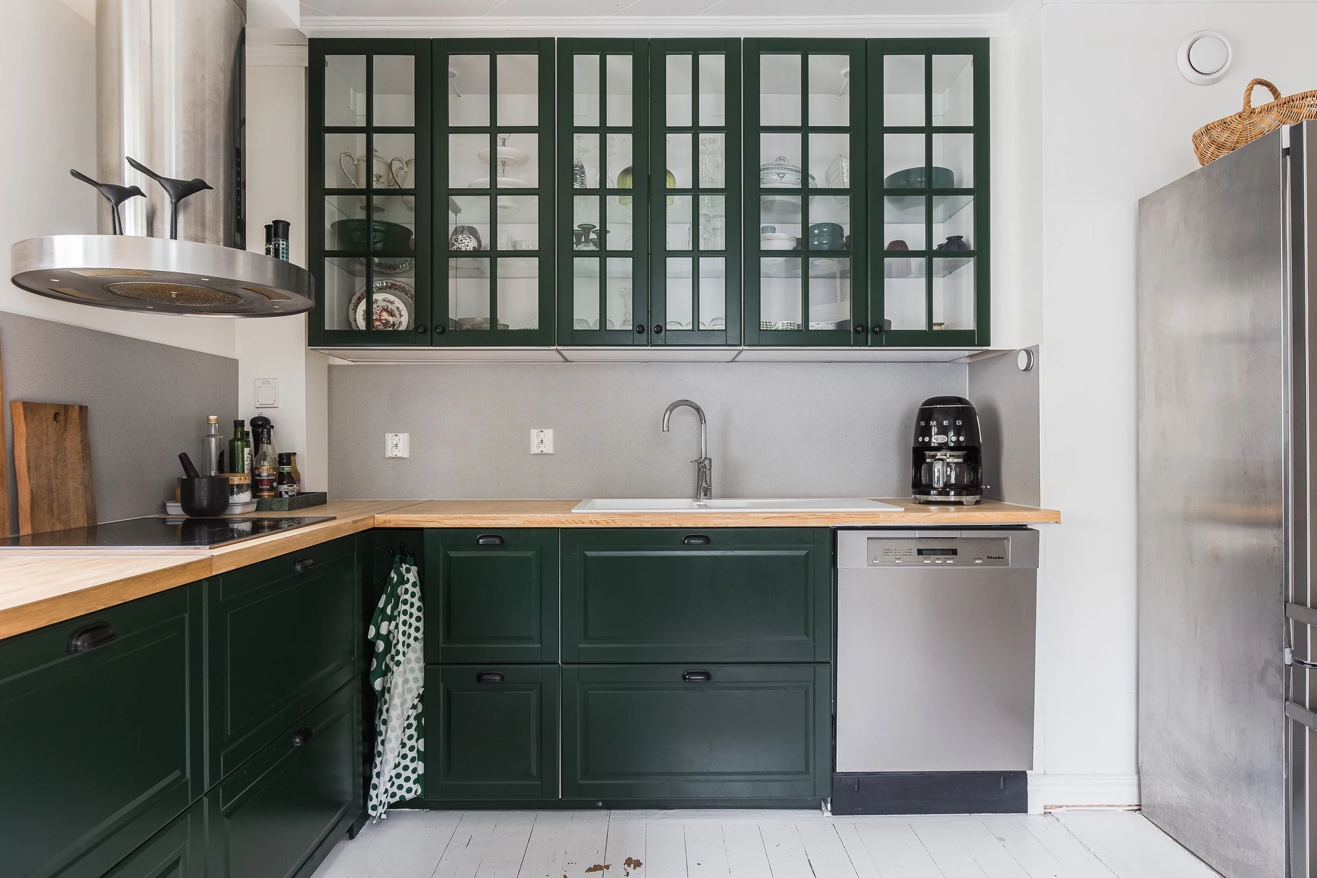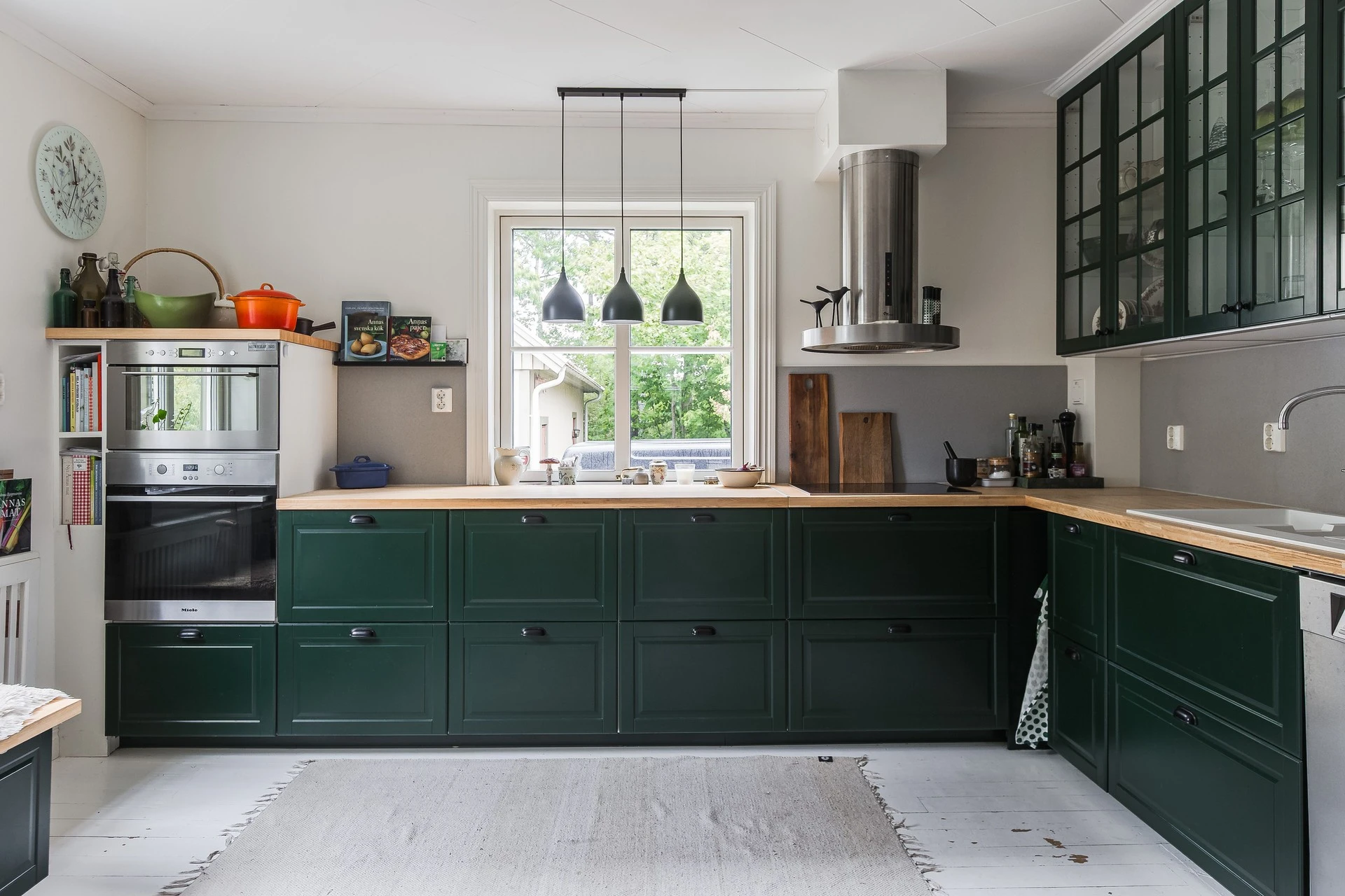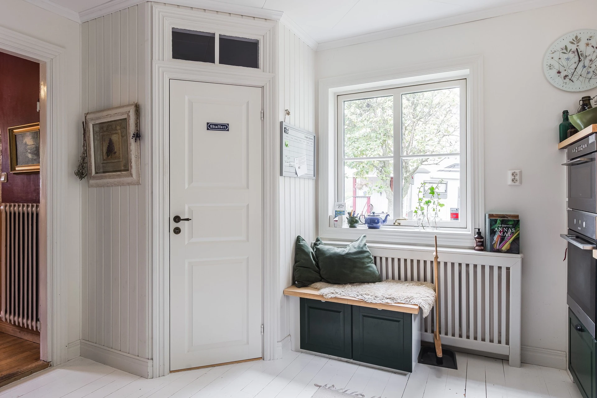 Köket är en riktig pärla med generösa arbetsytor och ett fantastiskt ljusinsläpp från fönster i två väderstreck – här blir matlagningen en fröjd oavsett tid på dygnet. De mörkgröna skåpsluckorna ger rummet en elegant och tidlös karaktär, vackert kontrasterade mot det vitmålade trägolvet som adderar en ljus och luftig känsla. De charmiga vitrinskåpen skapar både praktisk förvaring och möjlighet att låta favoriterna stå framme. Praktiskt skafferiet ger extra utrymme för förvaring och bidrar till att hålla köket välorganiserat.