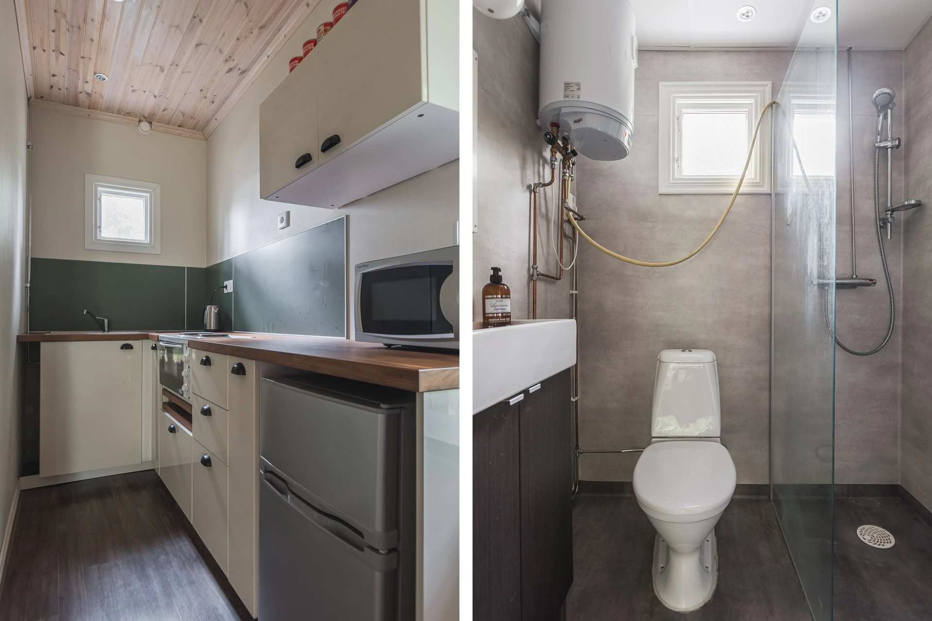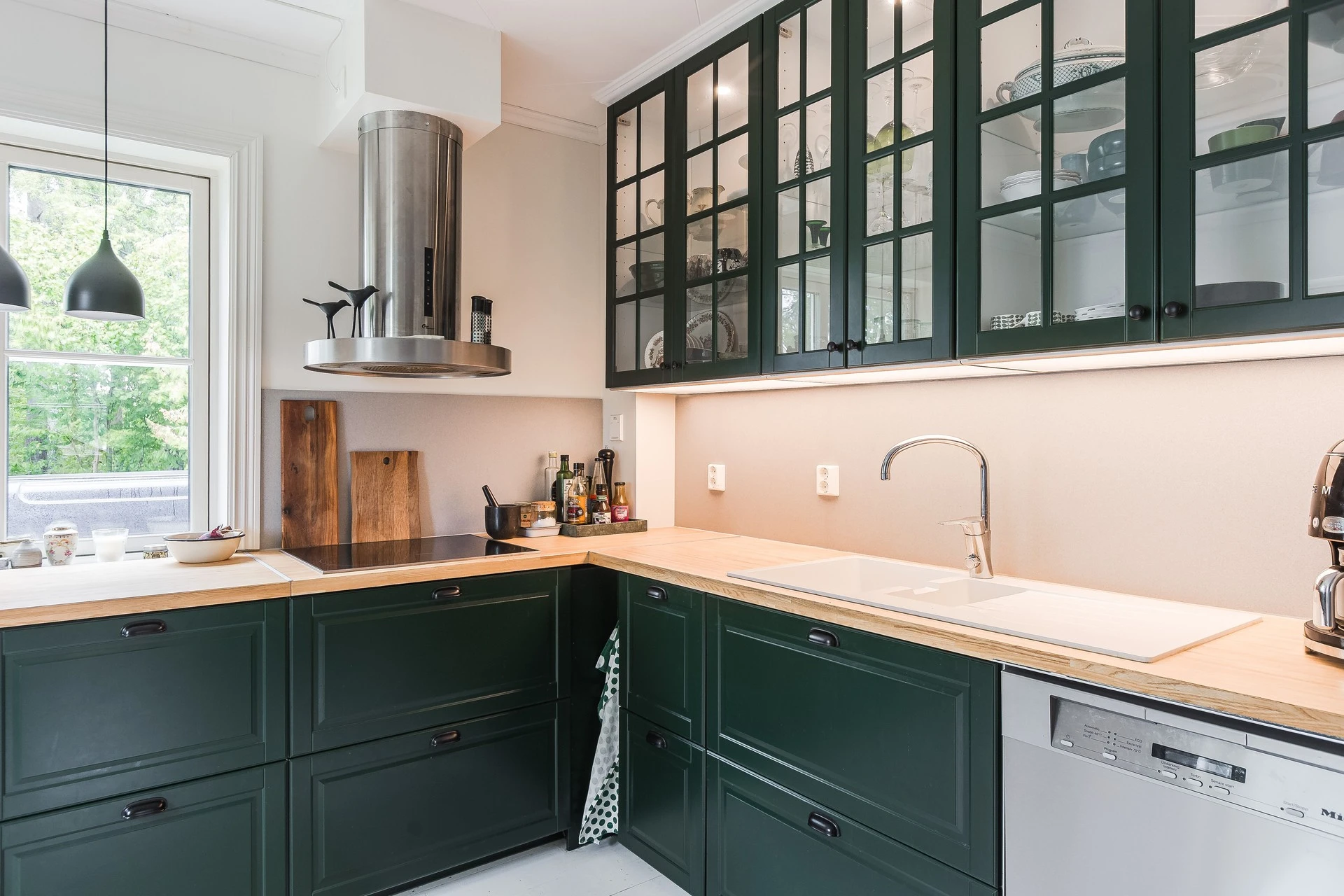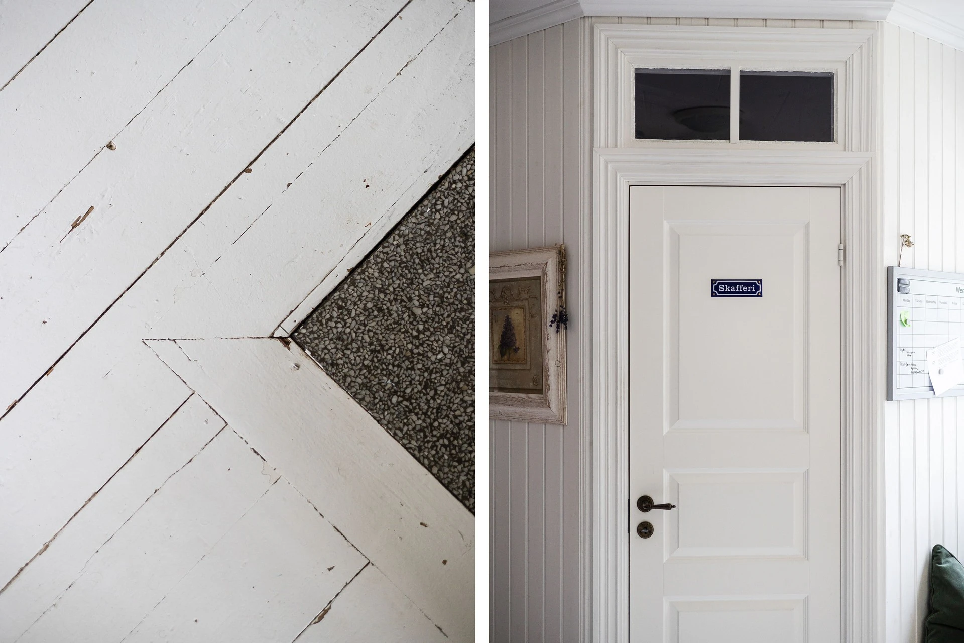 Köket är en riktig pärla med generösa arbetsytor och ett fantastiskt ljusinsläpp från fönster i två väderstreck – här blir matlagningen en fröjd oavsett tid på dygnet. De mörkgröna skåpsluckorna ger rummet en elegant och tidlös karaktär, vackert kontrasterade mot det vitmålade trägolvet som adderar en ljus och luftig känsla. De charmiga vitrinskåpen skapar både praktisk förvaring och möjlighet att låta favoriterna stå framme. Praktiskt skafferiet ger extra utrymme för förvaring och bidrar till att hålla köket välorganiserat.