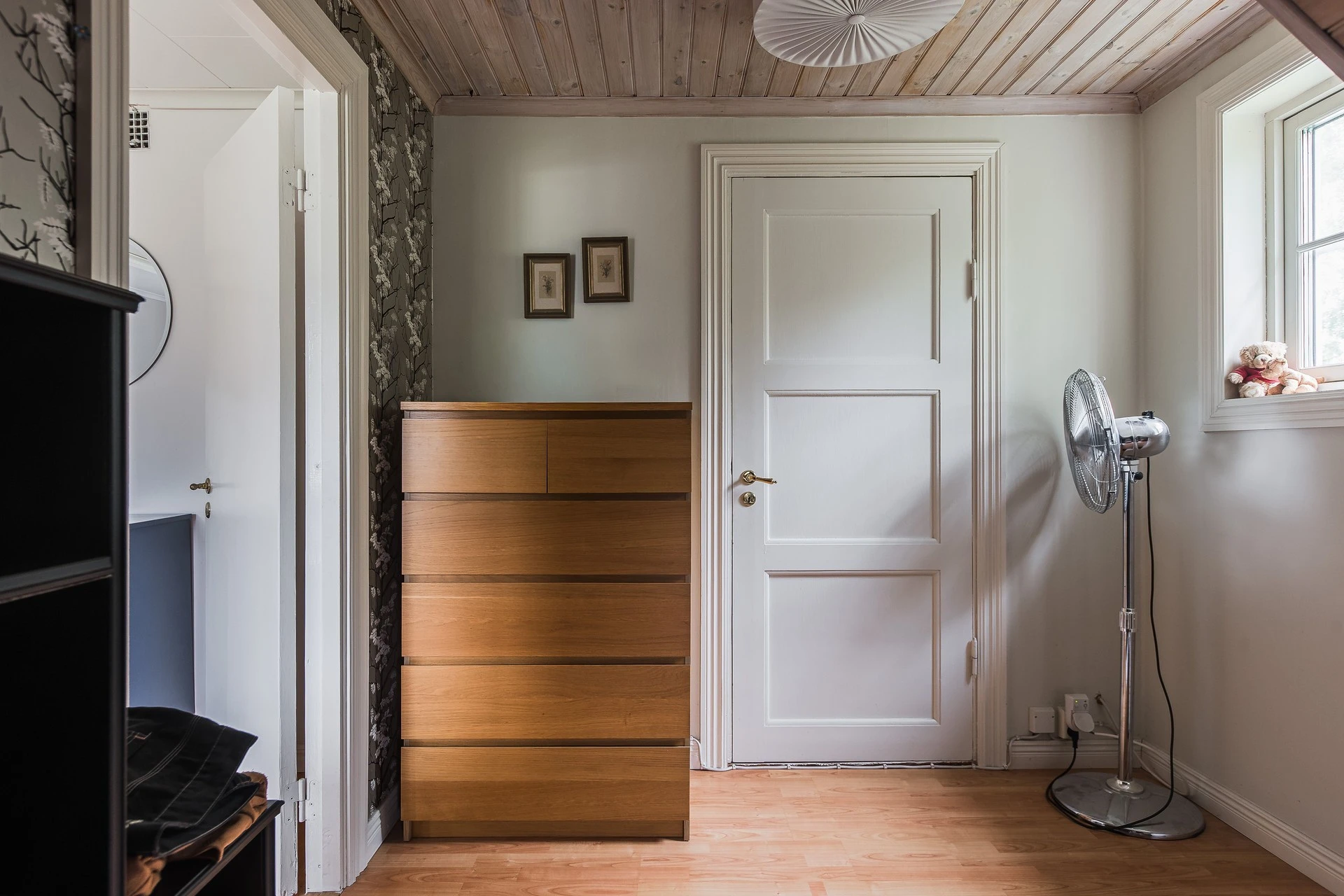 Sovrum med fönster mot väster. Trägolv och förvaringsmöjlighet finns genom en inbyggd garderob.