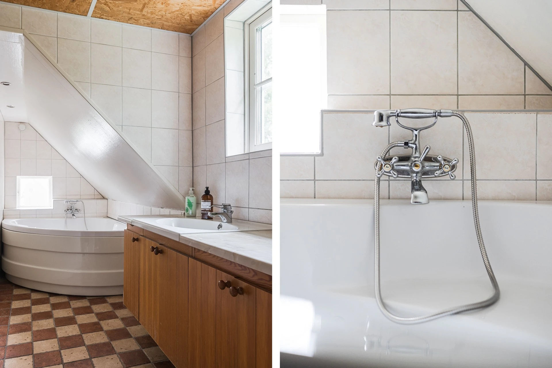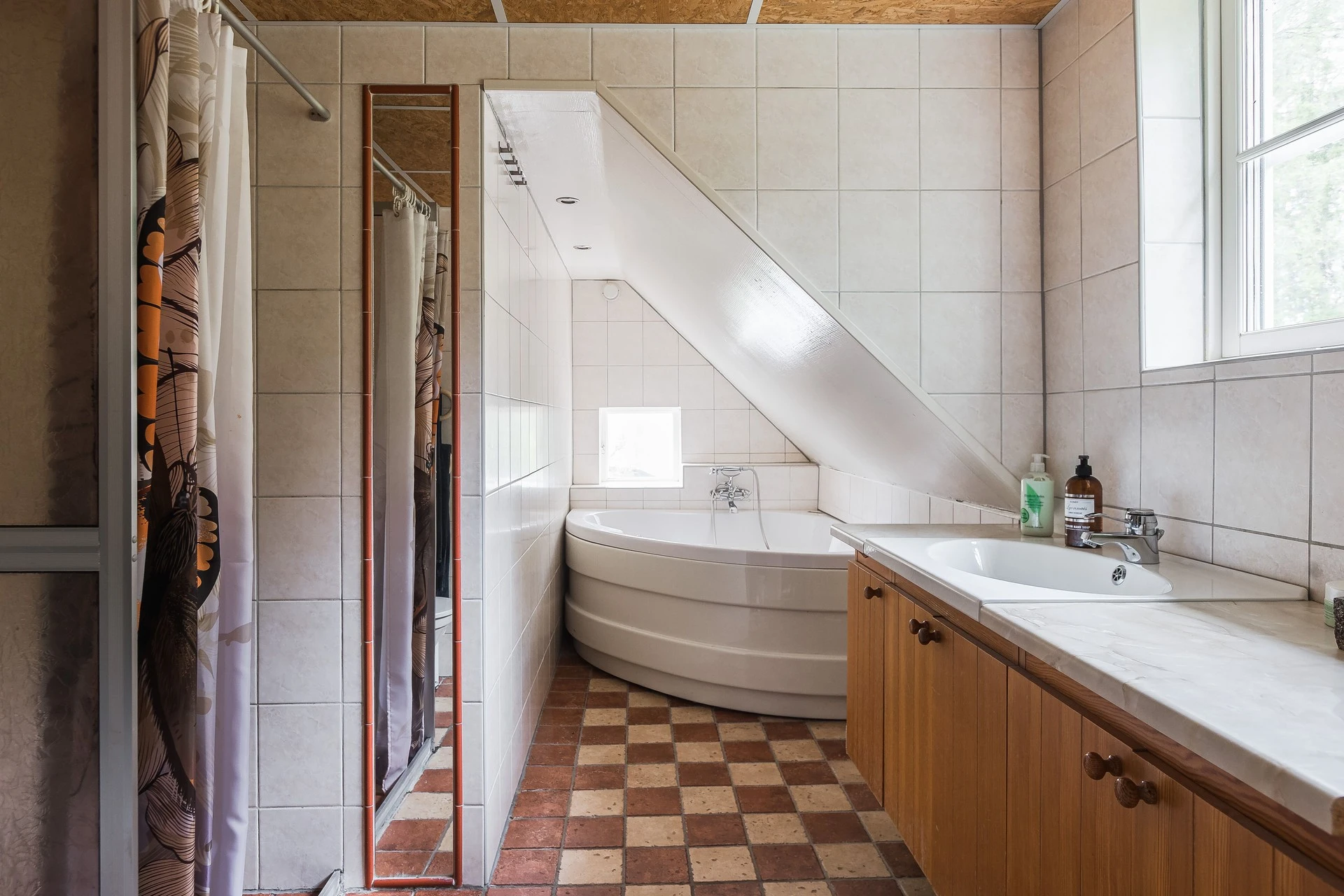 Rymligt badrum med klinkergolv och kaklade väggar.