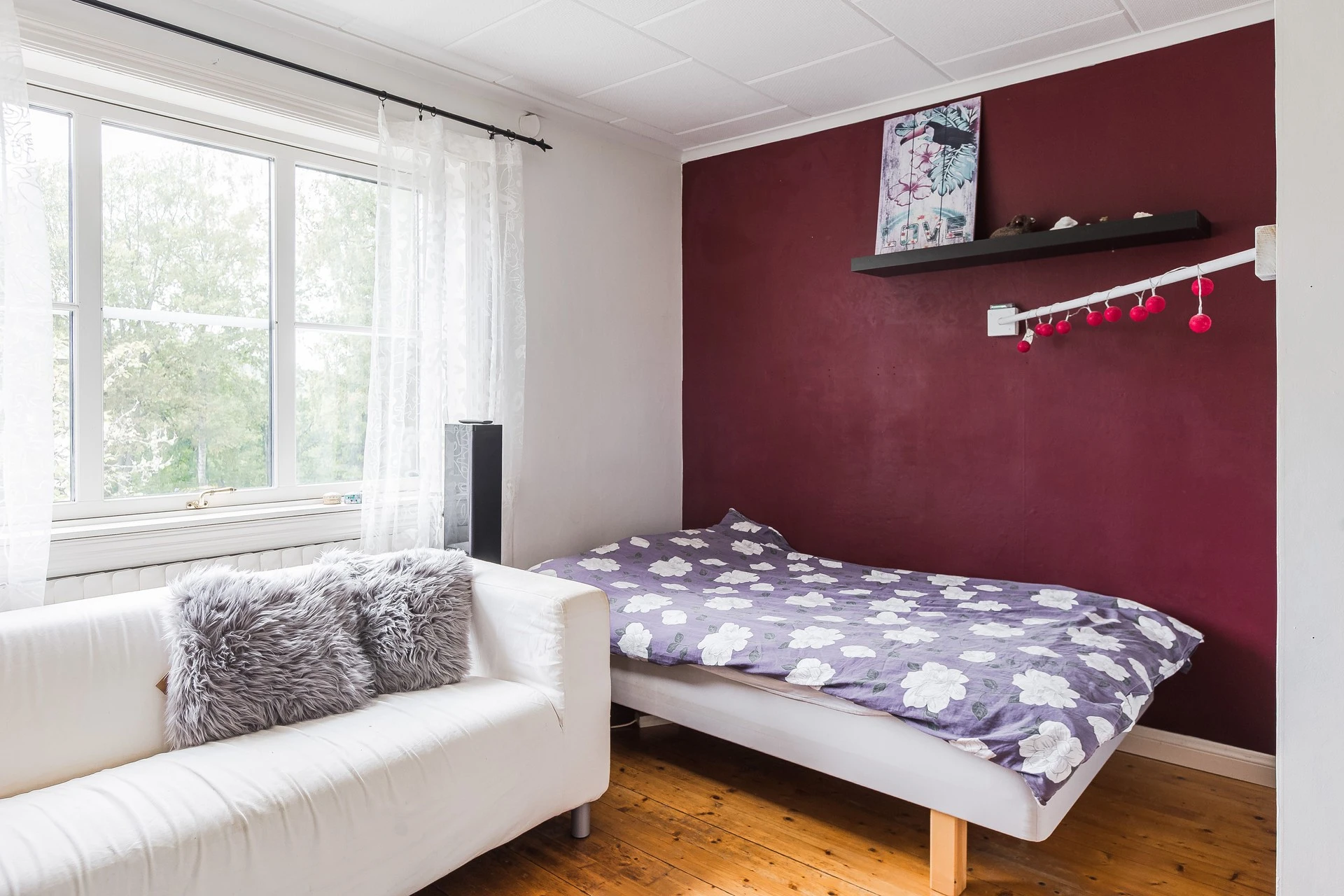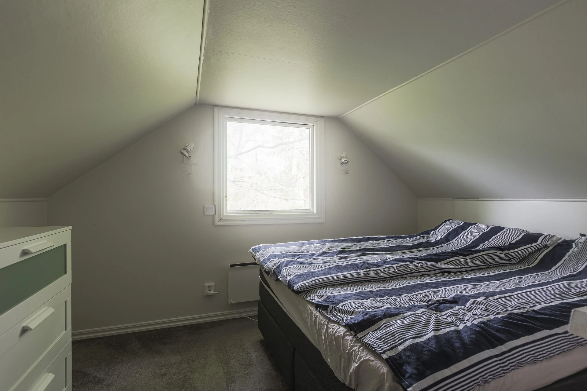 Trivsamt sovrum med fönster mot öster. Plats för dubbelsäng finns, trägolv och väggarna är i ljus kulör.