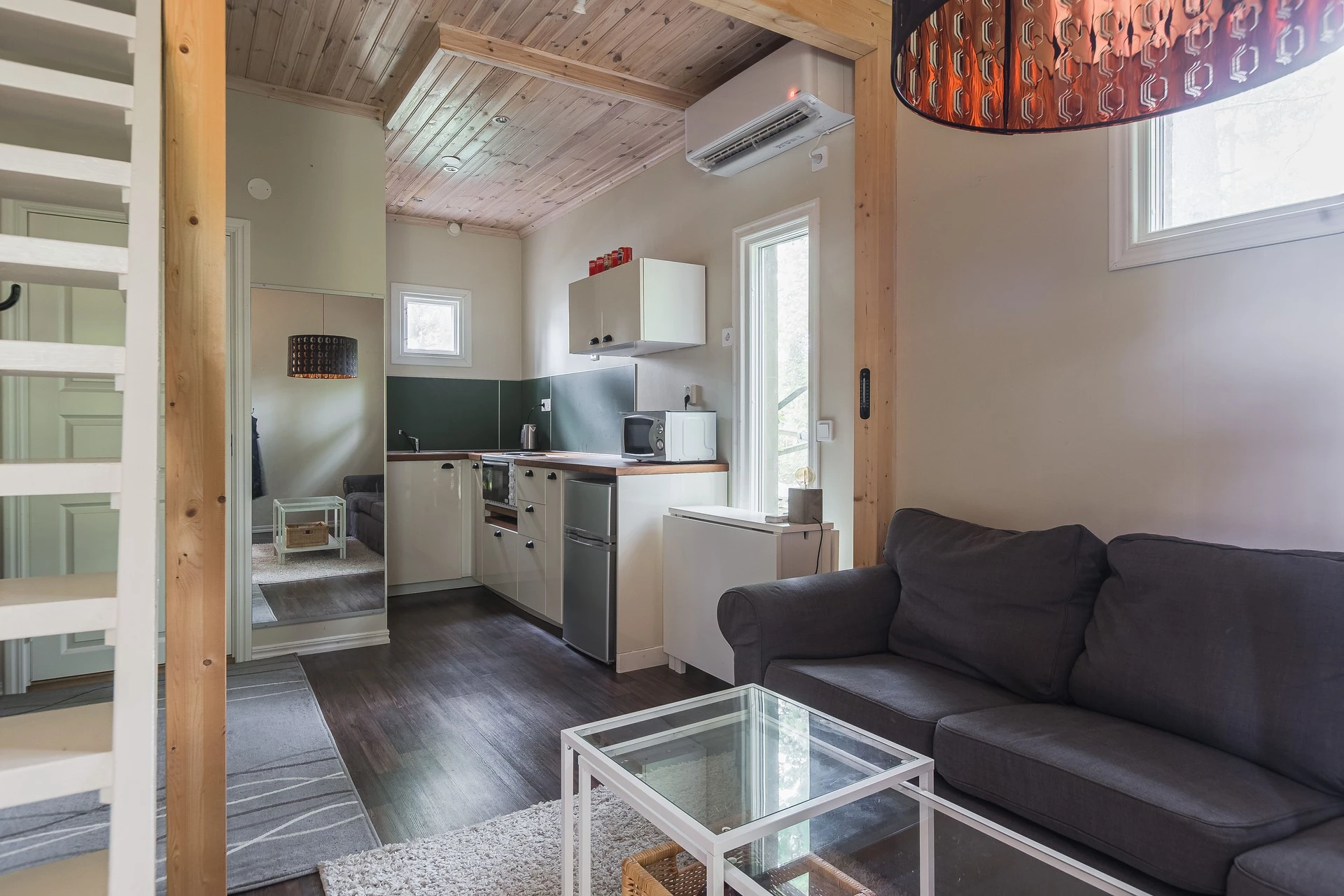 Trivsamt vardagsrum med parkettgolv och fönster mot öster. Från vardagsrummet når man det tillbyggda sällskapsrummet.