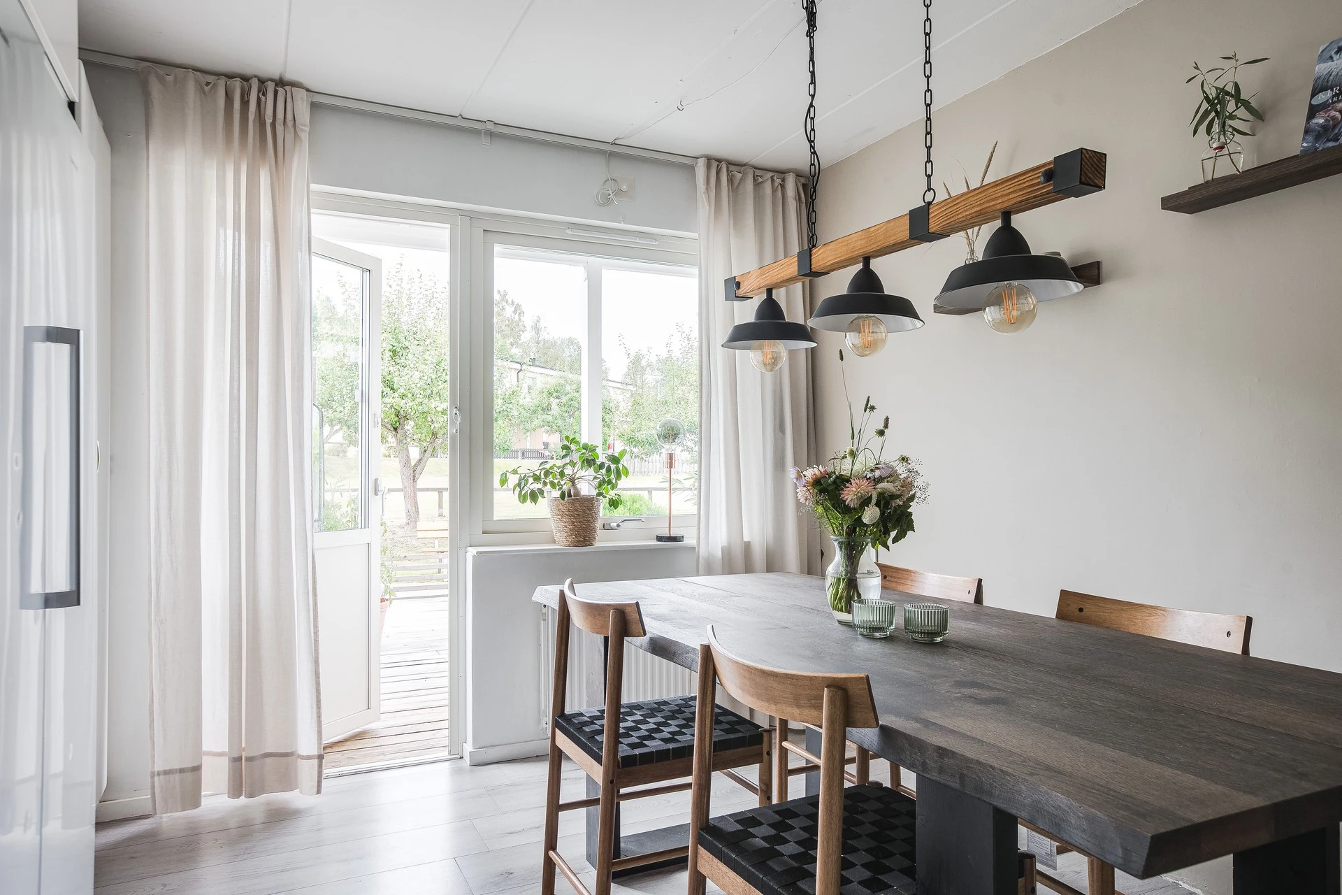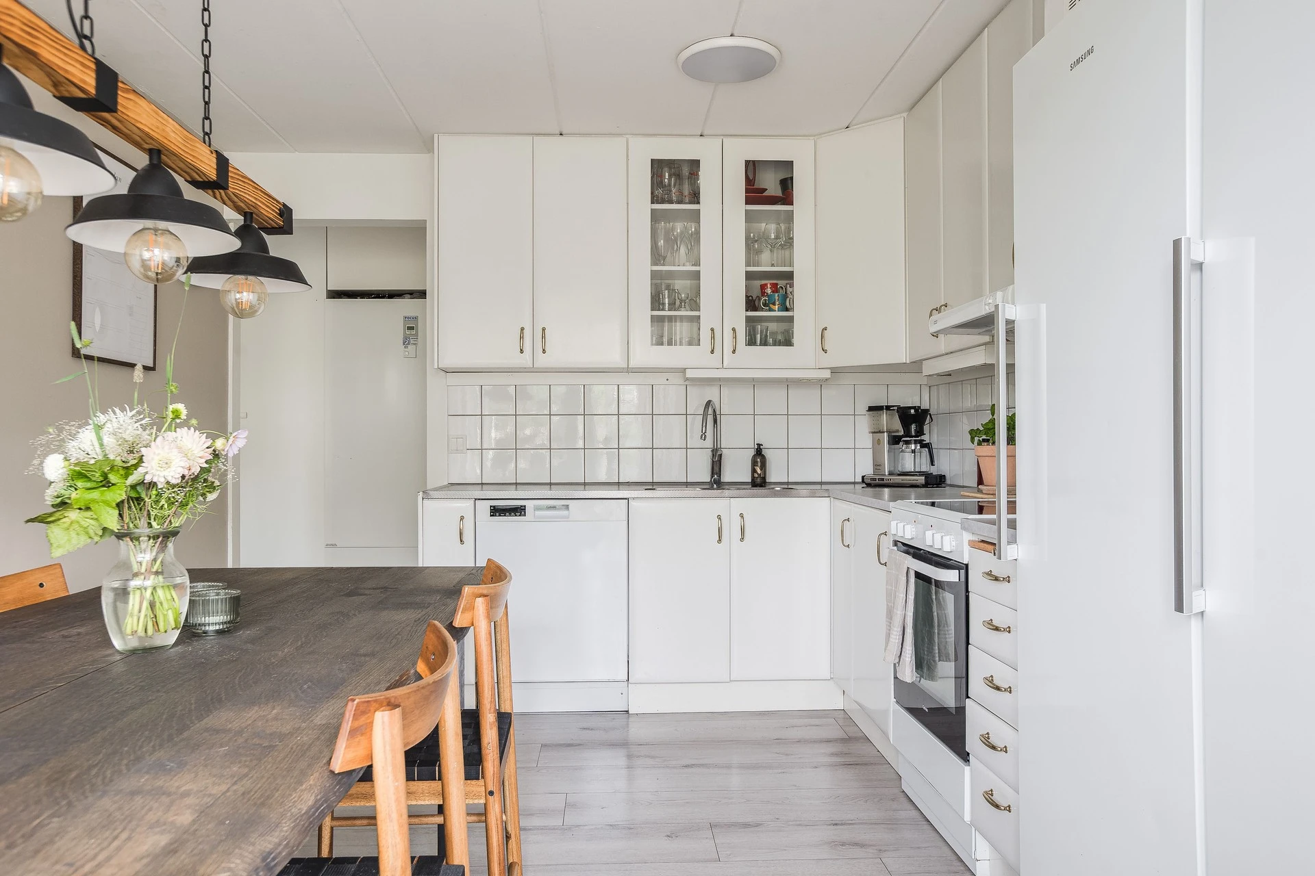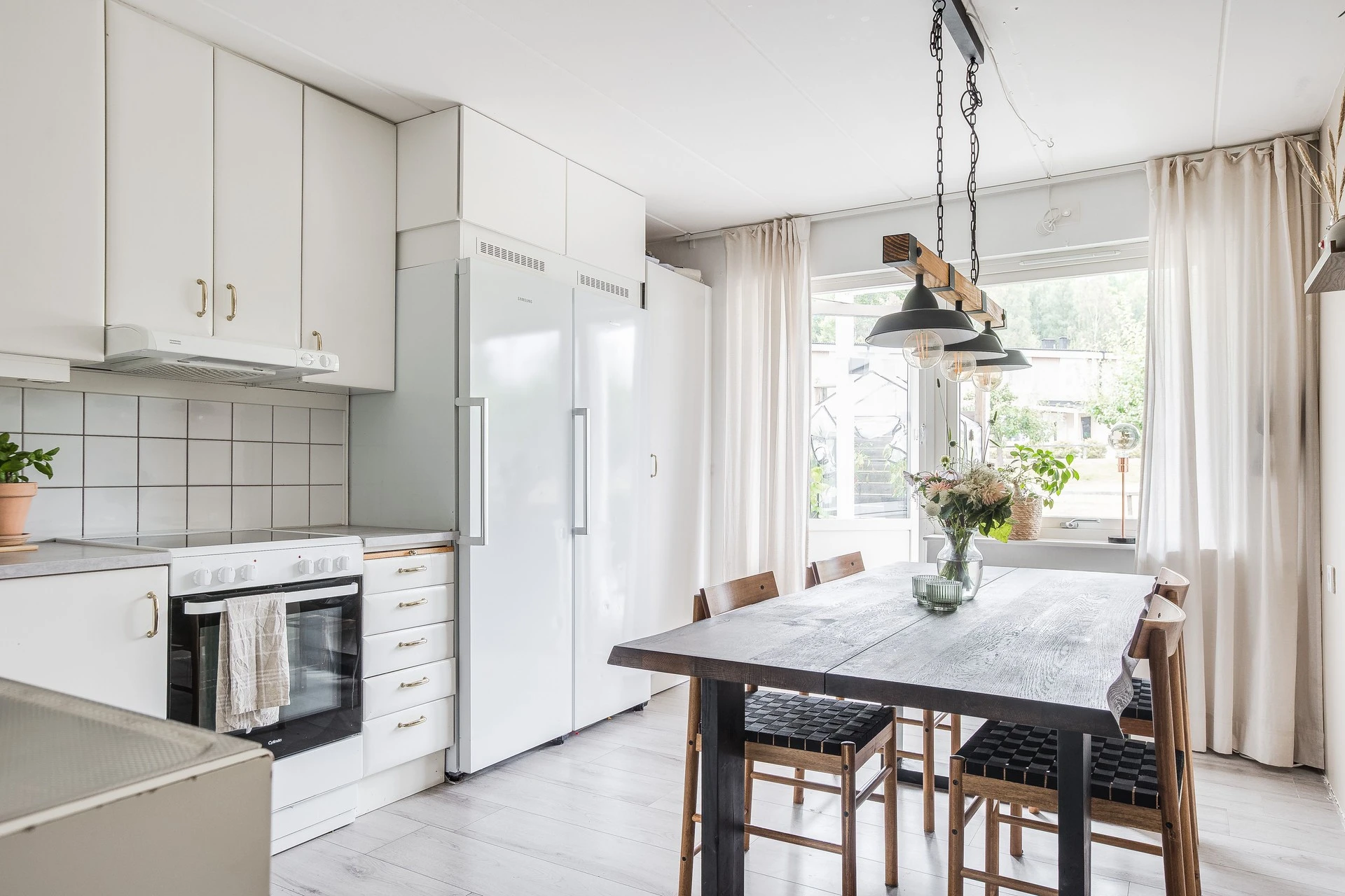 Köket är klassiskt och tidlöst med vita skåpluckor, ljusa ytskikt och gott om både arbetsyta och förvaring. Här finns plats för matbord vid fönstret, och den naturliga kontakten med uteplatsen på framsidan gör rummet extra inbjudande – perfekt när du vill duka upp frukosten utomhus eller låta vardagen flyta sömlöst mellan inne och ute. Ett kök som fungerar lika bra till vardag som till fest, med gott om rymd för både matlagning och umgänge. Kyl, frys och diskmaskin från 2022.