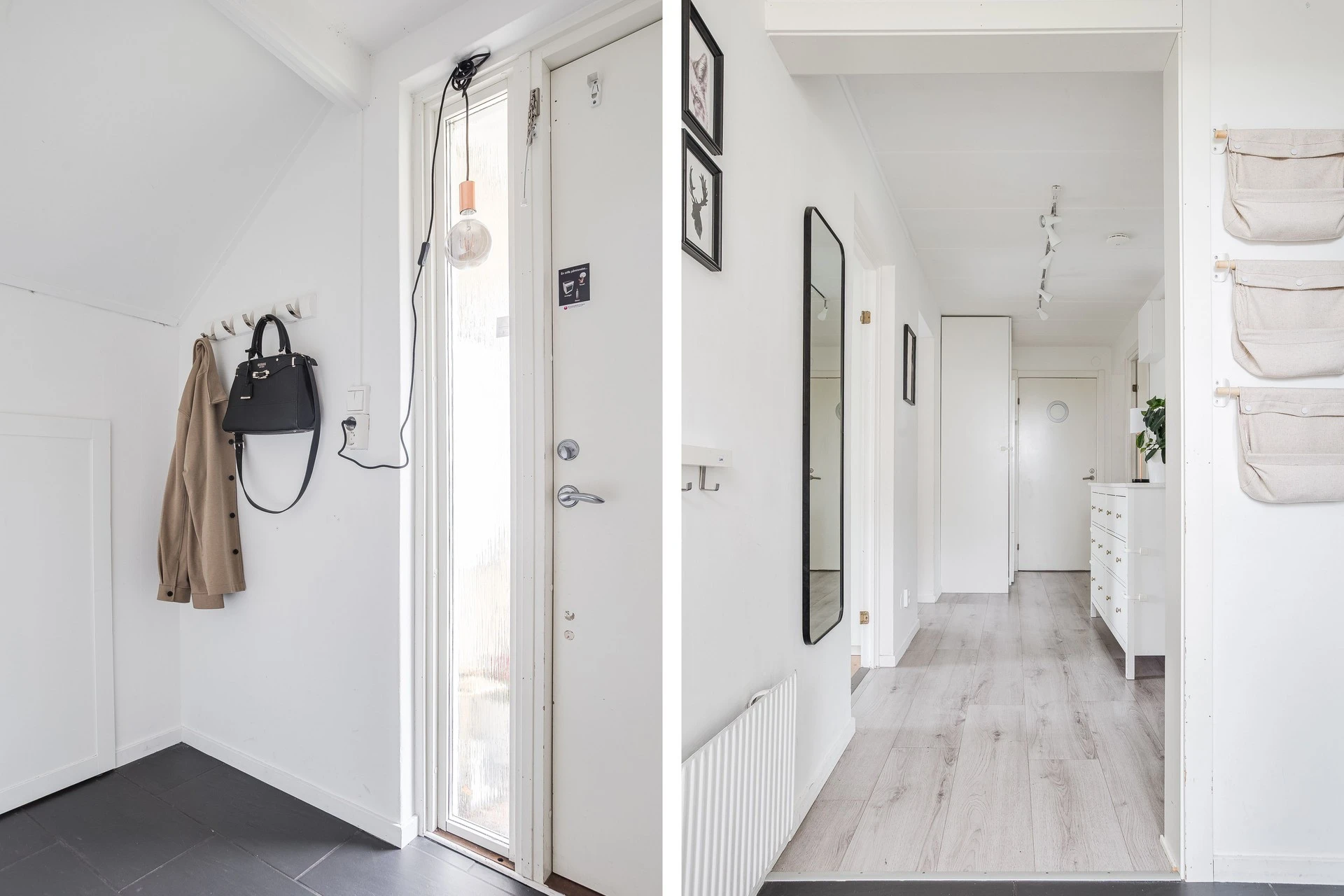 Välkommen in! Här kan du hänga av dig ytterkläder och skor. På golvet ligger klinkergolv och väggarna är ljusa. Här finns även ett mindre förråd som löser förvaringen.
