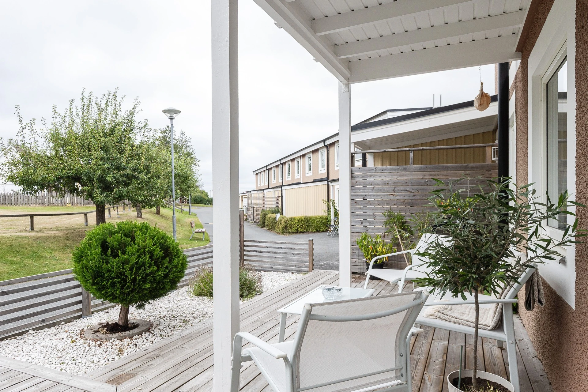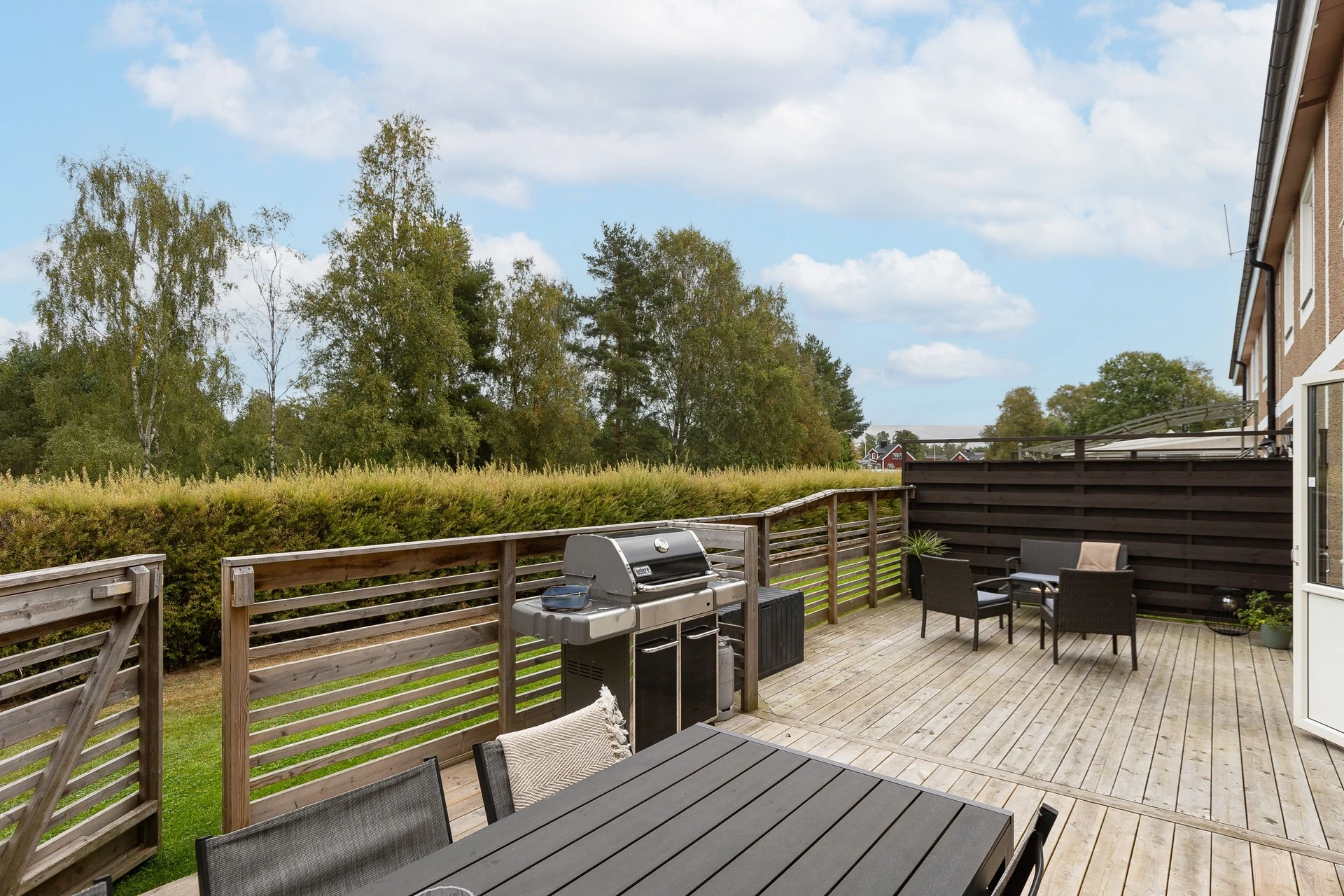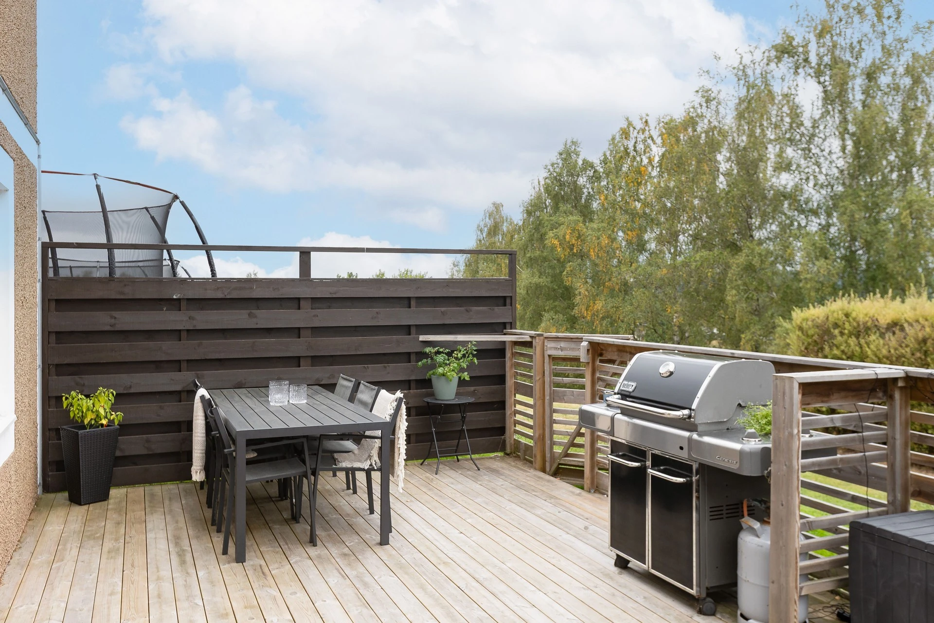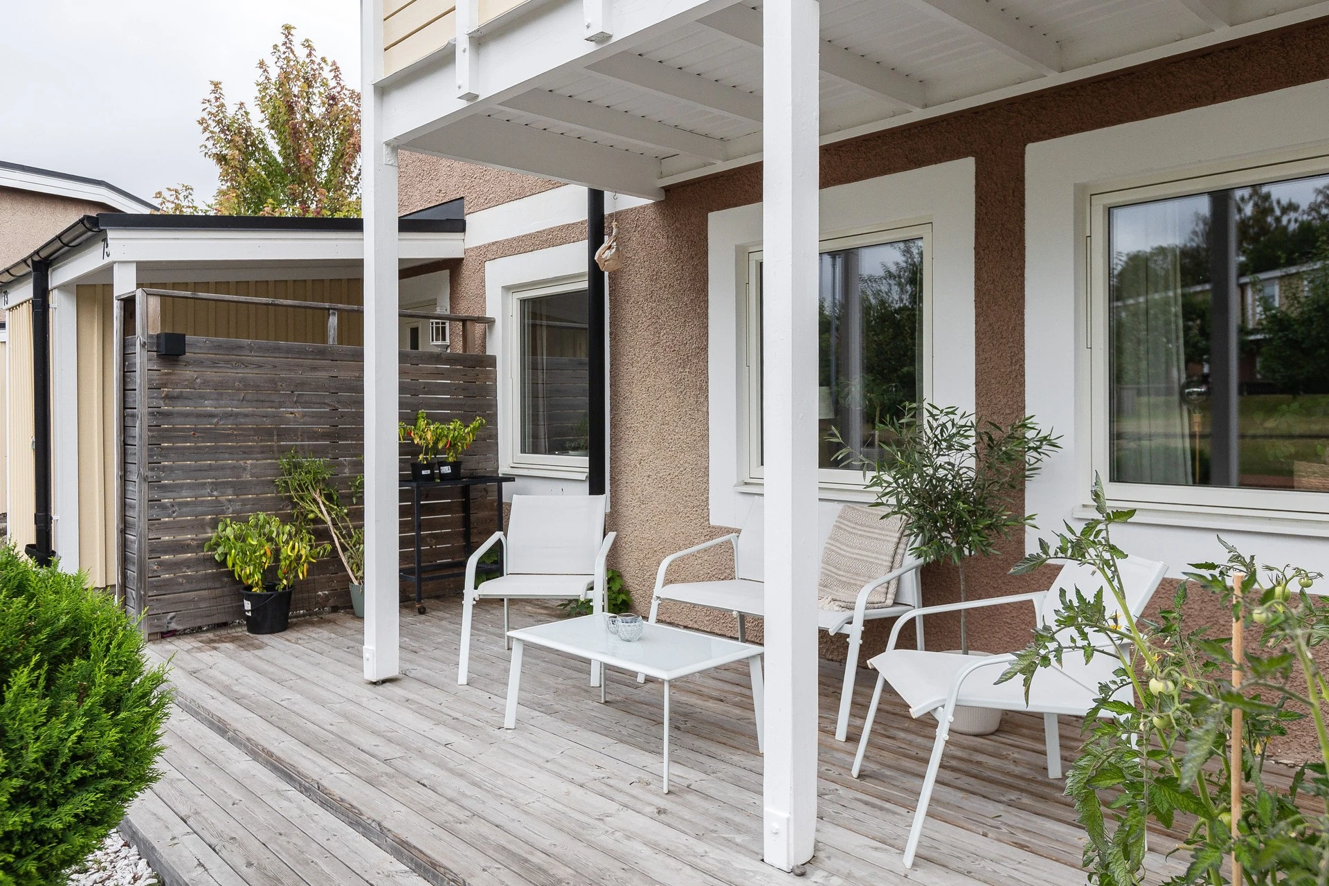 På baksidan av bostaden finns en generös uteplats med fritt läge. En härlig plats där du kan ta en paus och bara vara. Här njuter du av solen i en avskild miljö, med gott om utrymme för både loungemöbler, solstolar och grillhörna. Det här är en uteplats som förlänger hemmet ut i det fria, perfekt för sommarens middagar eller kvällar under bar himmel.