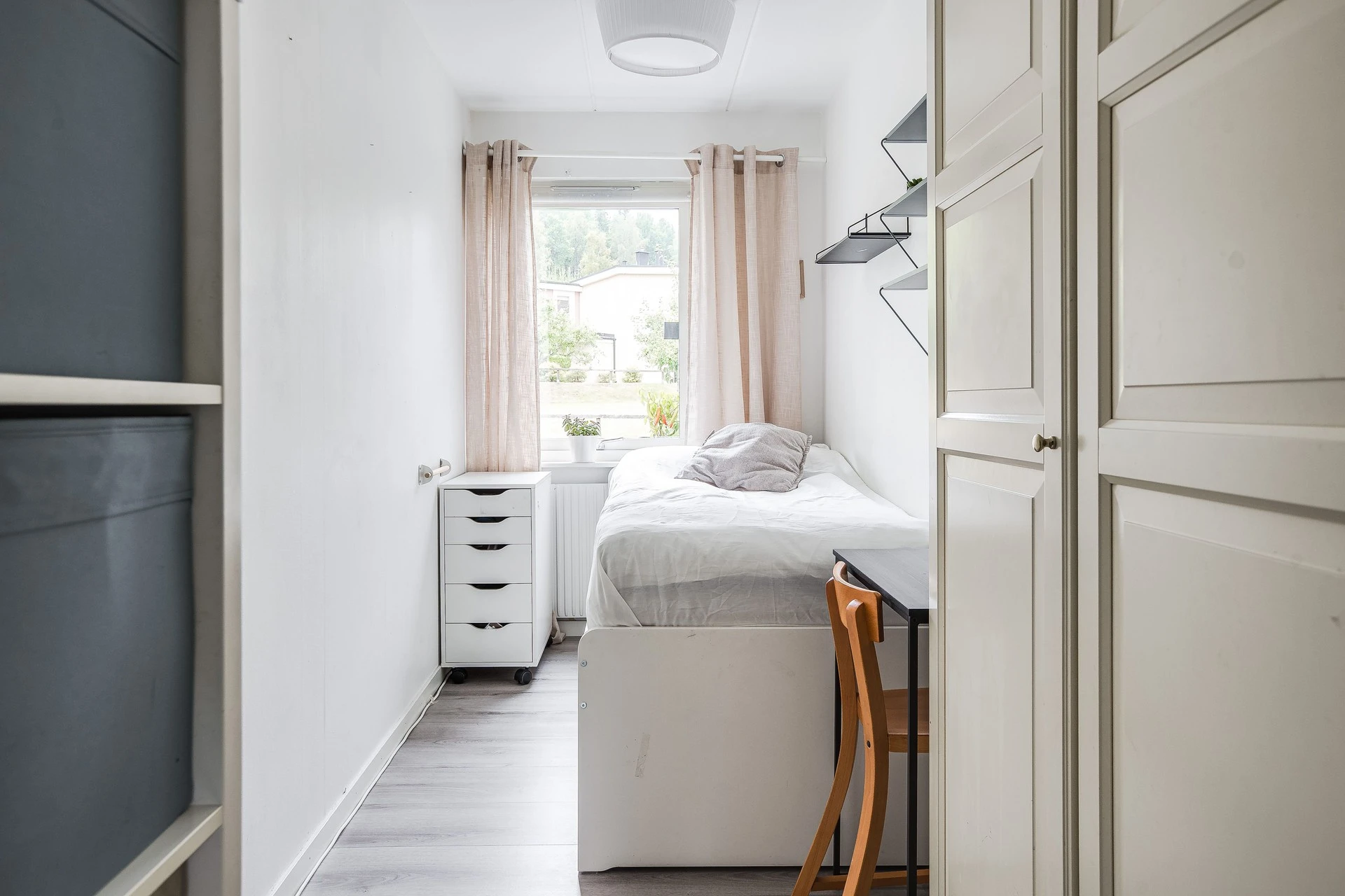 Det första sovrummet är det mindre av bostadens sovrum vilket passar perfekt som barnrum, hemmakontor eller gästrum. Ljust med en trivsam atmosfär, medan rummets storlek bjuder in till kreativ inredning. Här ryms med enkelhet en säng, skrivbord och förvaring. Ett flexibelt rum som kan anpassas efter skiftande behov.