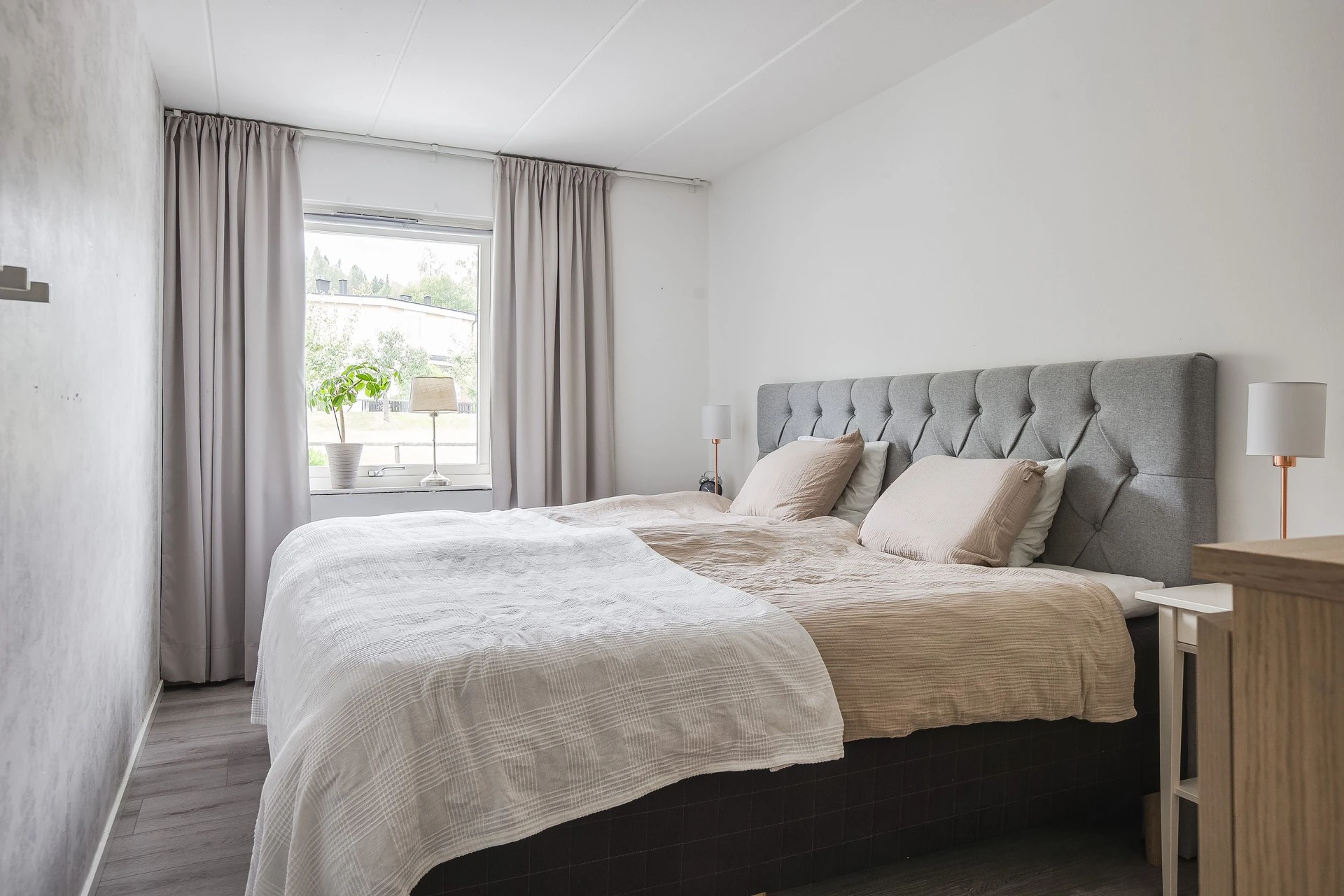 Ett stilfullt sovrum med plats för en dubbelsäng och tillhörande möbler. Här möts du av ljusa väggar och en behaglig rymd som förstärks av det fina ljusinsläppet. En plats där du enkelt skapar en lugn och harmonisk atmosfär för vila och återhämtning.