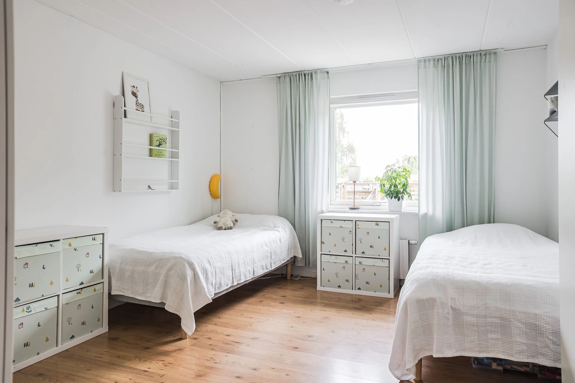Detta rum bjuder på generösa ytor och en lugn atmosfär – perfekt som master bedroom eller flexibelt barnrum. Här ryms enkelt en dubbelsäng, sängbord och extra förvaring. Inrett med garderober snyggt integrerade och väggarna går i en ljus, neutral ton som låter både ljuset och inredningen komma till sin rätt.