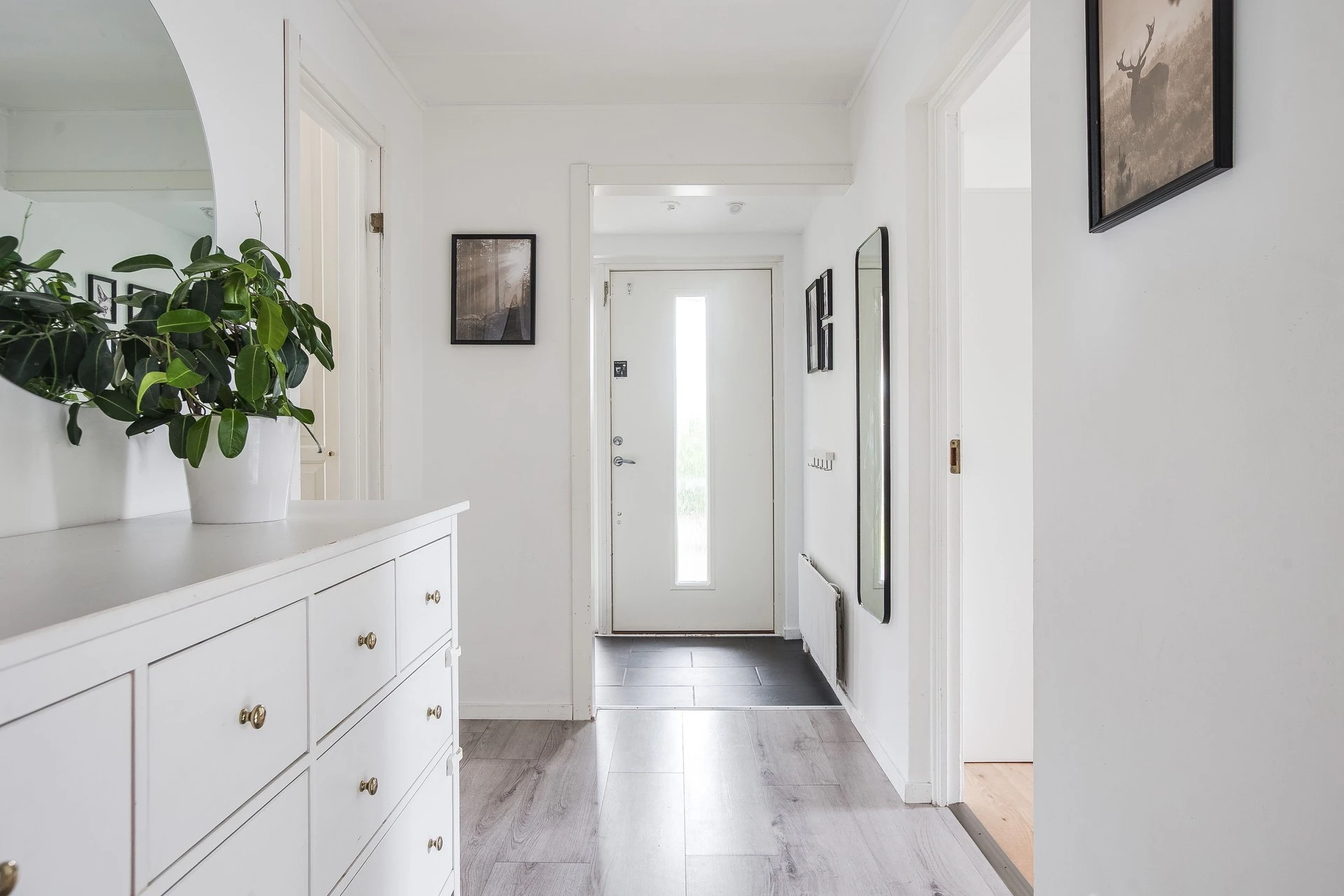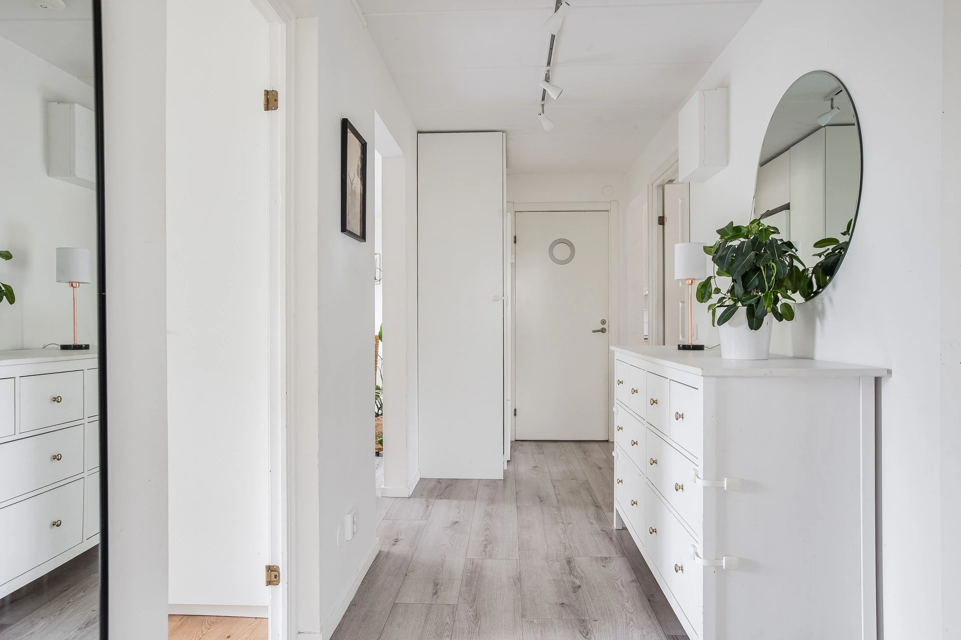 Vidare in i bostaden finns ytterligare en hall som är ljus och öppen med plats för möblering av exempelvis byrå eller garderober. Vita väggar och på golvet ligger ljust golv.