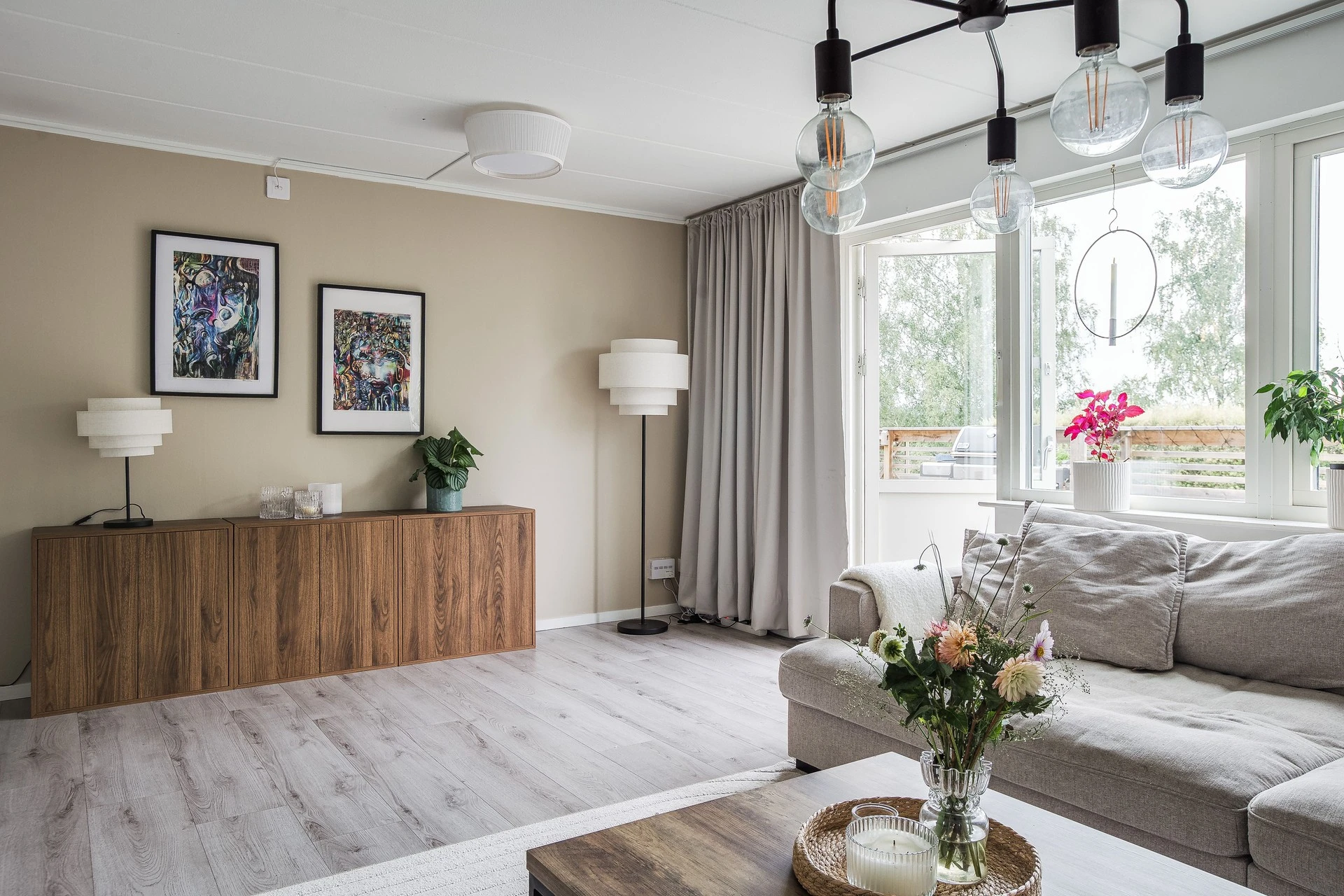 Här finns gott om plats för möblering. Såväl bokhyllor, matsalsbord som en stor soffgrupp. Ljusinsläpp från många fönsterpartier i ett mjukt flöde vilket skapar lugn och rymd. Sedan är det detaljerna som gör skillnaden - tavlor, textiler och personliga intryck. Härifrån har du utgången till den fantastiska uteplatsen.