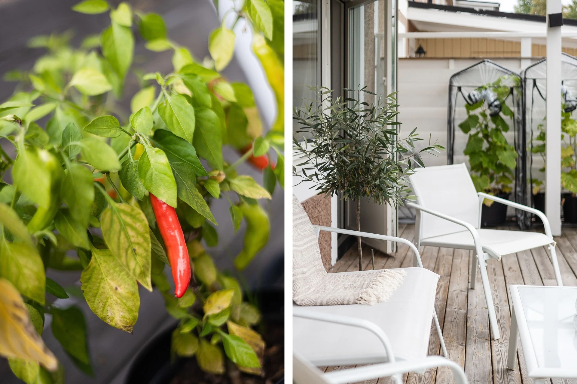 Platsen erbjuder gott om utrymme för både matgrupp och loungedel, samtidigt som det finns fina möjligheter för odling – kanske egen liten köksträdgård men även blommor som sätter färg på vardagen.