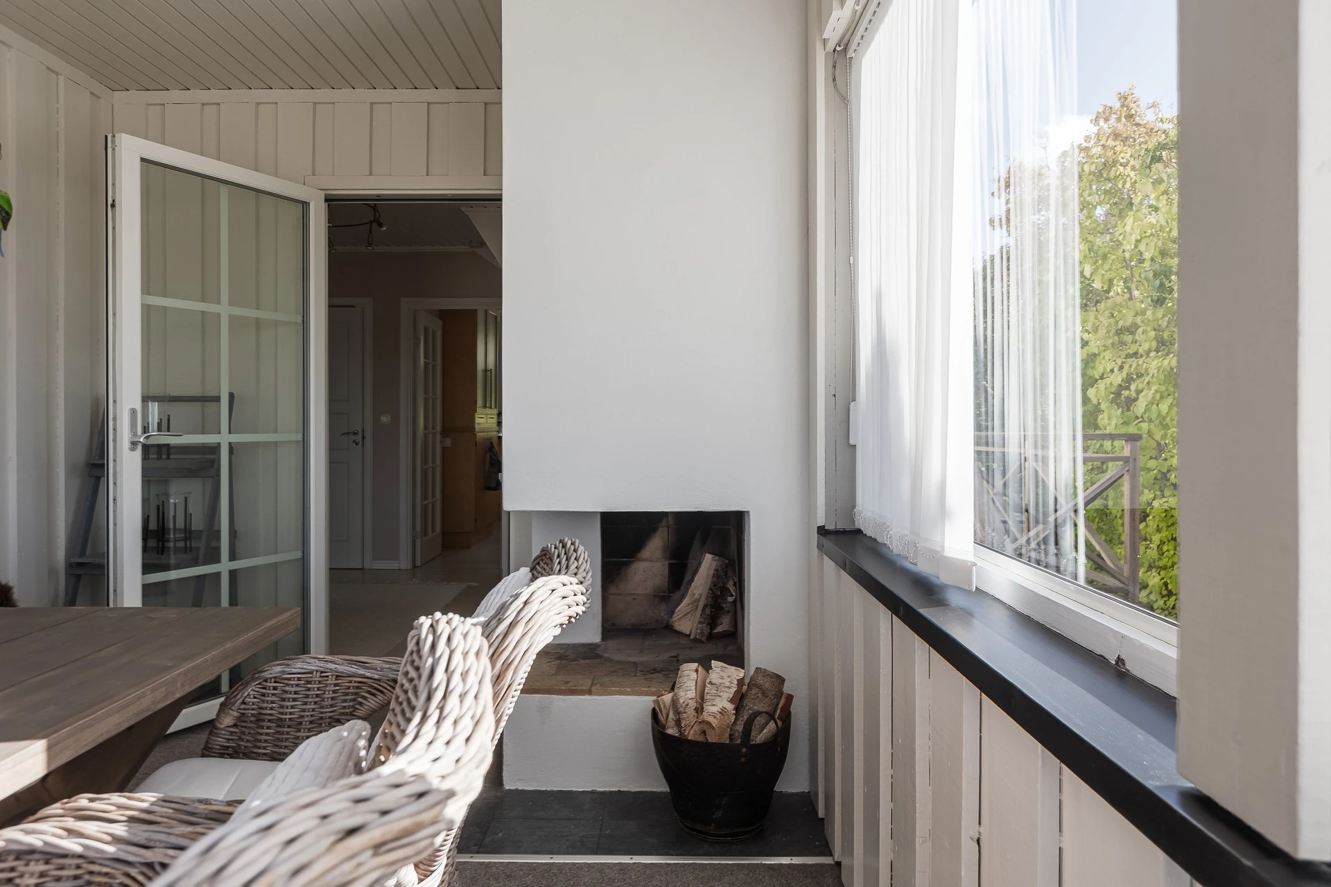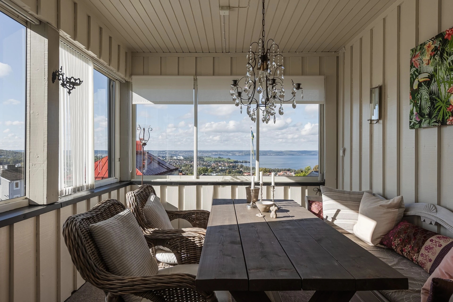 Den inglasade balkongen är något alldeles extra – en plats där du njuter av årstidernas skiftningar med en enastående utsikt som sträcker sig långt över landskapet. De skjutbara glaspartierna gör att du kan öppna upp under varma dagar eller stänga till för att förlänga säsongen och skapa ett extra rum att trivas i.