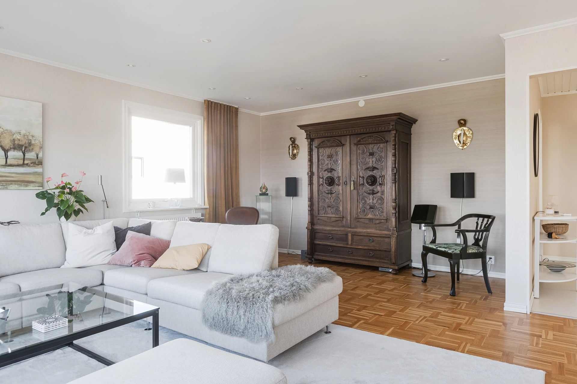 Det generösa rummet präglas av en harmonisk känsla med stilrent parkettgolv och väggar i ljus kulör, vilket skapar en lugn och inbjudande atmosfär. Här finns gott om plats för både soffgrupp och matsalsmöbel – perfekt för såväl vardagsliv som sociala tillställningar.