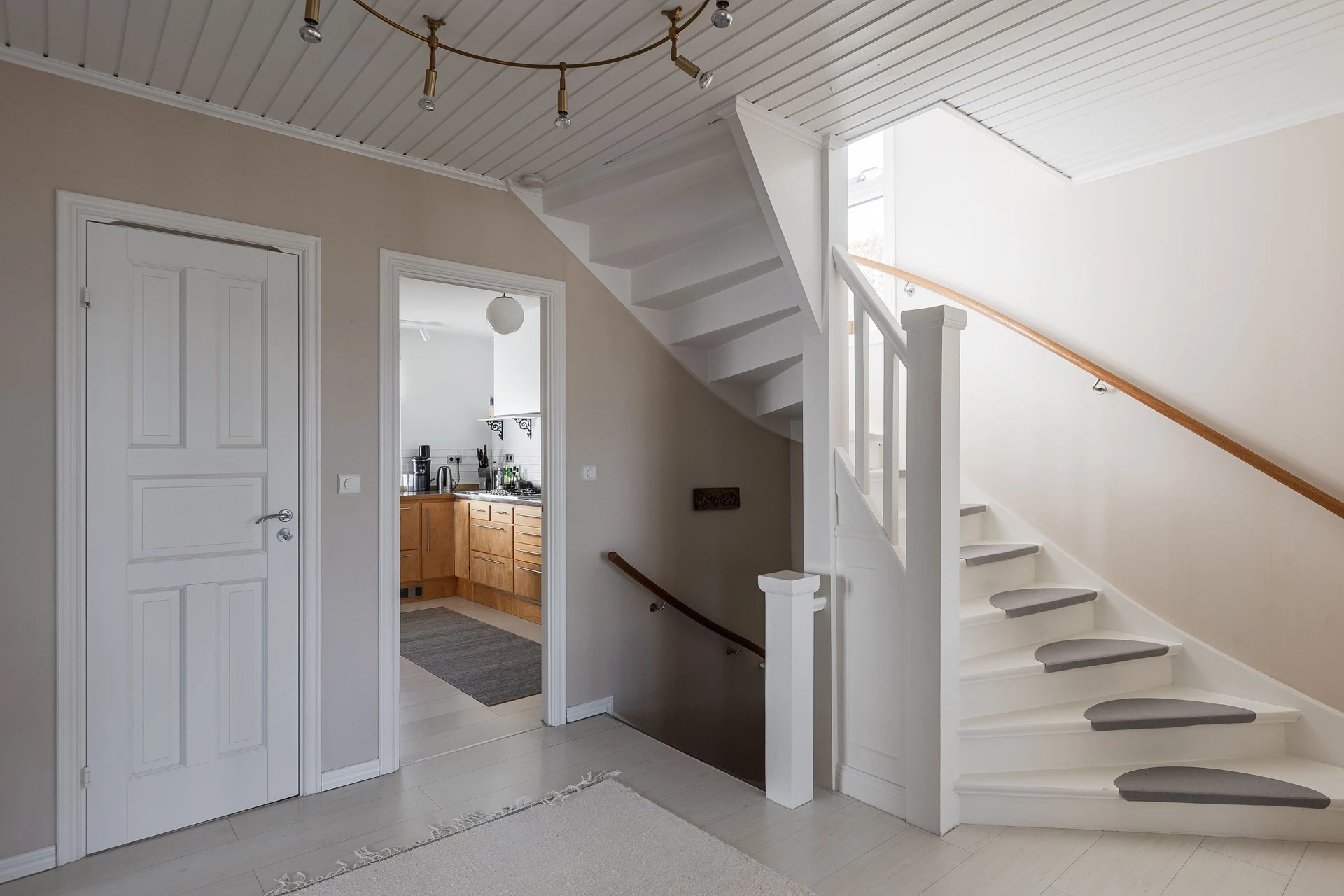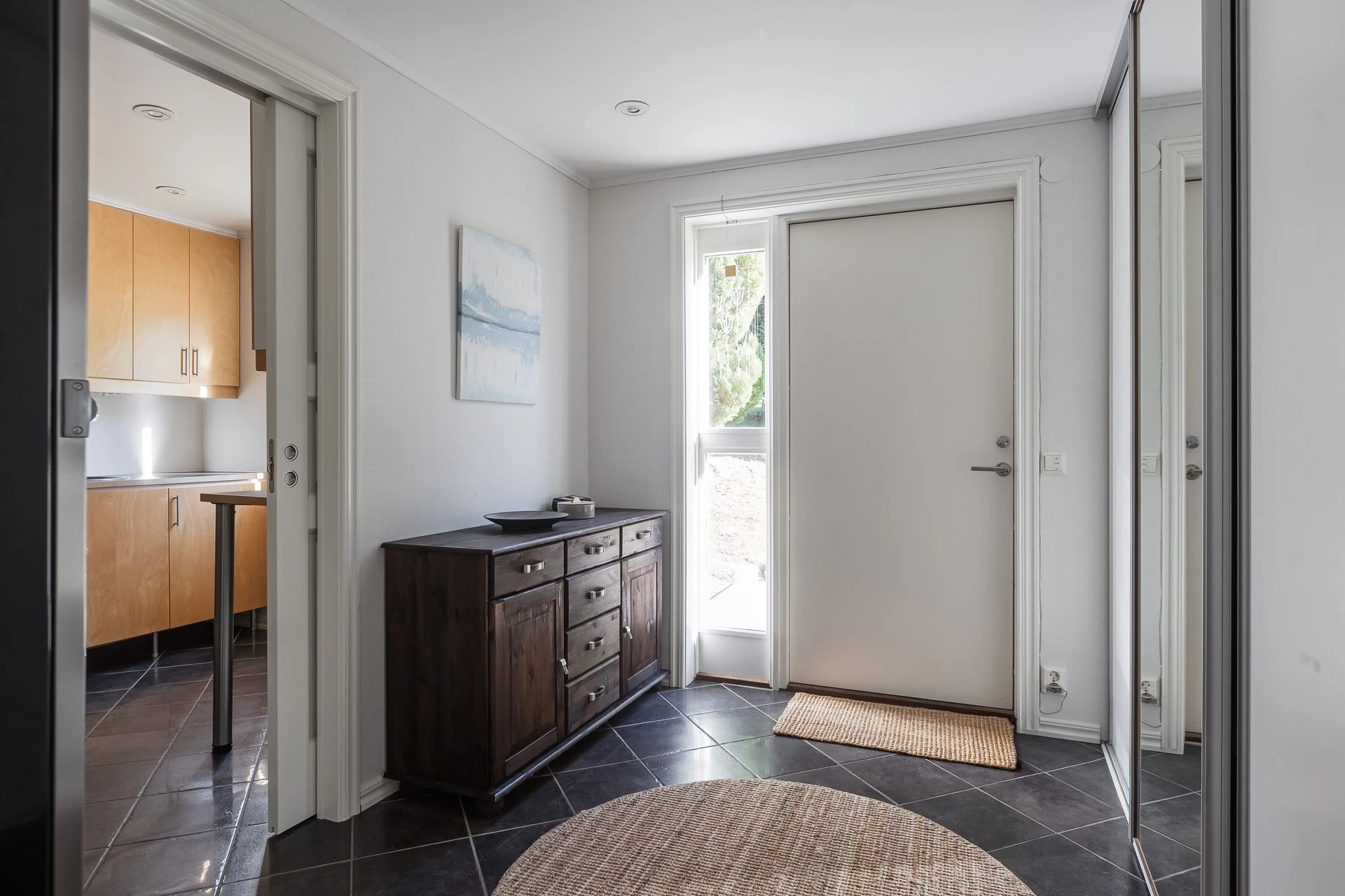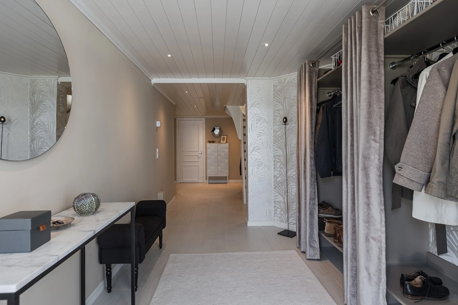 Redan i bostadens entréhall möts du av en känsla av rymd och omtanke. Här finns gott om plats för både klädavhängning och förvaring, vilket gör att hallen alltid kan hållas prydlig och inbjudande. Det slitstarka klinkergolvet med behaglig golvvärme kombinerar praktiskt tänkande med vardagslyx – perfekt under årets alla årstider. Väggarna har smakfulla, noggrant utvalda kulörer som sätter tonen för resten av hemmet och ger ett varmt och välkomnande intryck redan från första steget in.
