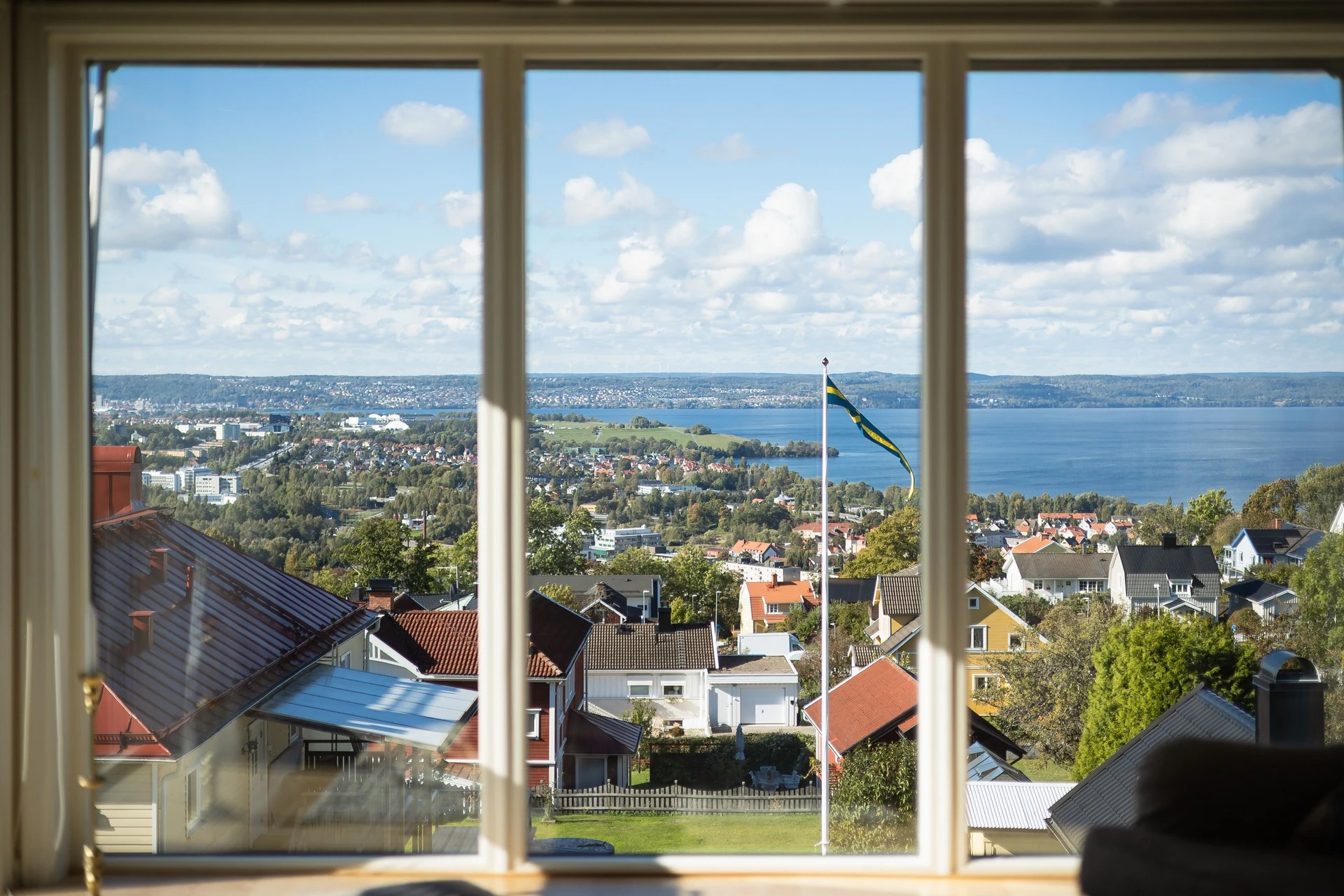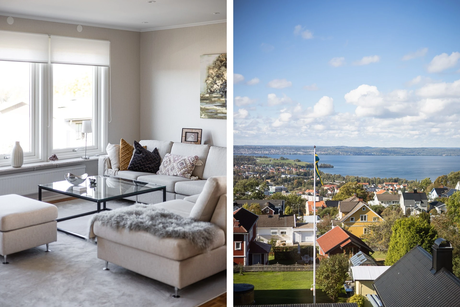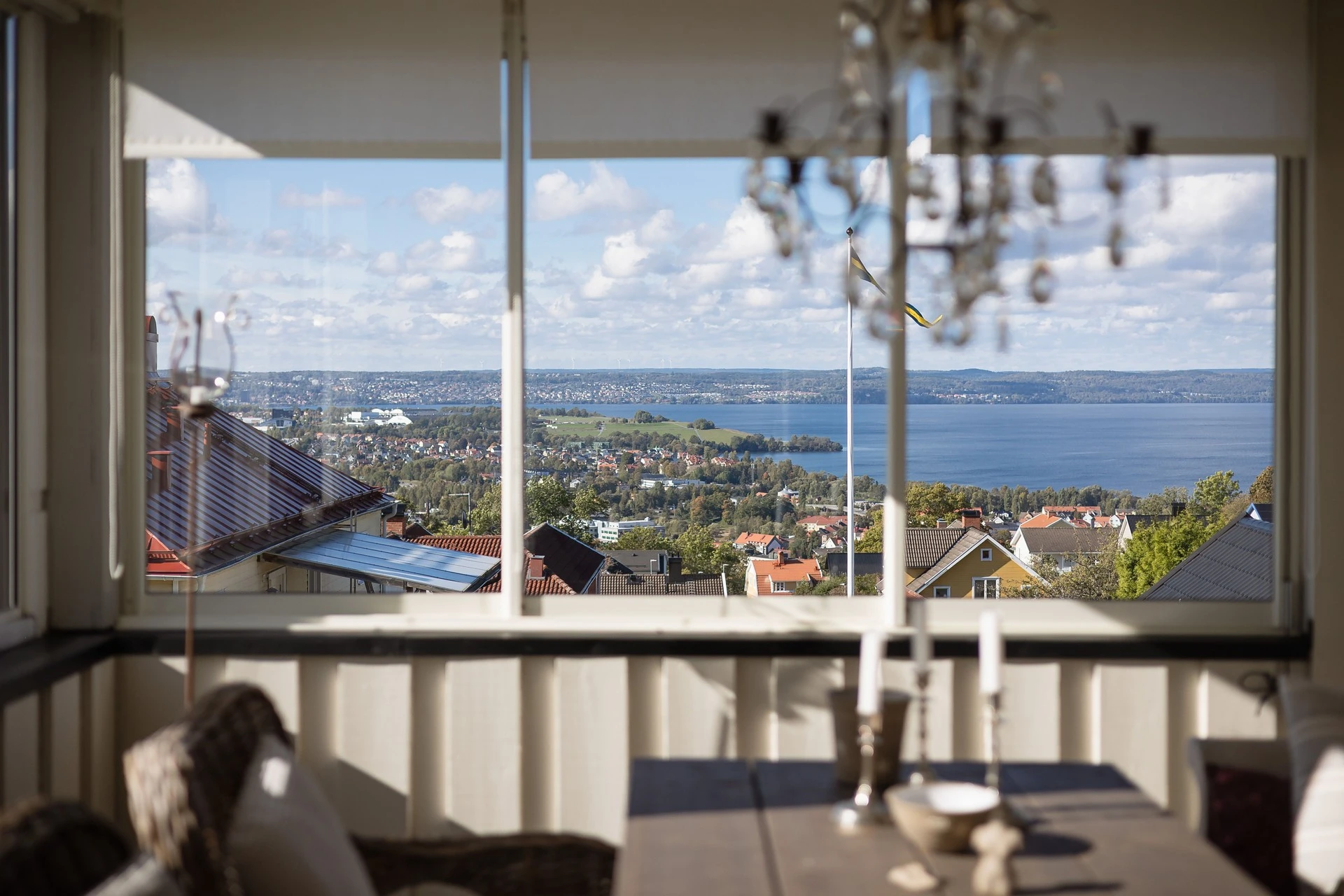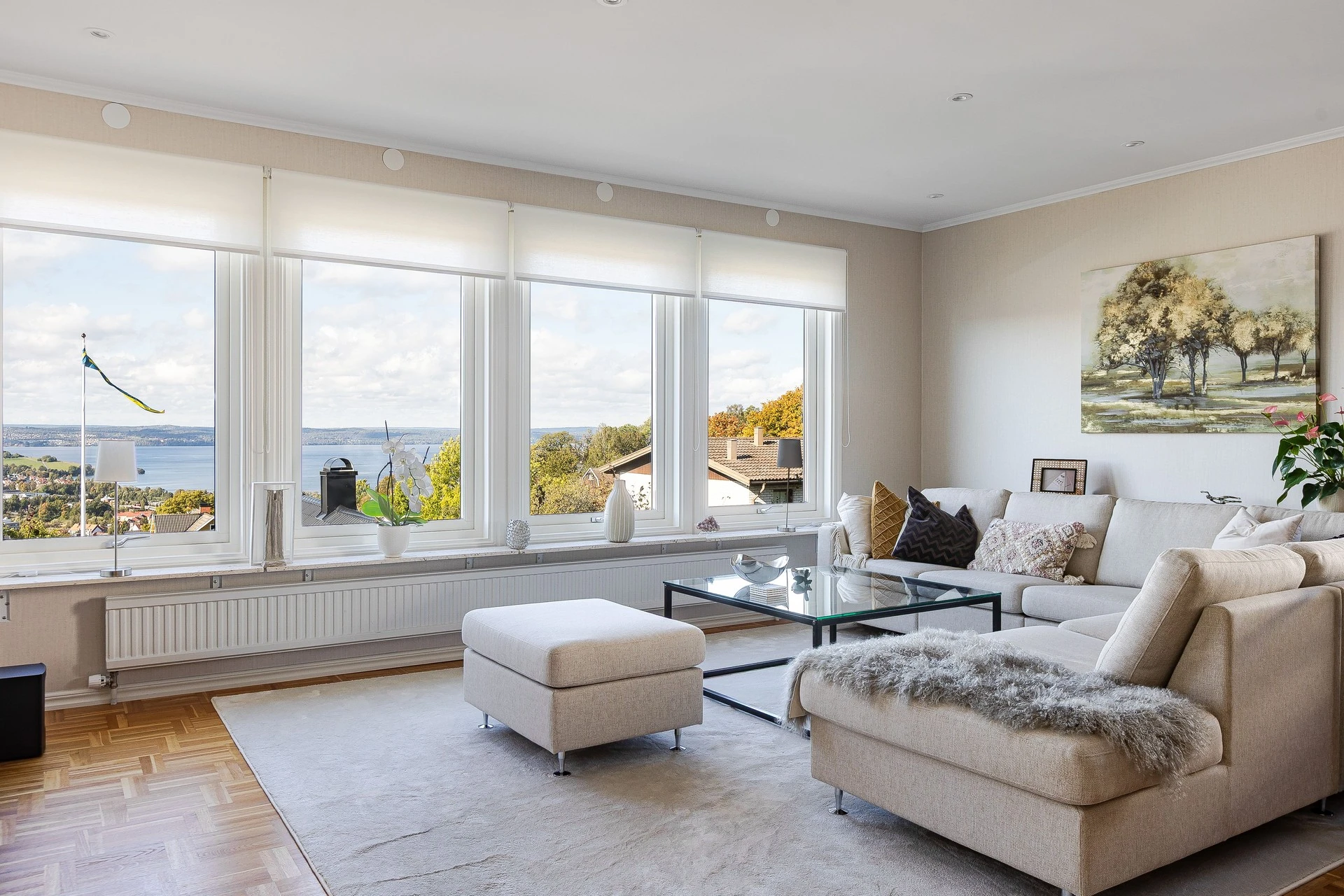 Ljusfyllt vardagsrum med magisk utsikt över Vättern.