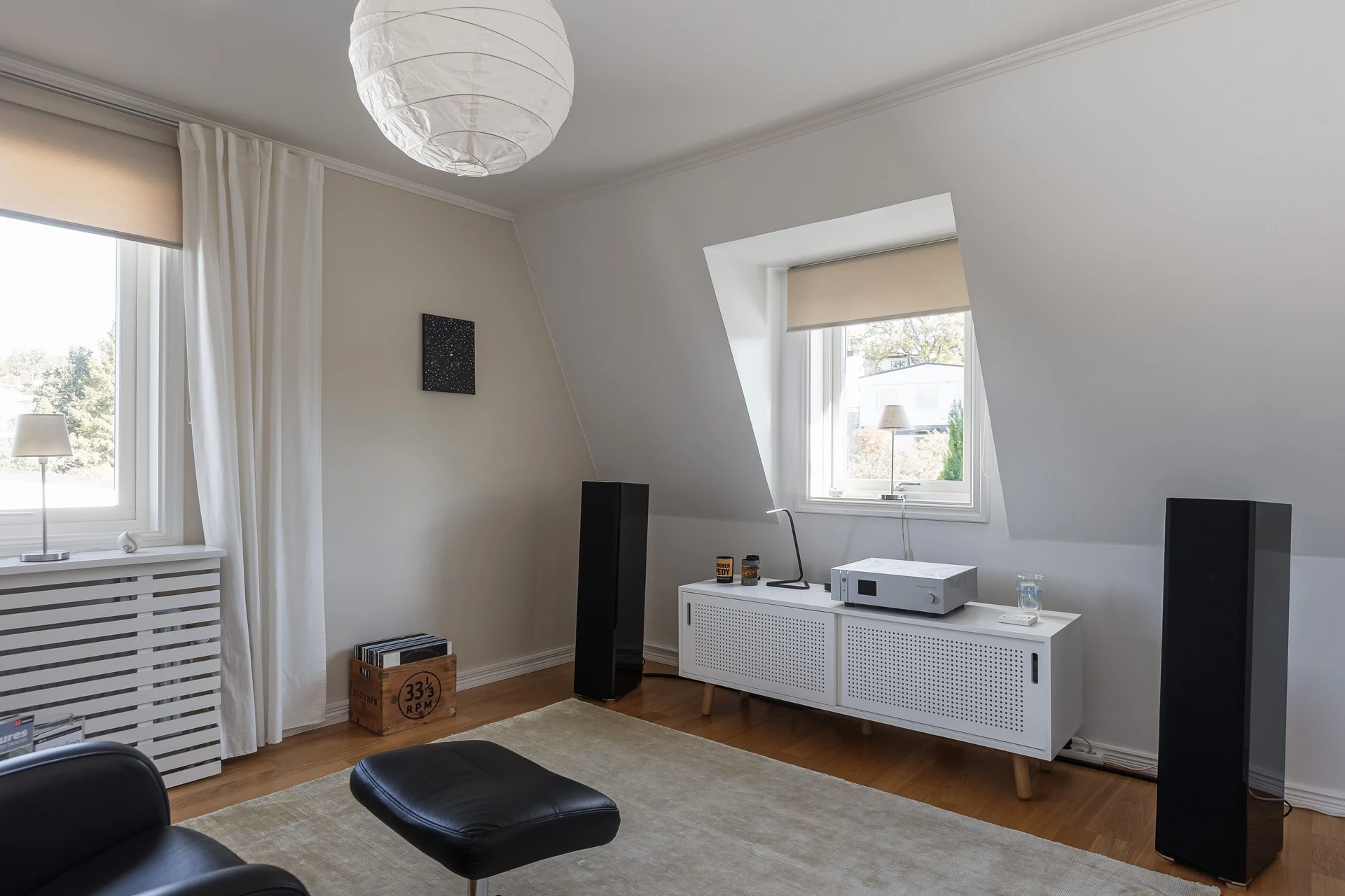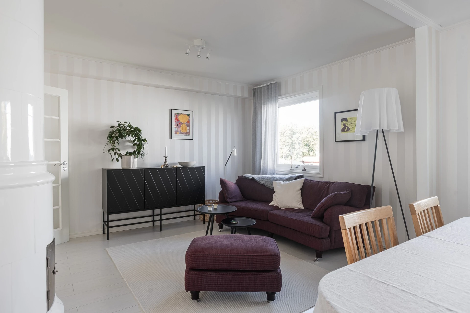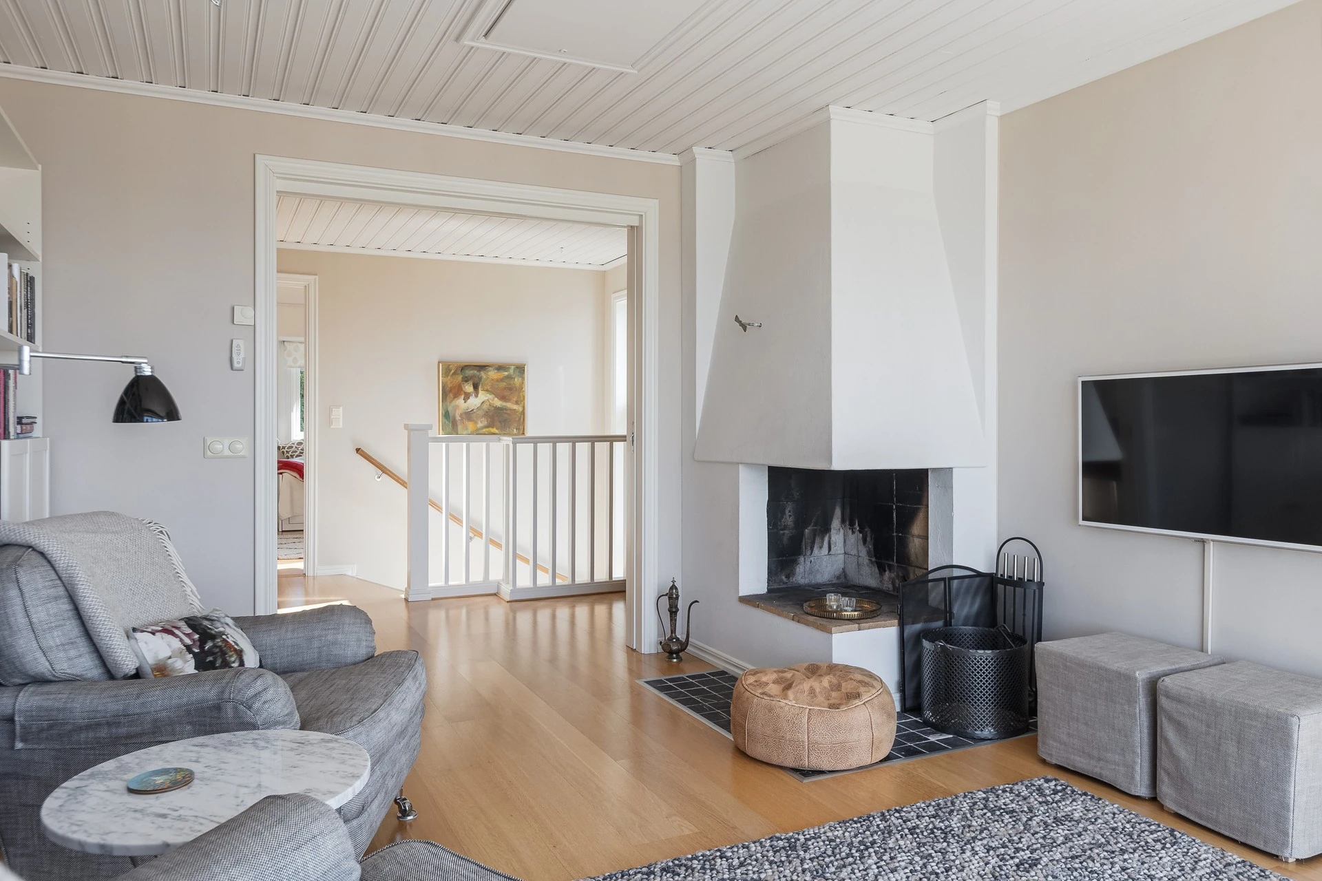 Den öppna spisen skänker både värme och karaktär och gör detta till ett perfekt rum för avkoppling, läsning eller socialt umgänge. Parkettgolv och ljusa väggar skapar en harmonisk bas som förstärker rymden och den luftiga känslan.