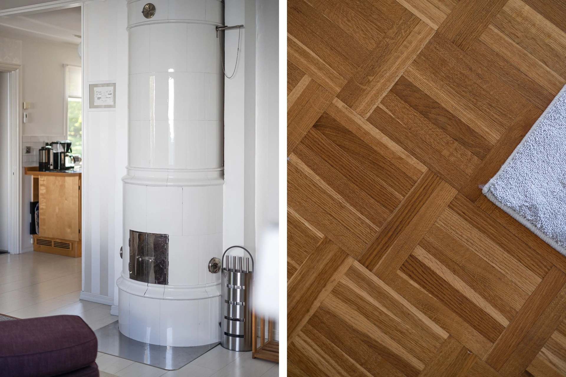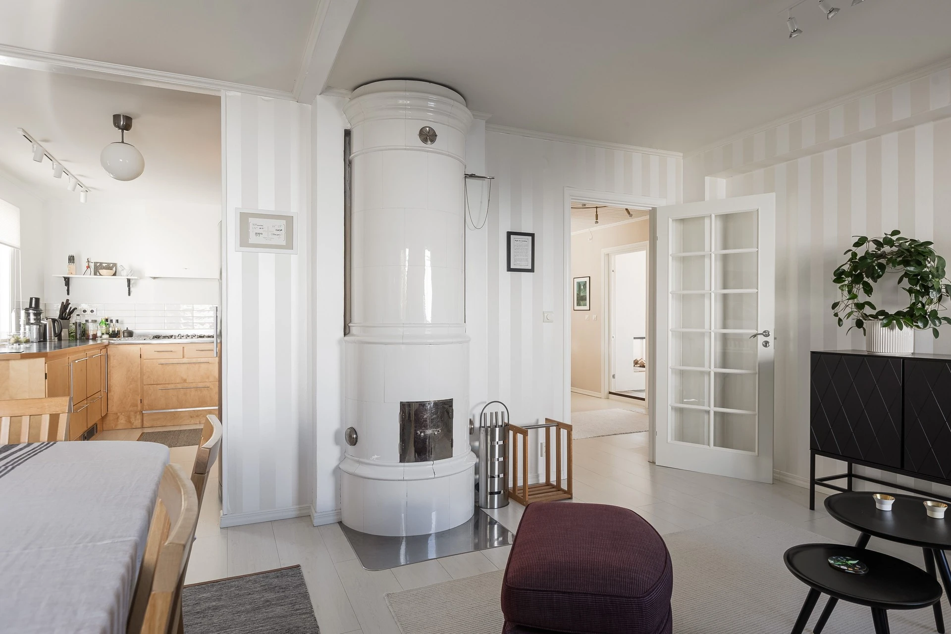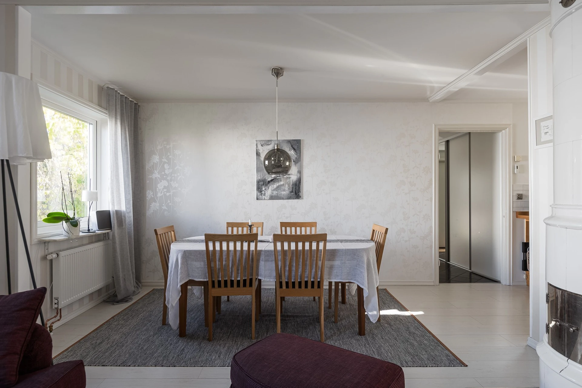 Den öppna planlösningen mot det generösa matrummet skapar en social och luftig känsla, där gränsen mellan matlagning och umgänge suddas ut. Här finns plats för både vardagsmiddag och större middagsbjudningar – med naturligt ljus som strömmar in och skapar en varm atmosfär. Mitt i matrummet står en vacker kakelugn som blir en självklar blickfångare och bidrar med både charm och värme.