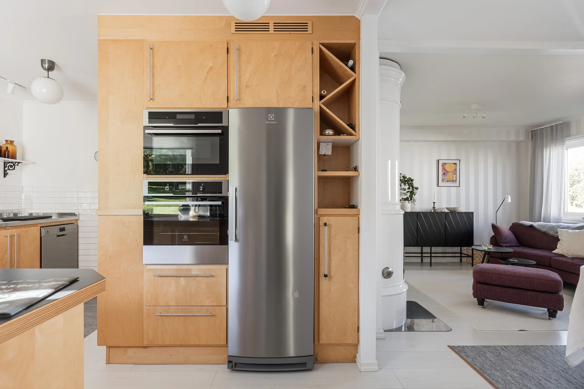 Hjärtat i bostaden är utan tvekan det exklusiva Kvänumköket – en perfekt kombination av tidlös design, förstklassiga materialval och funktion i toppklass. De vackra snickerierna ramas in av stilrena bänkskivor och moderna vitvaror i integrerat utförande, vilket skapar ett kök som både är vackert att se på och underbart att arbeta i.