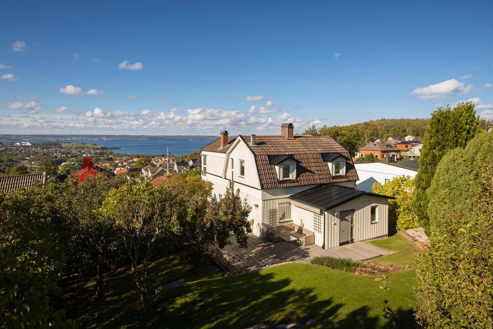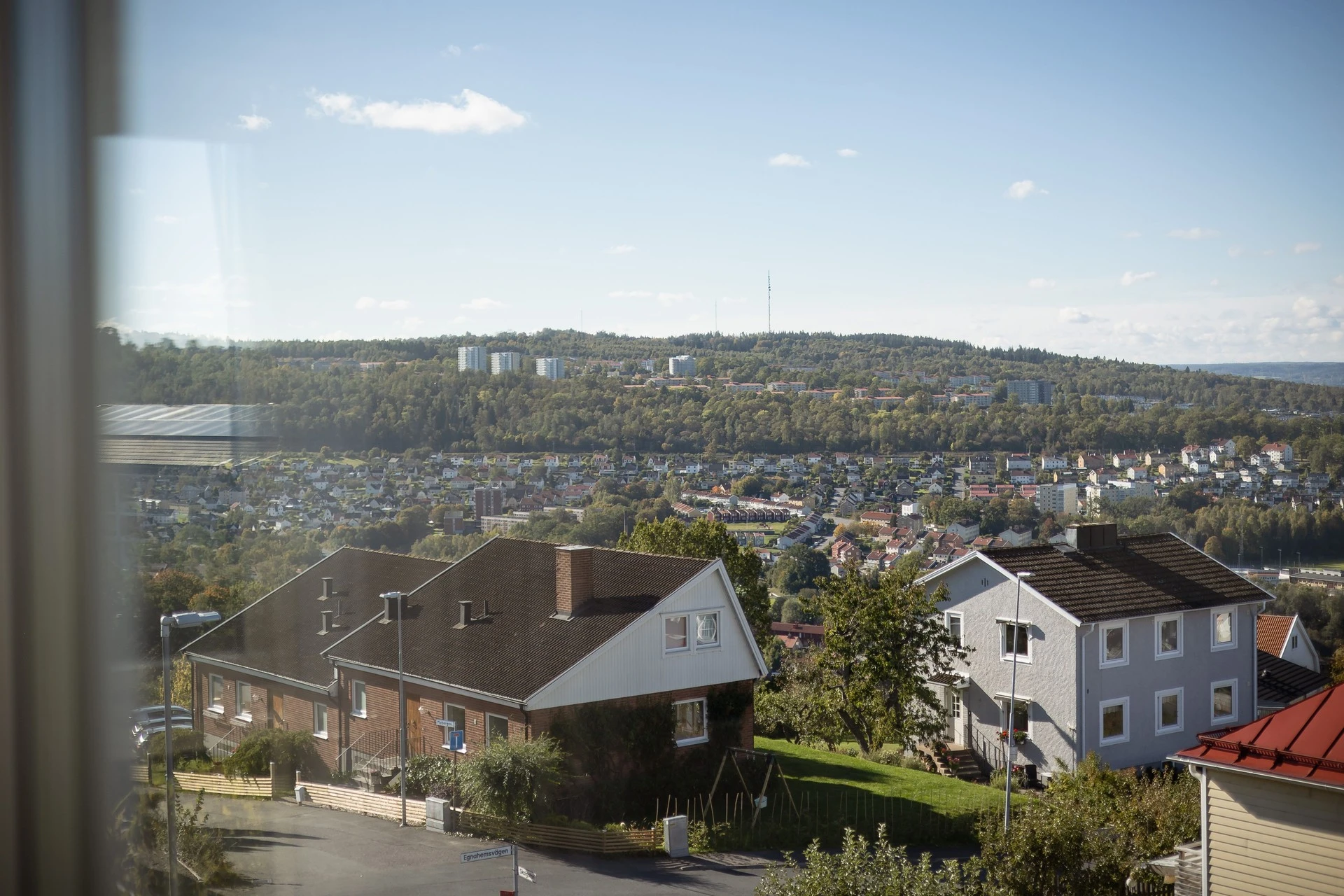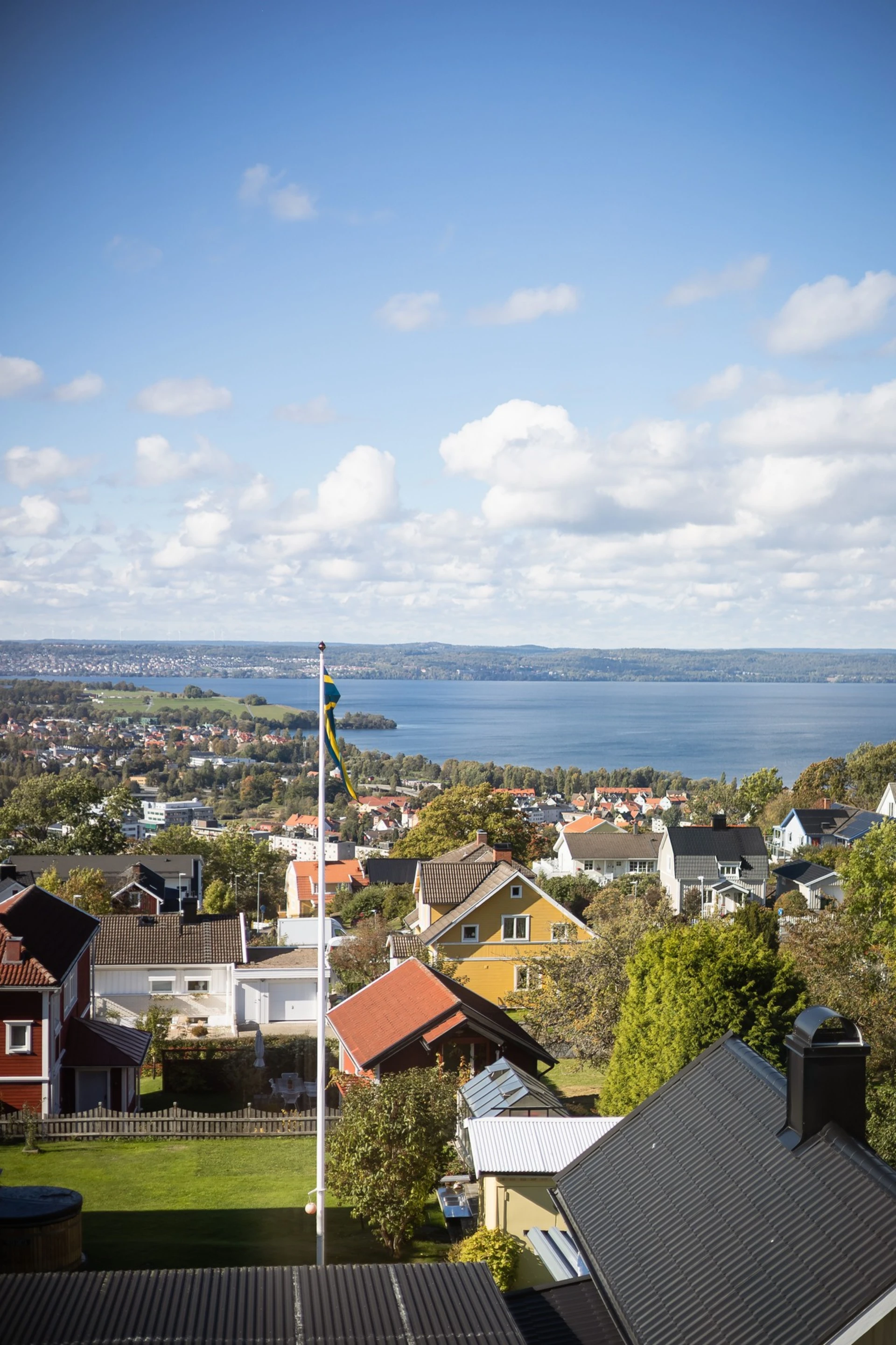 Högst upp i huset väntar ett allrum utöver det vanliga – en plats där himlen känns nära och utsikten sträcker sig miltals över Huskvarna, Jönköping och glittrande Vättern.