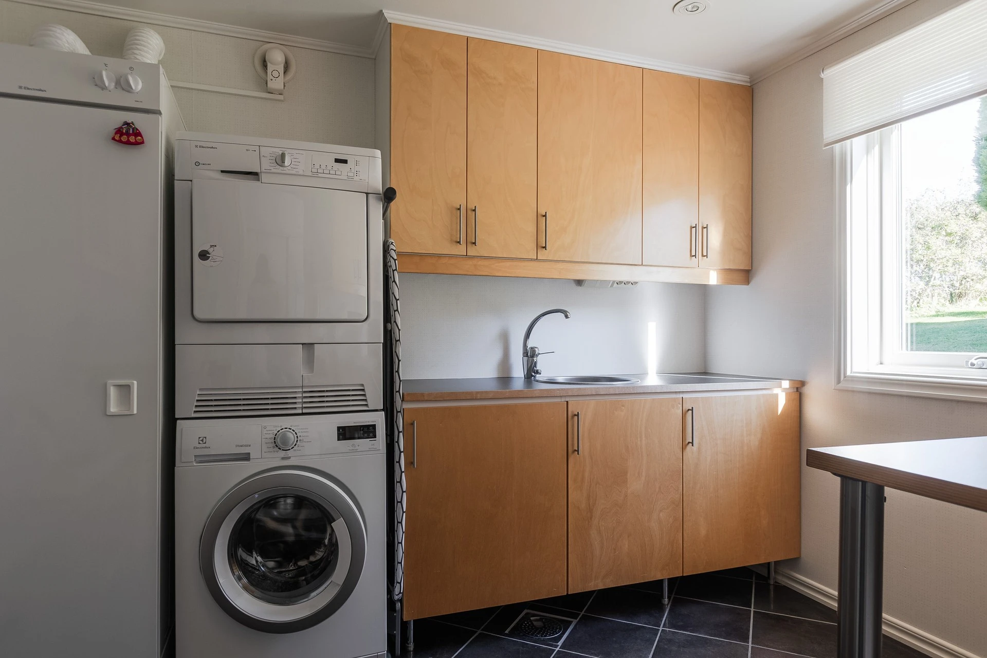 Utrustning: Tvättmaskin, torktumlare, torkskåp och tvättho.
