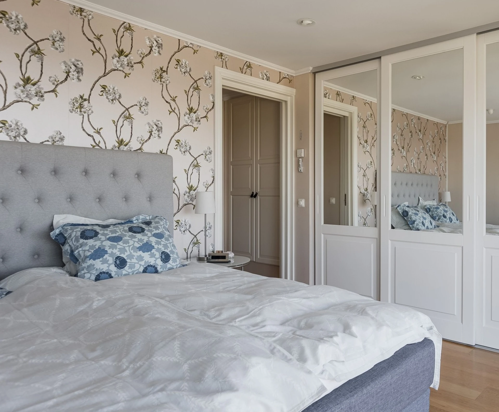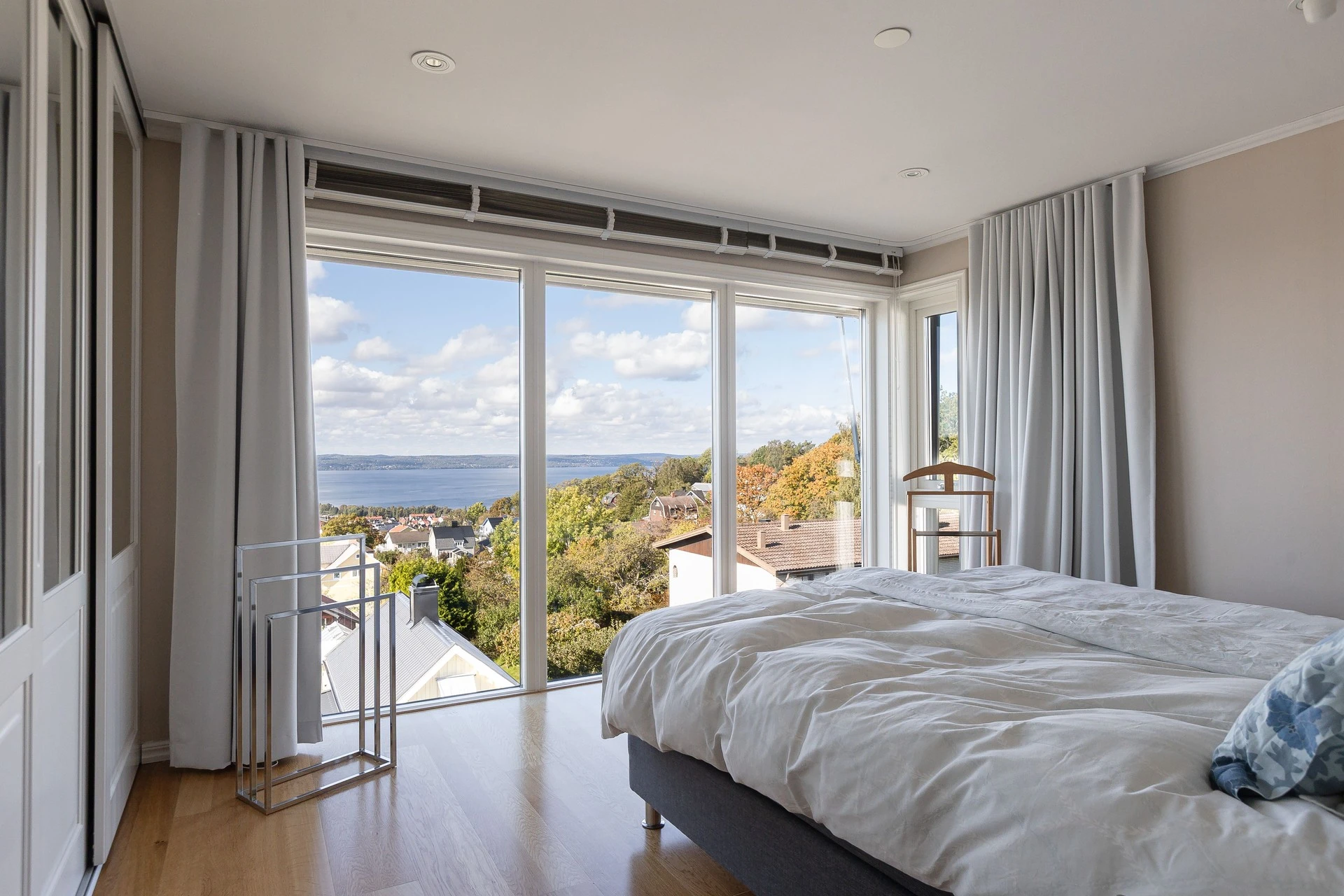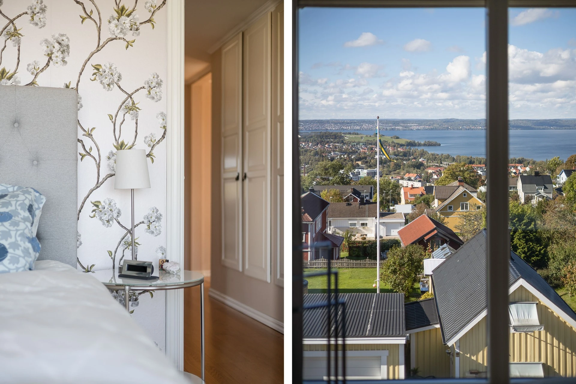Vakna upp till en enastående utsikt – det stora fönsterpartiet från golv till tak bjuder på milsvida vyer som ger rummet en fantastisk rymd och en känsla av lugn. Detta sovrum är smakfullt inrett med parkettgolv och smakfulla färgval på väggarna, vilket skapar en harmonisk atmosfär att både börja och avsluta dagen i. Här finns även gott om förvaring tack vare en stor skjutdörrsgarderob som rymmer det mesta och håller rummet stilrent och ordnat. Ett sovrum som kombinerar funktion, komfort och utsikt på bästa sätt – en plats att verkligen trivas i.