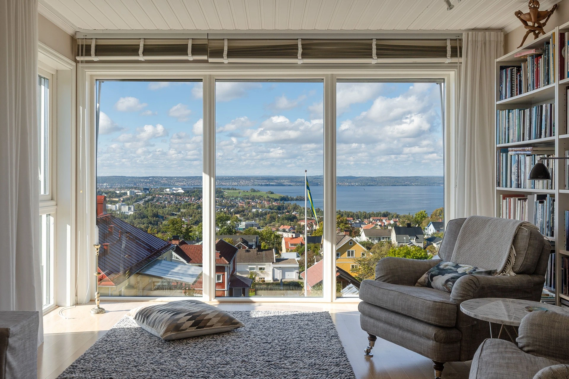 I detta rymliga vardagsrum flödar ljuset in genom stora fönsterpartier och blicken sträcker sig ut över Vättern och det omgivande landskapet – en vy som skiftar med årstiderna och aldrig slutar att fascinera.