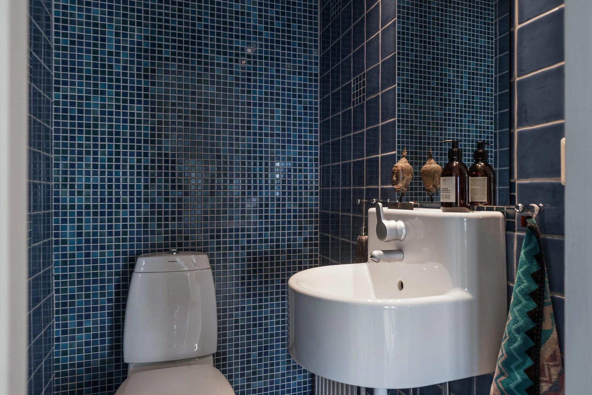 I anslutning till hallen finns en gäst wc med mosaik på golv och kakel/mosaik på väggarna.