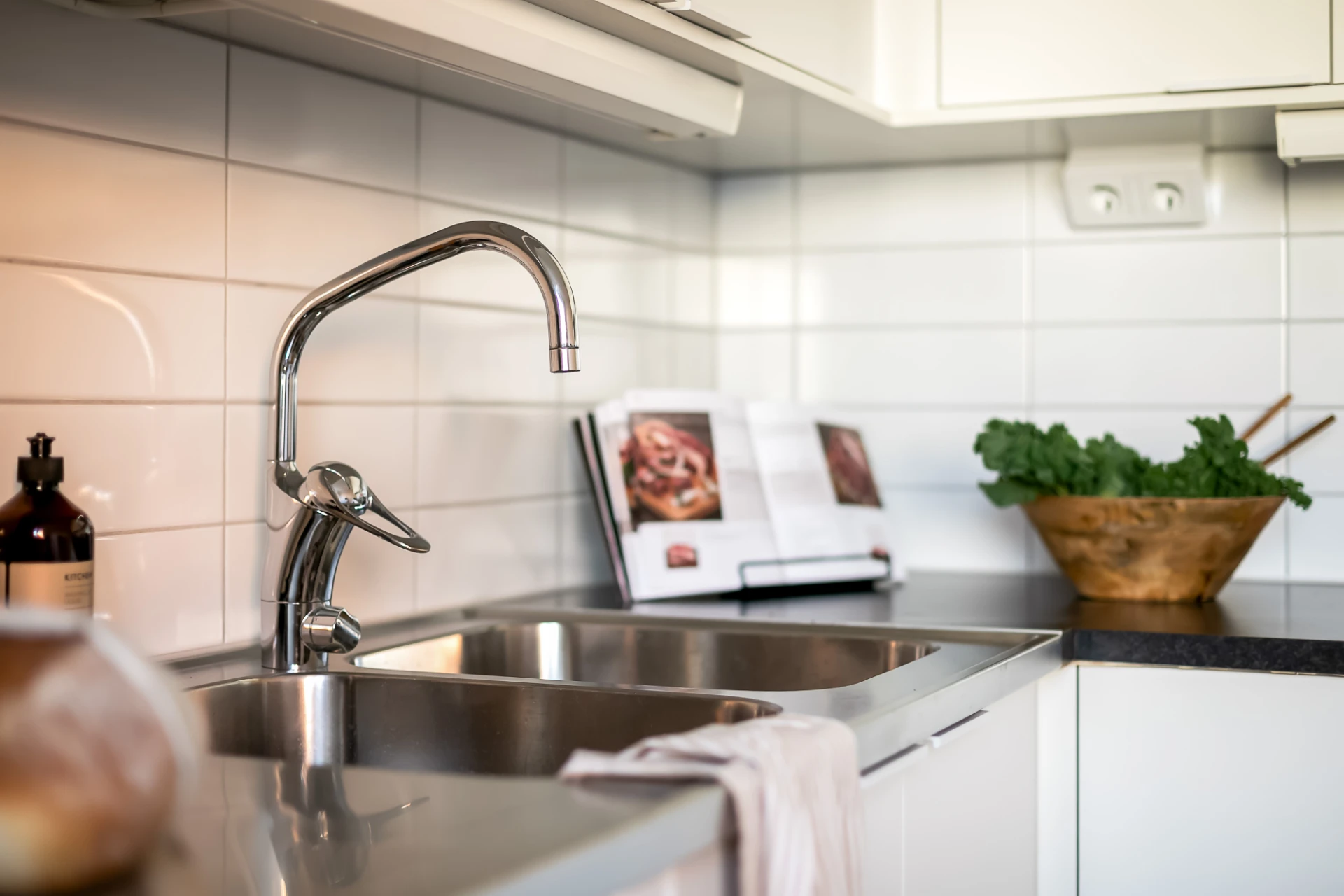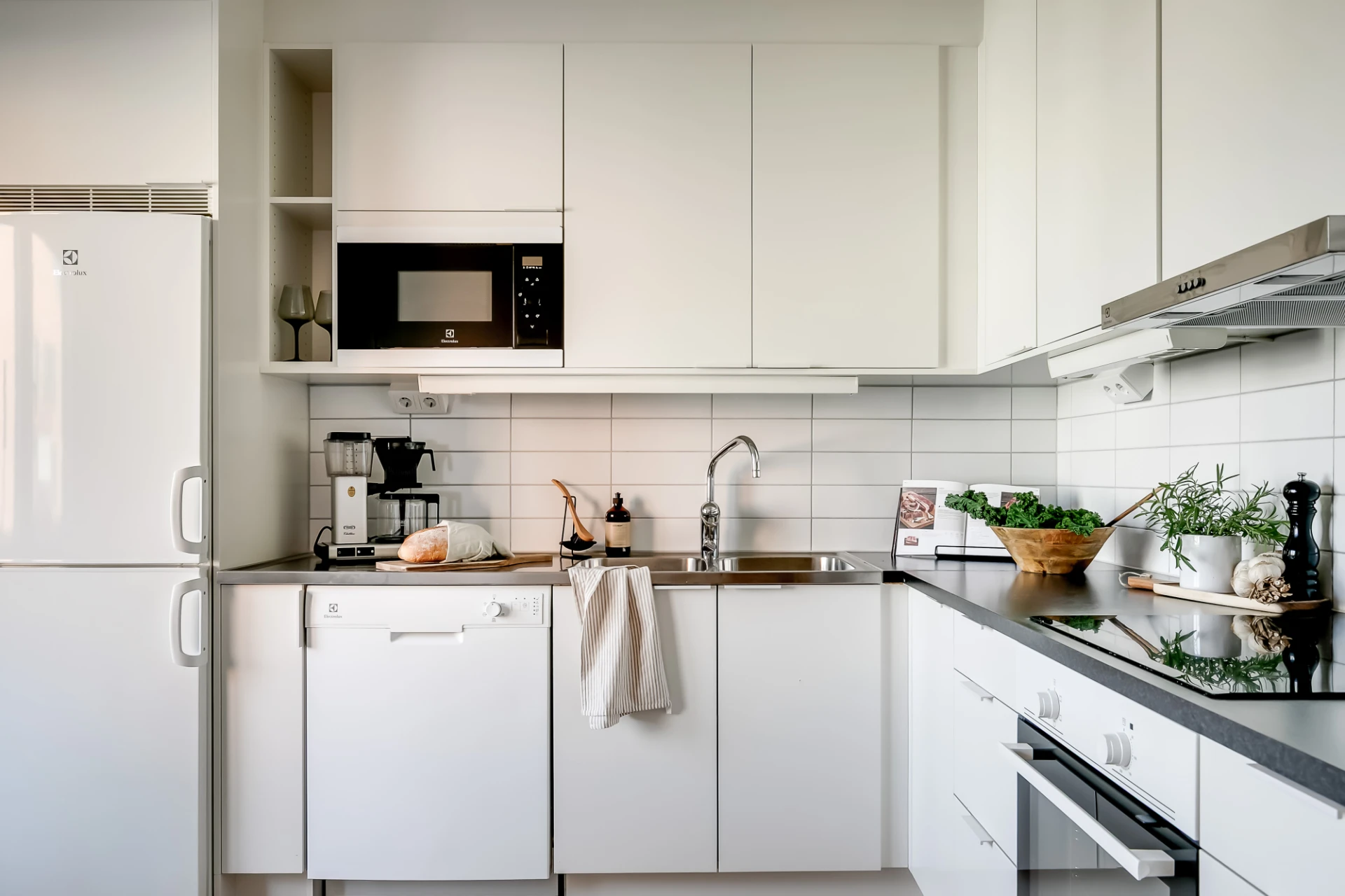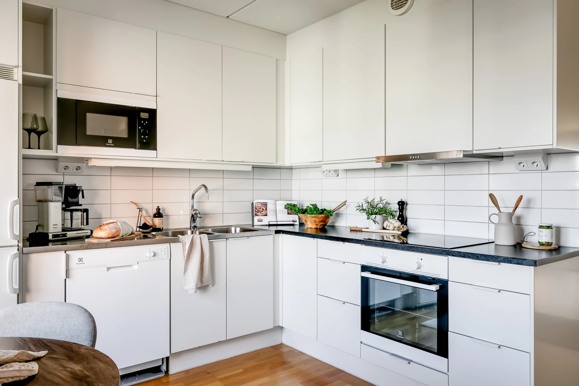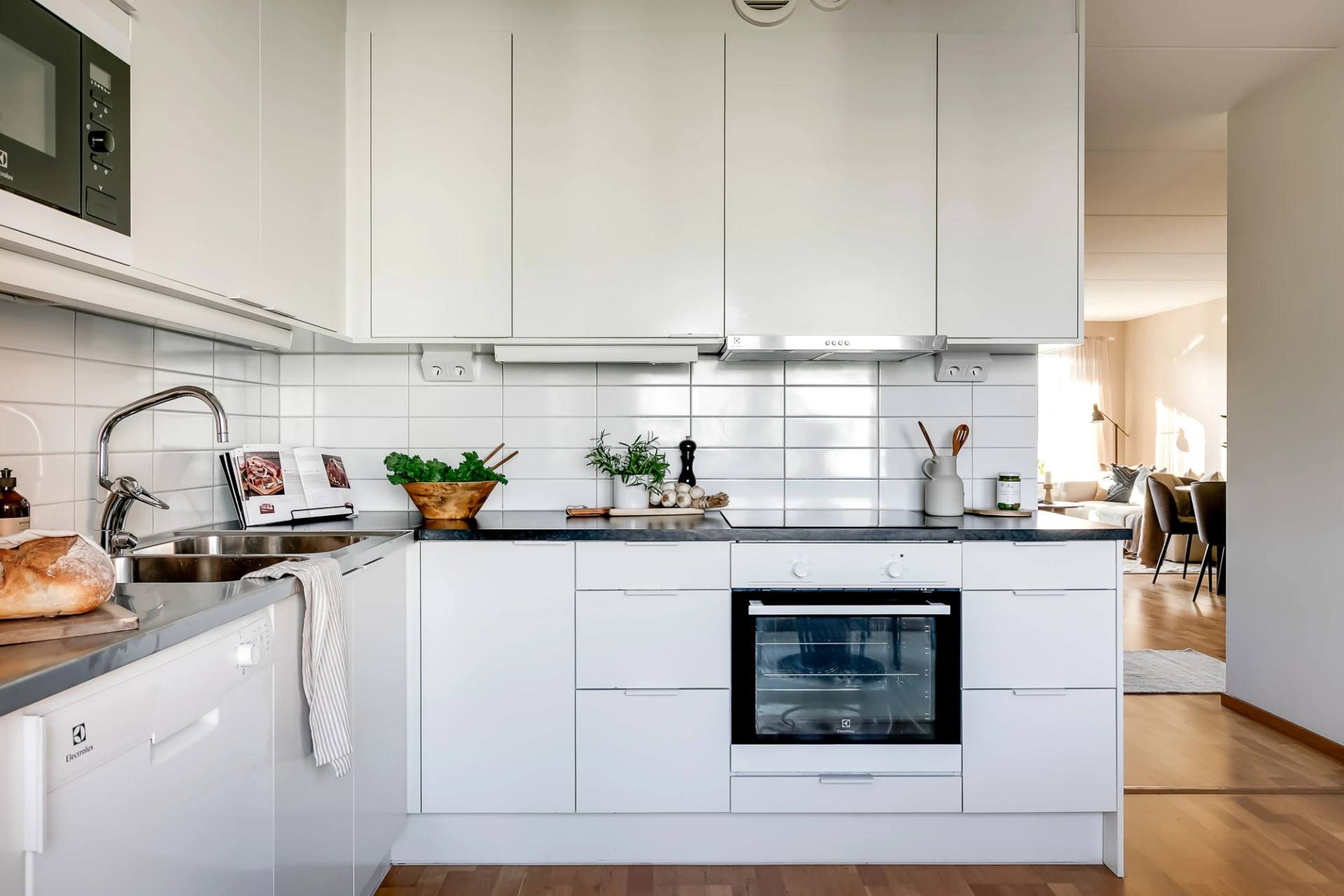 Släta köksluckor och lådfronter med grepplister, rektangulära kakelplattor som stänkskydd, dubbelho med bågformad blandare samt arbetsbänk i delvis svart laminat och delvis rostfritt stål. Induktionshäll, inbyggnadsugn, underbyggnadsfläkt, inbyggd mikro i arbetshöjd, diskmaskin samt kombinerad kyl och frys. Vita väggar, rejäla arbetsytor och gott om förvaring. Matbord för åtta personer ryms vid ett fönster.