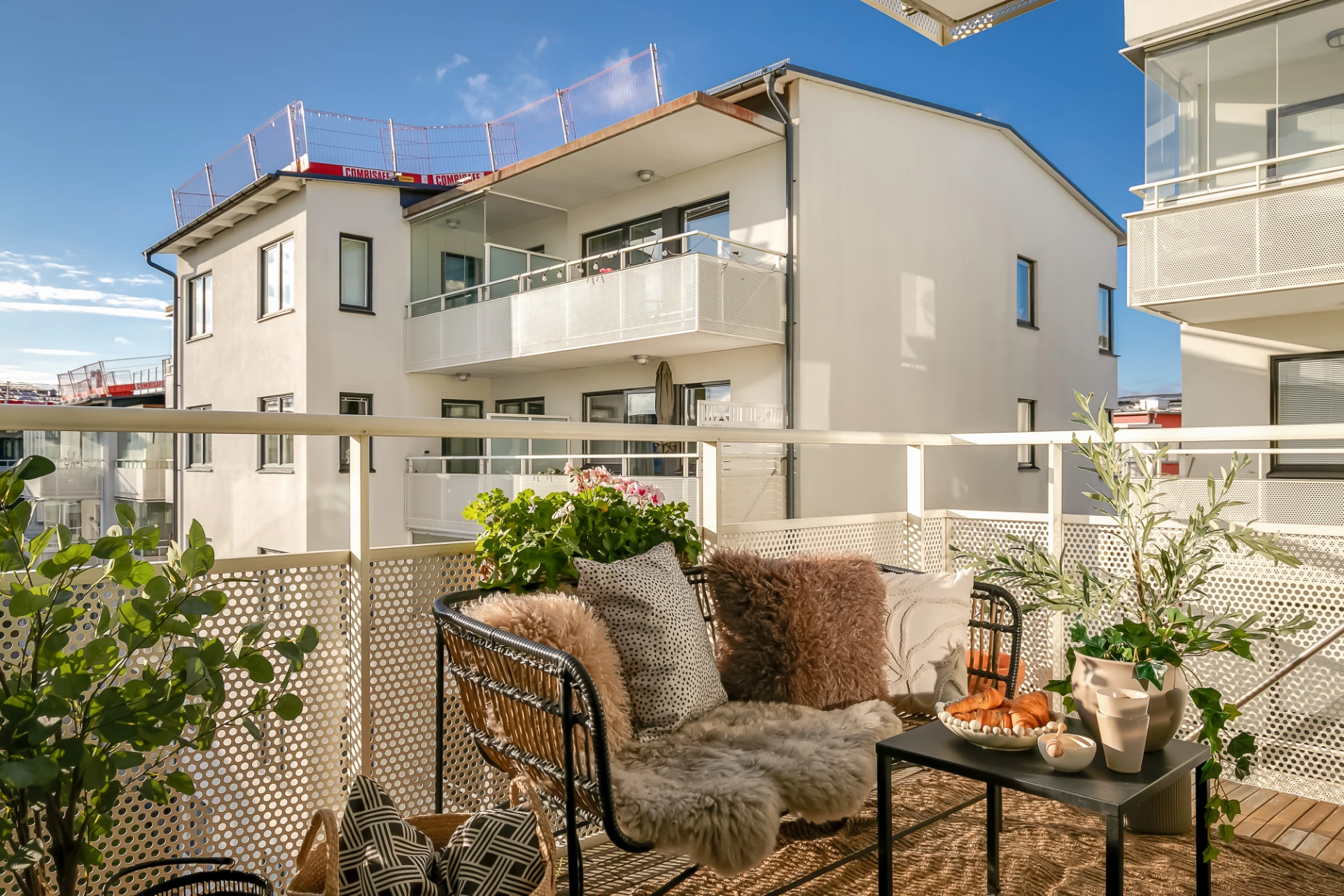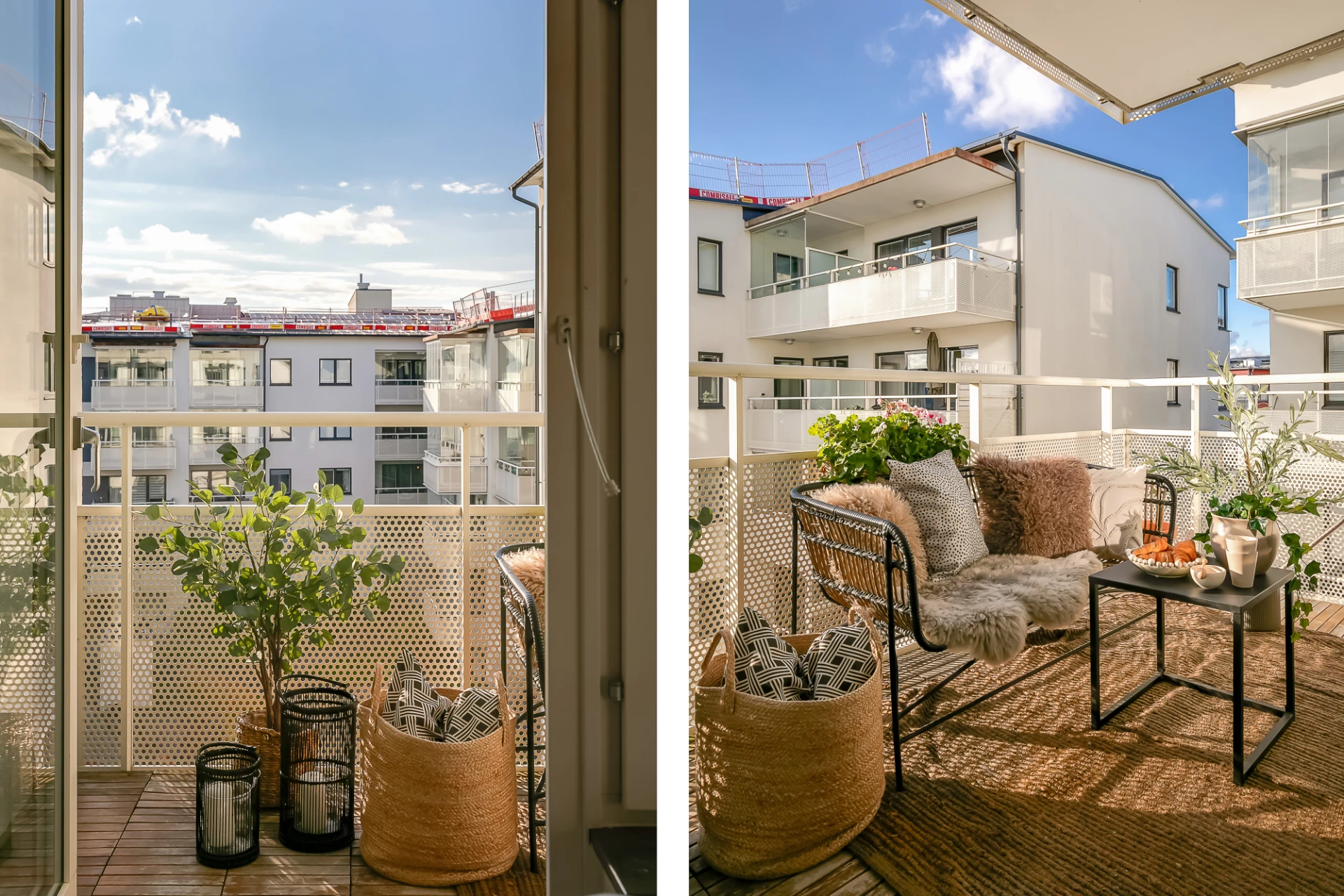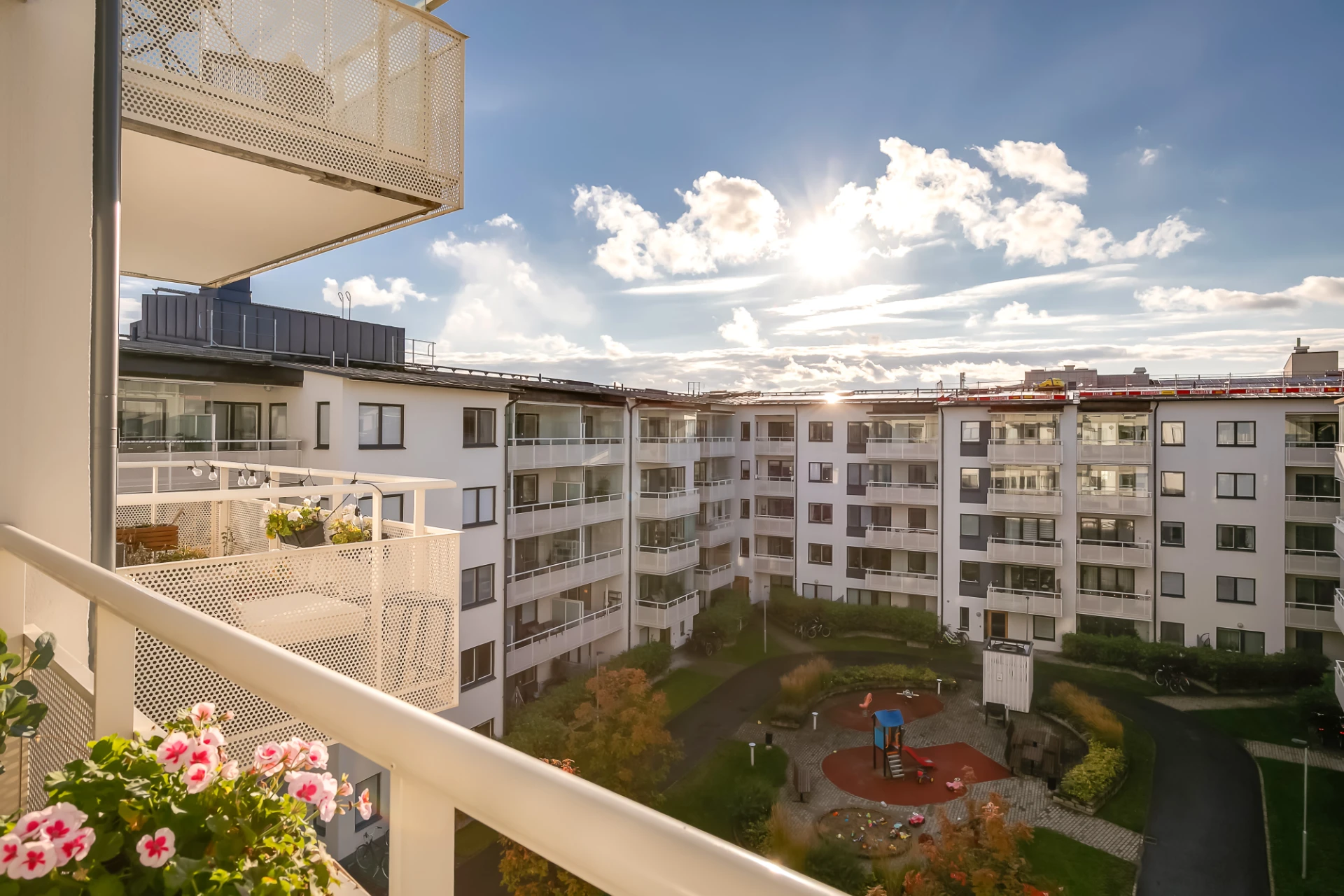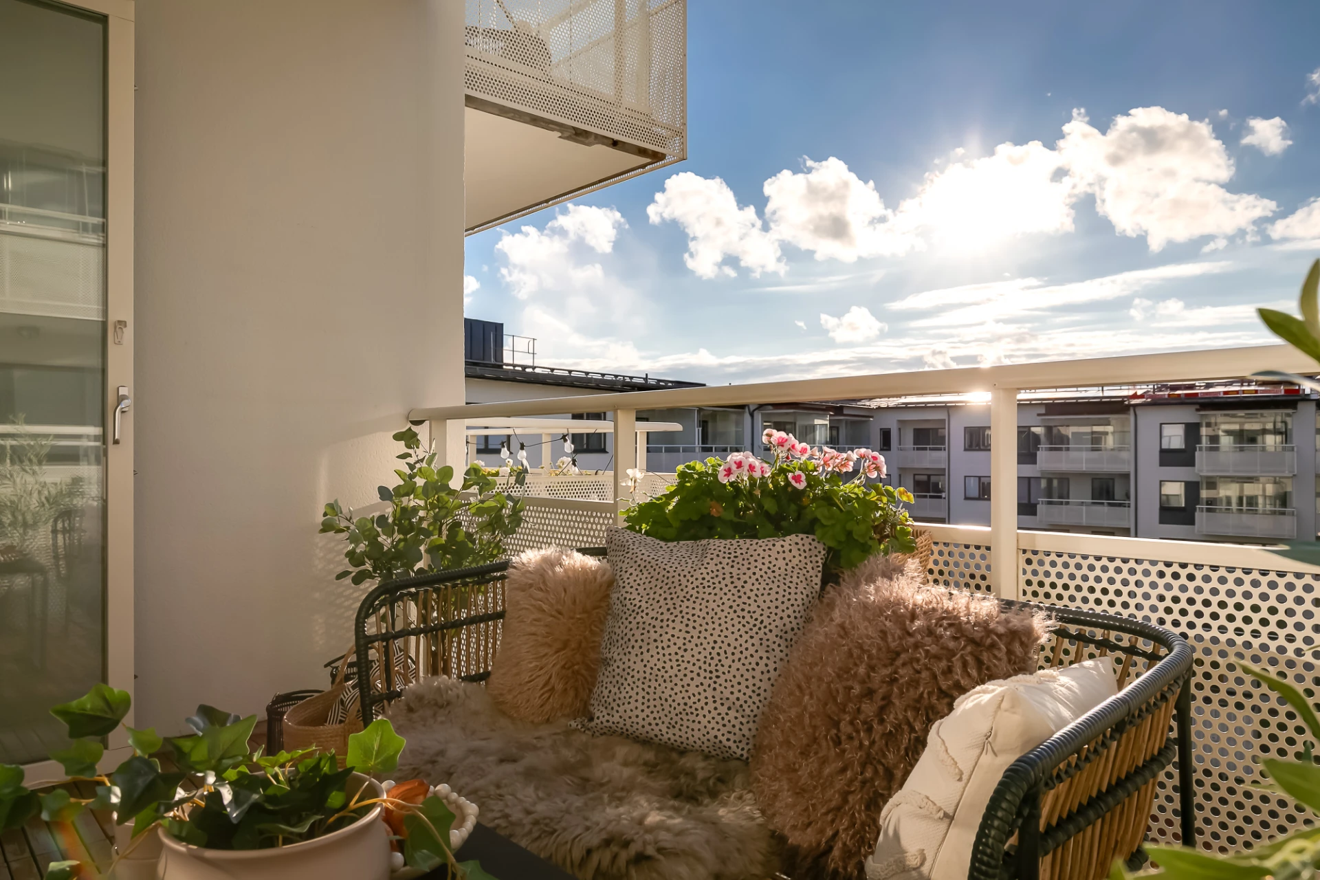 Social balkong om ca 8 kvm i väst med sol mellan ca kl.14-19. Räcke i vitlackad metall med perforerad täckfront och trätrall på betonggolv. Utrymme för planteringar och större utemöbler som balkongsoffa eller solsäng. Föreningen tillåter inglasning av balkong och montering av markis.