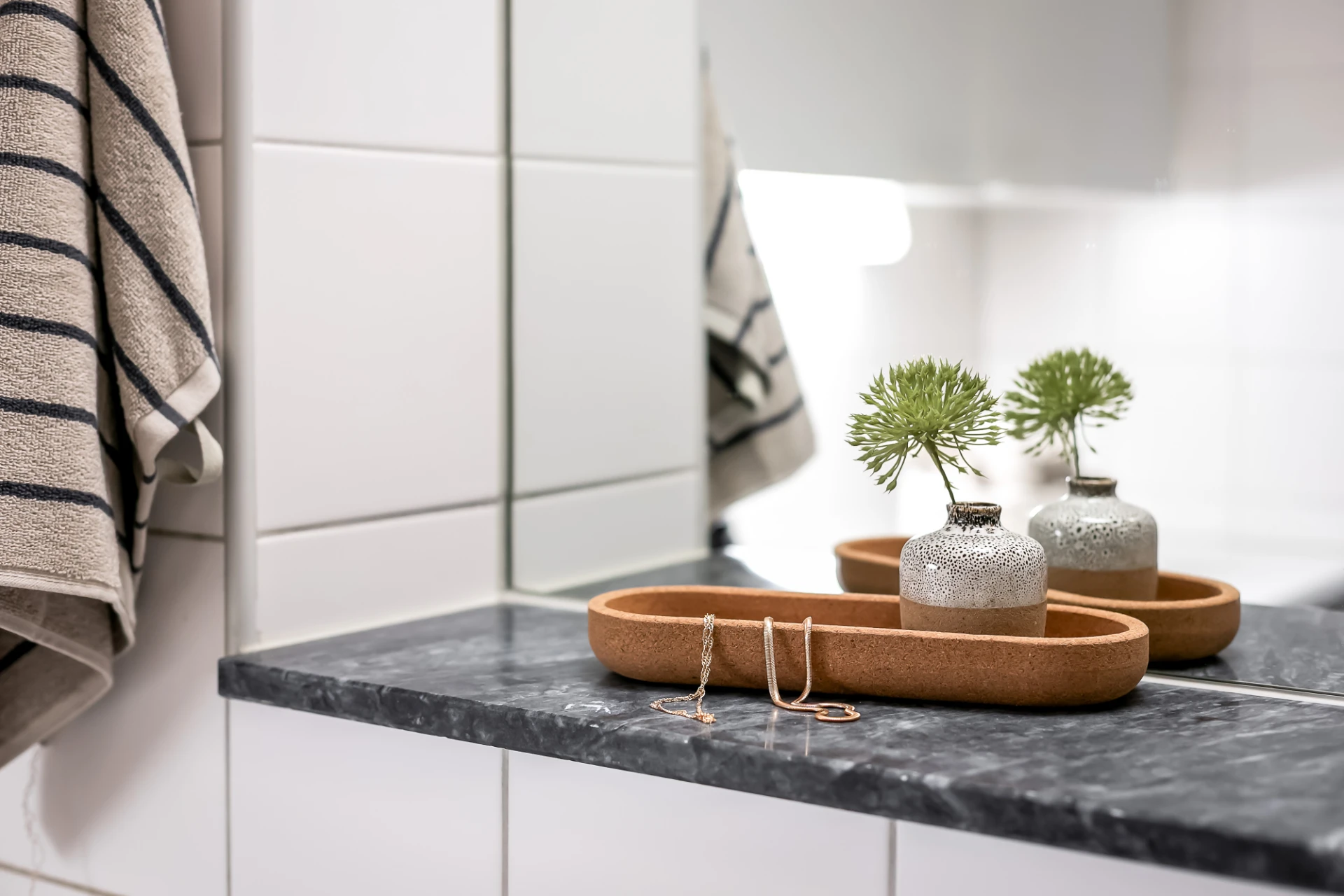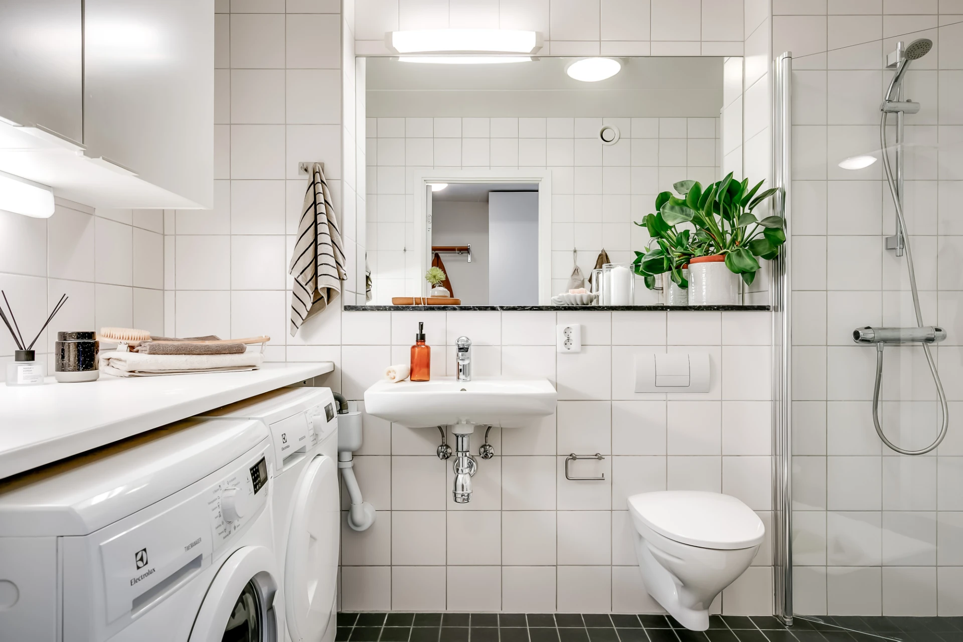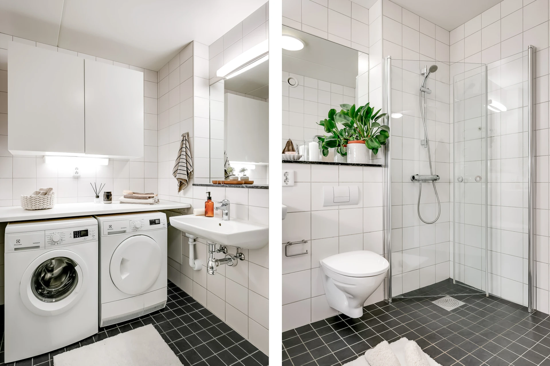 Vitt kakel på väggar och svart klinkergolv. Stor spegel med ovanbelysning och avställningshylla i mörkgråmelerad sten, infälld i nisch bakom vägghängd toalett. Handfat, kroklist, krokar, toalettpappershållare och takplafond. Duschhörn med handdusch och två raka svängbara glasdörrar. Tvättmaskin och torktumlare under arbetsbänk i laminat samt överskåp med släta luckor och belysning undertill.