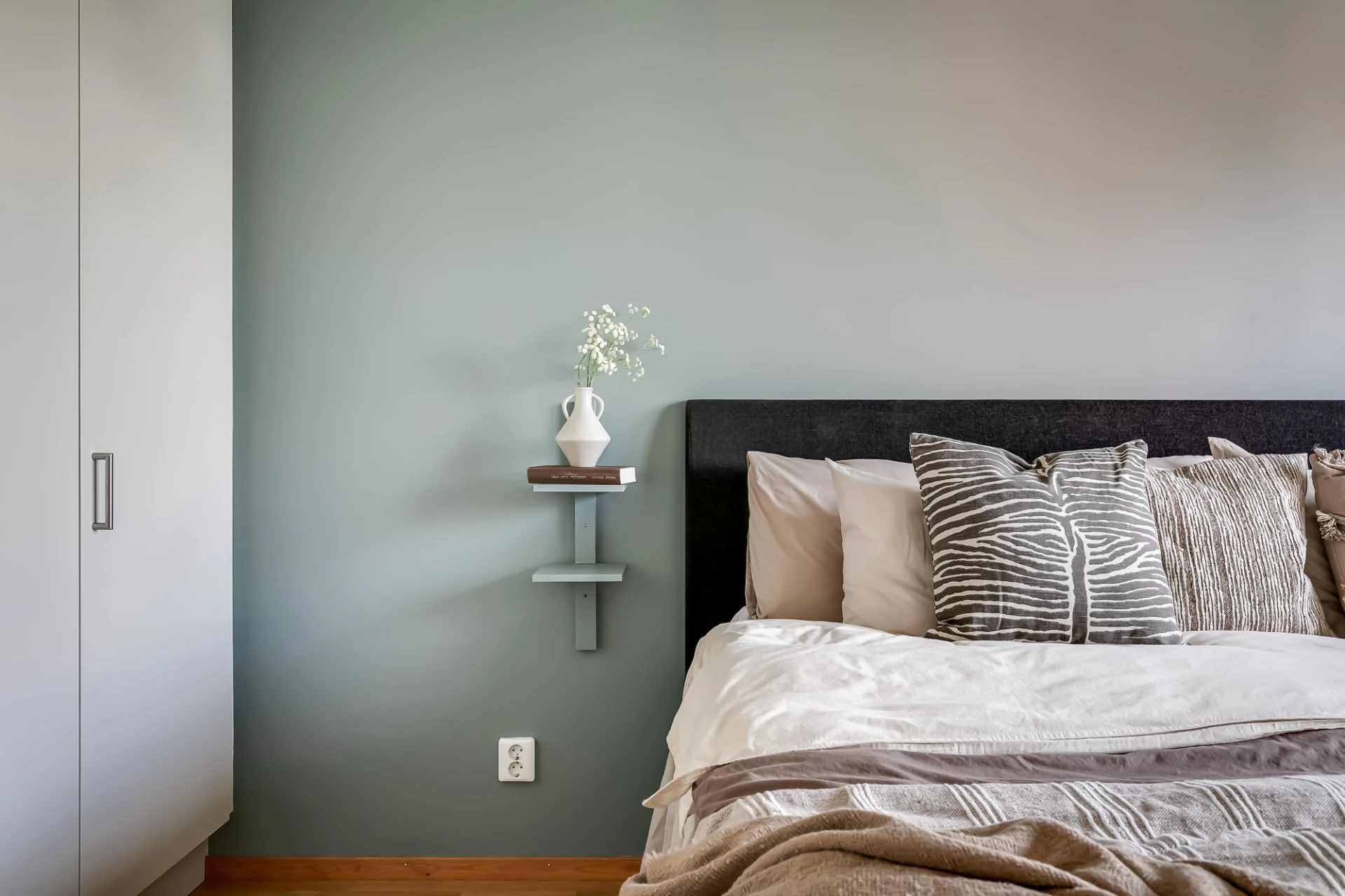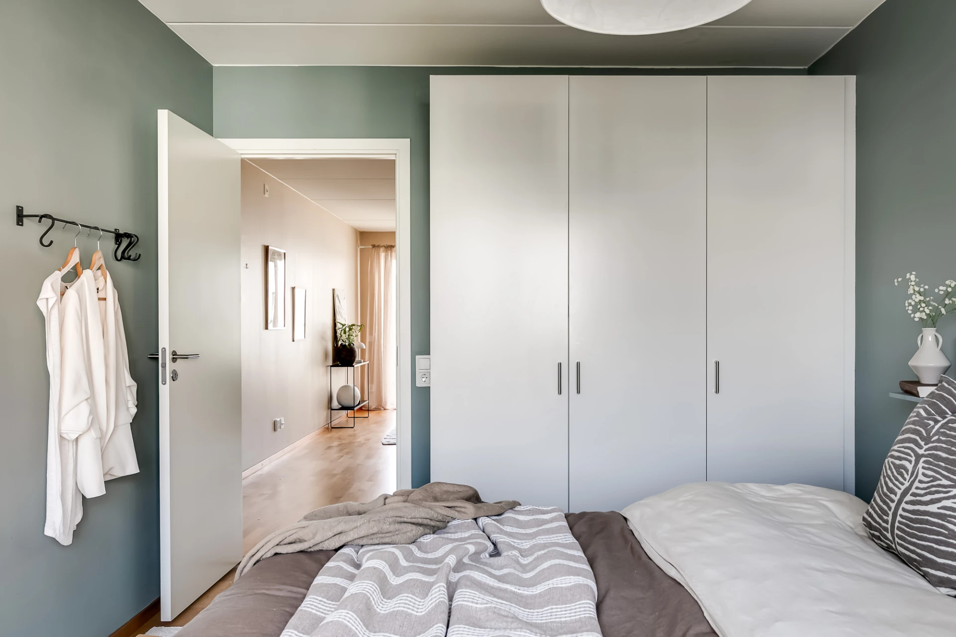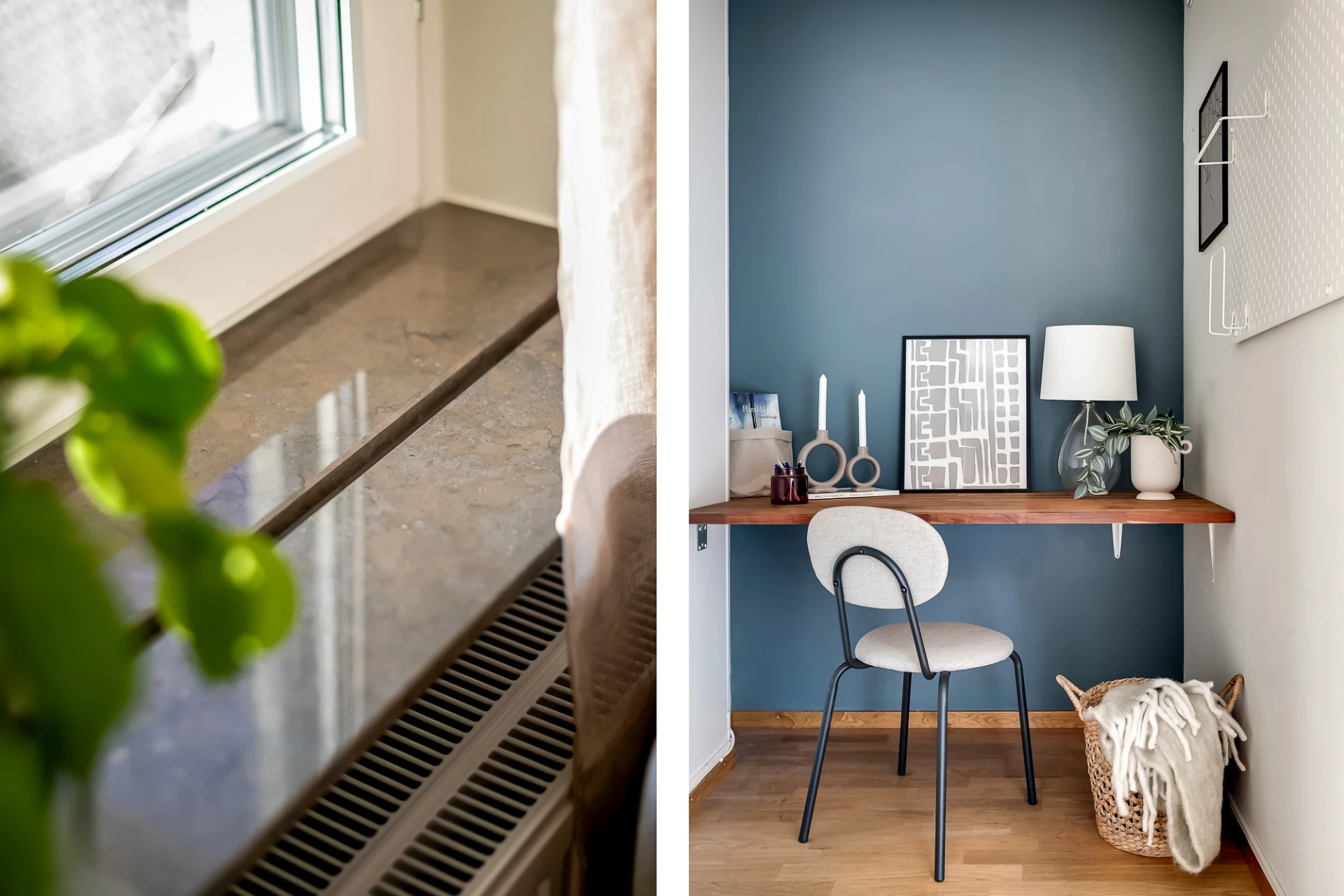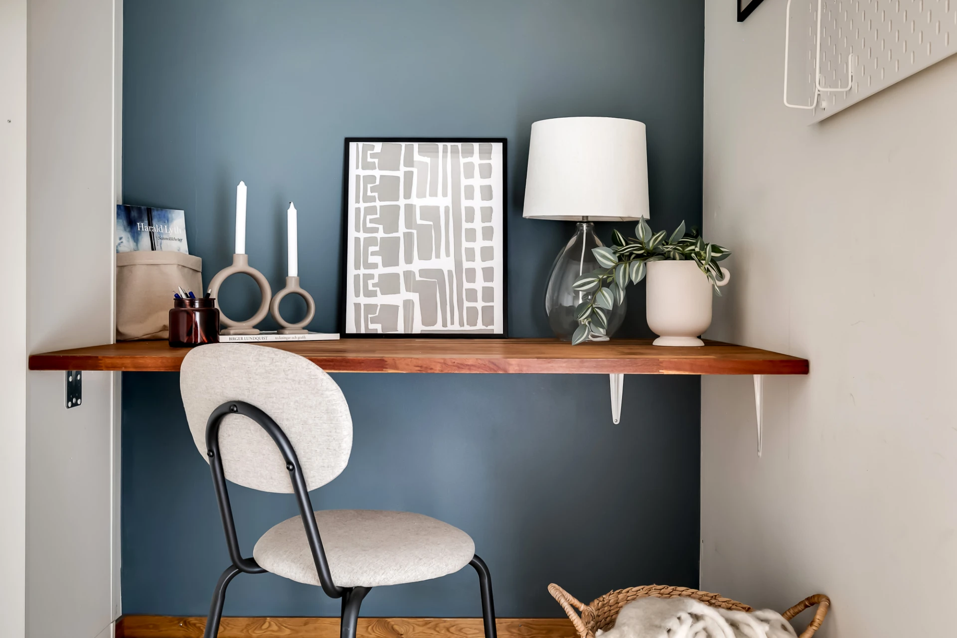Kan användas som kontor eller enkelt återställas till klädkammare. Väggmonterad bänkskiva i trä samt väggar i vitt utöver en gråblå fondvägg.